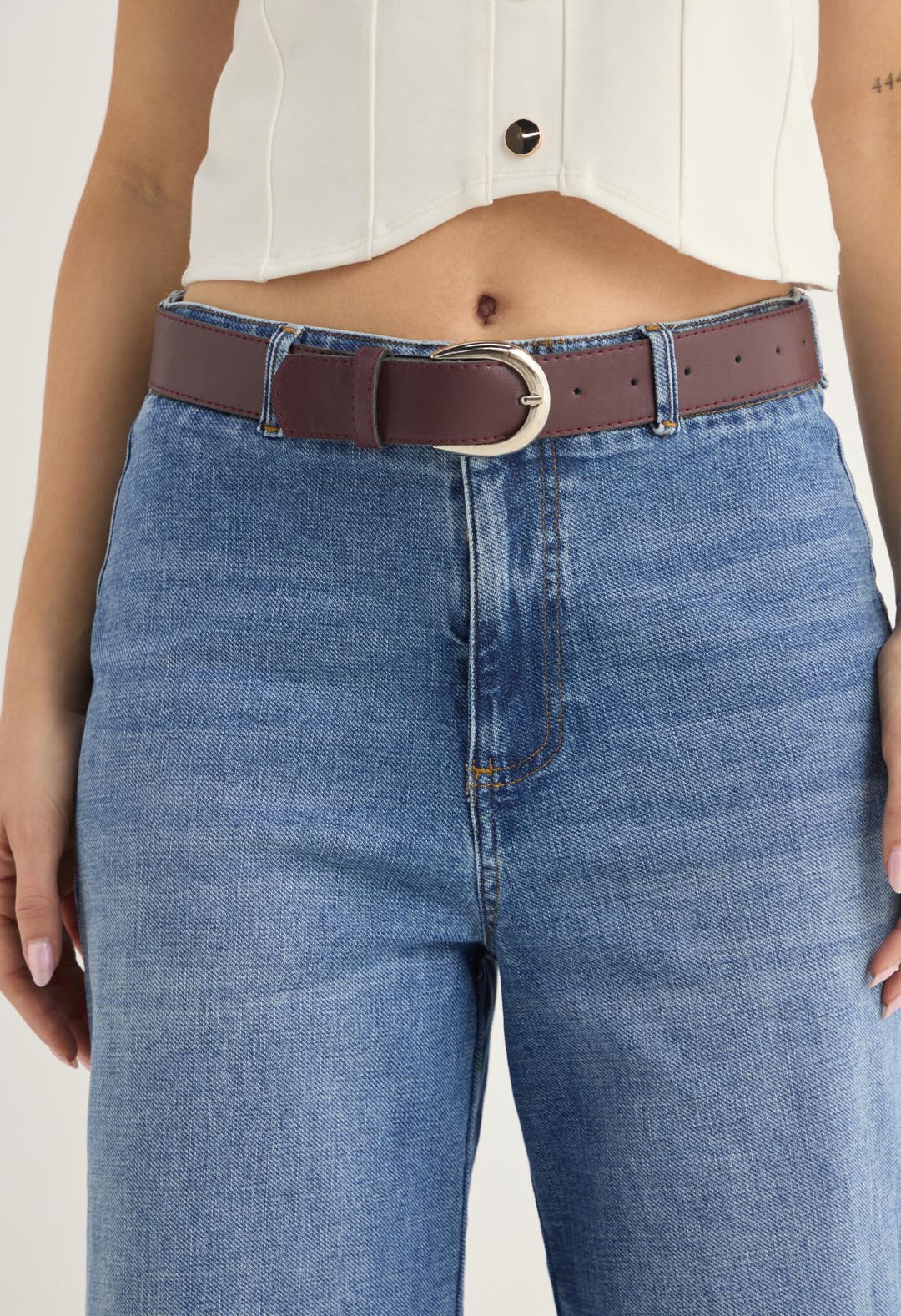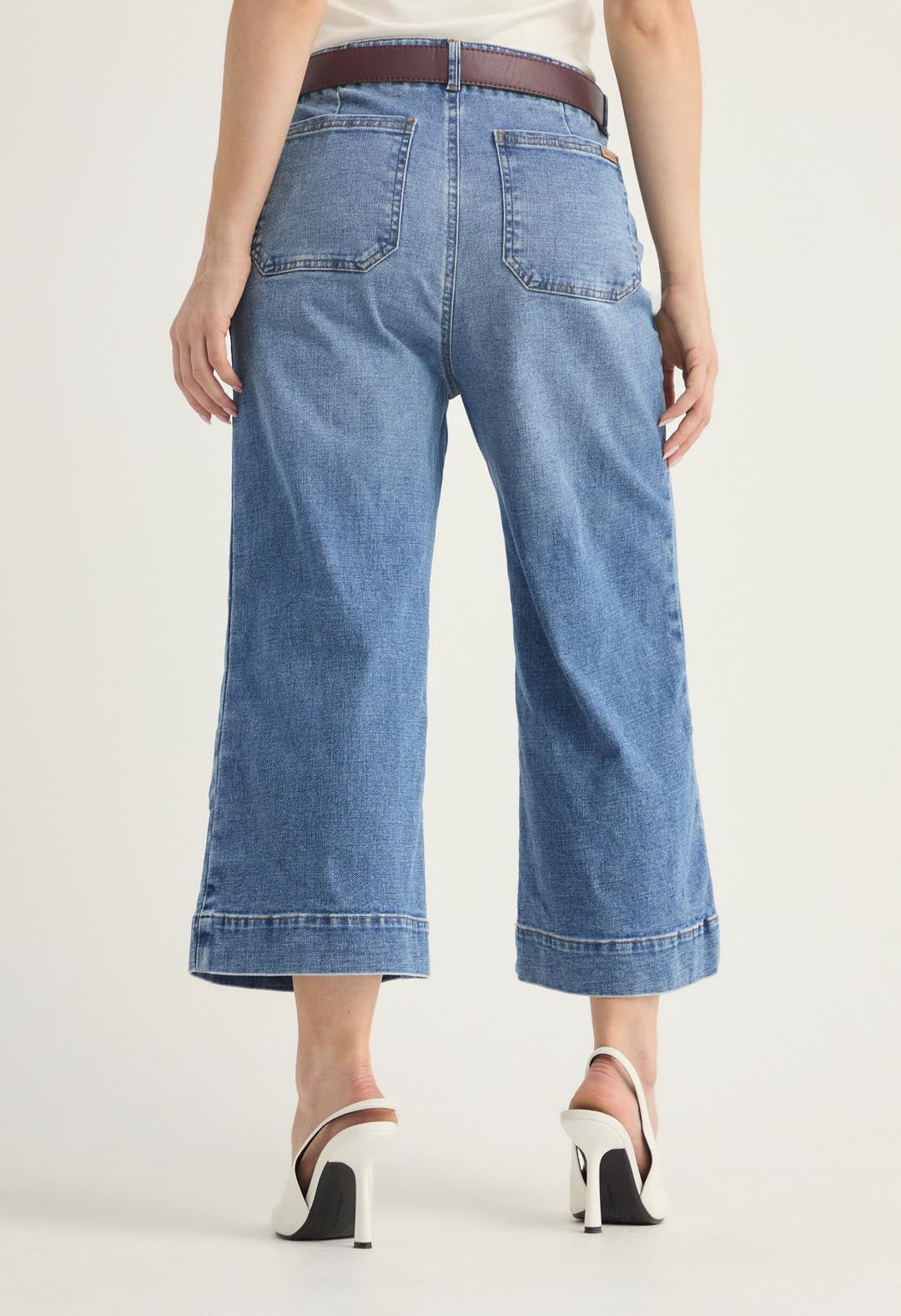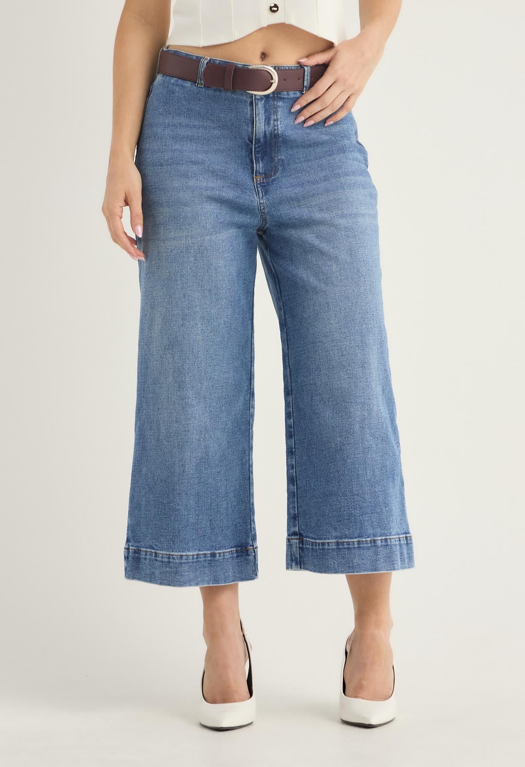 Jean culotte tiro alto, lavado medio, fondo entero y con correa para mujer.