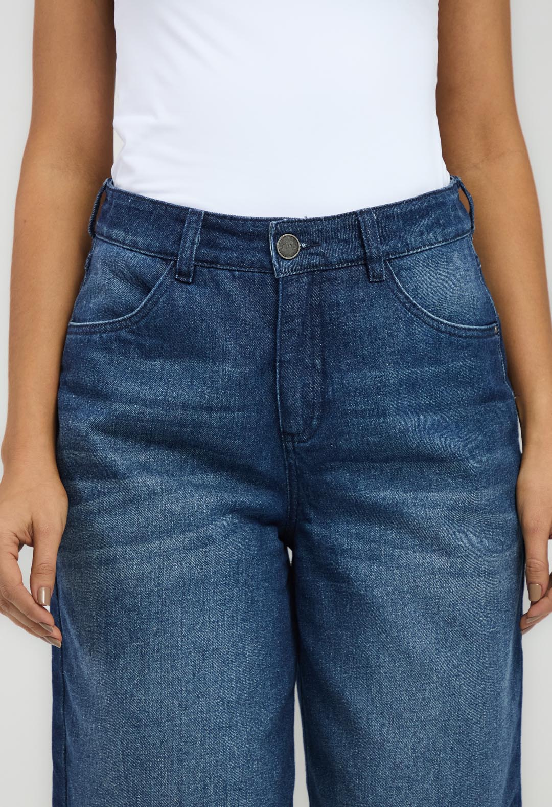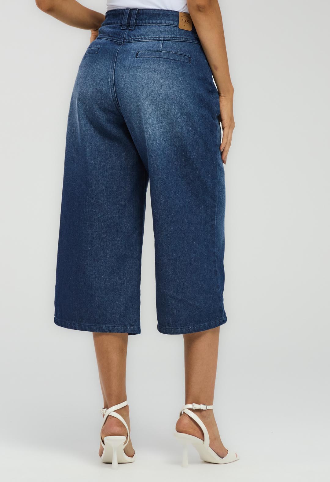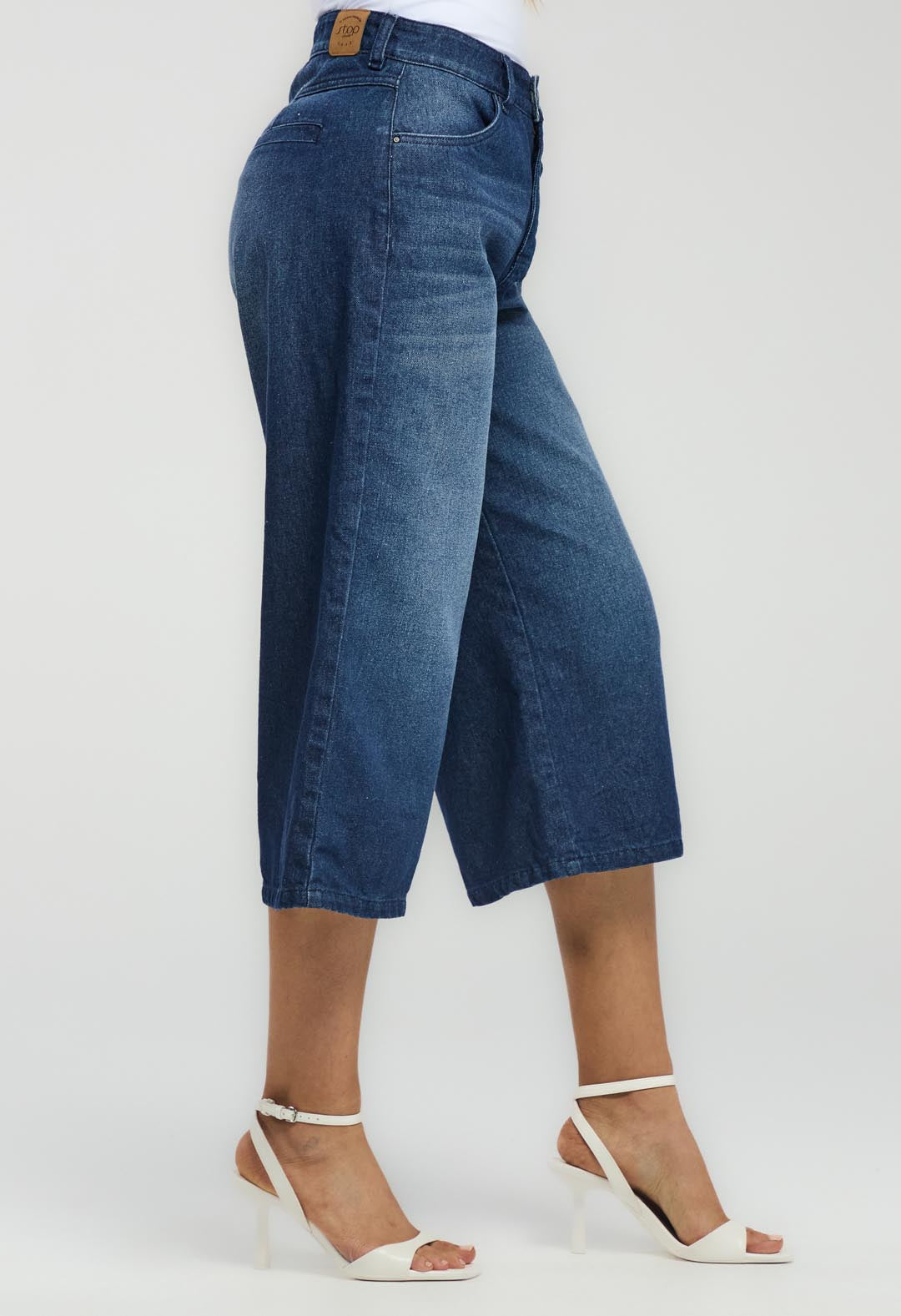 Jean culotte tiro alto, lavado oscuro, en denim, bota amplia y fondo entero para mujeres.
