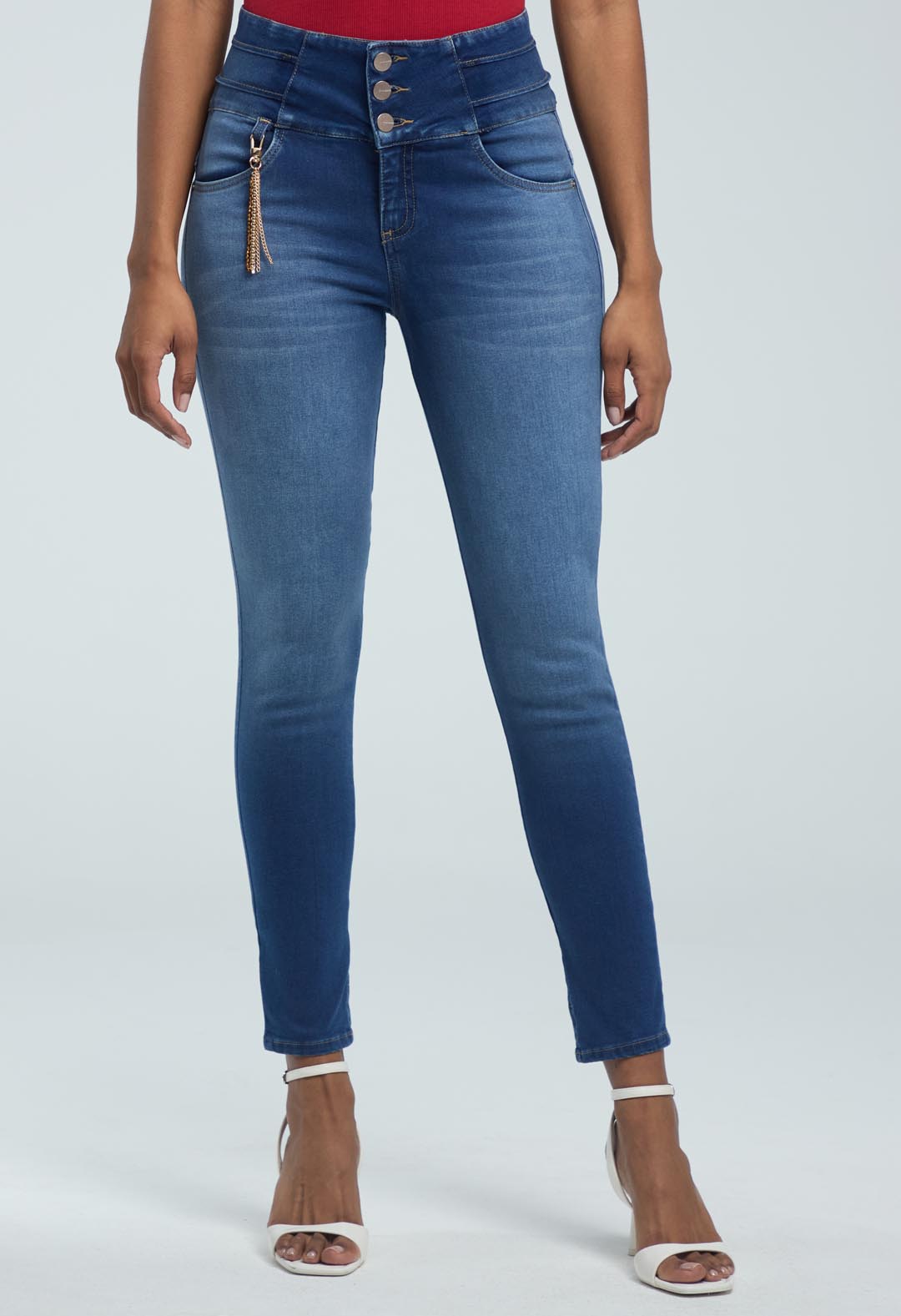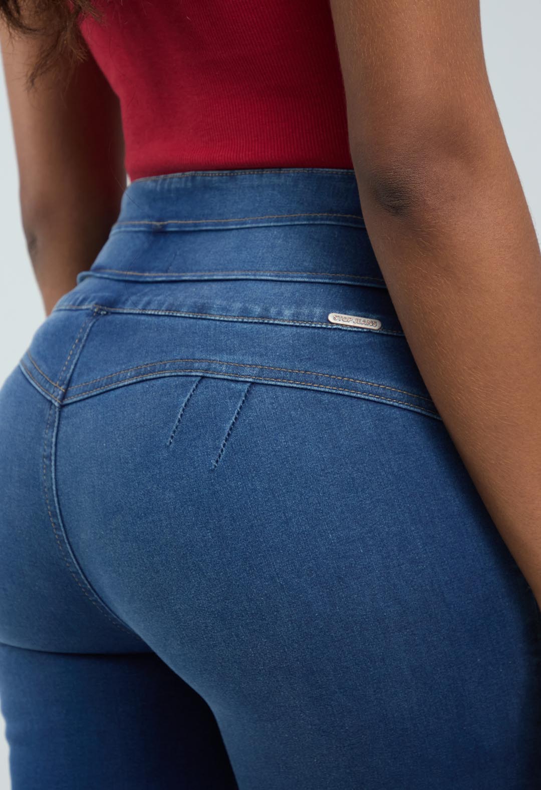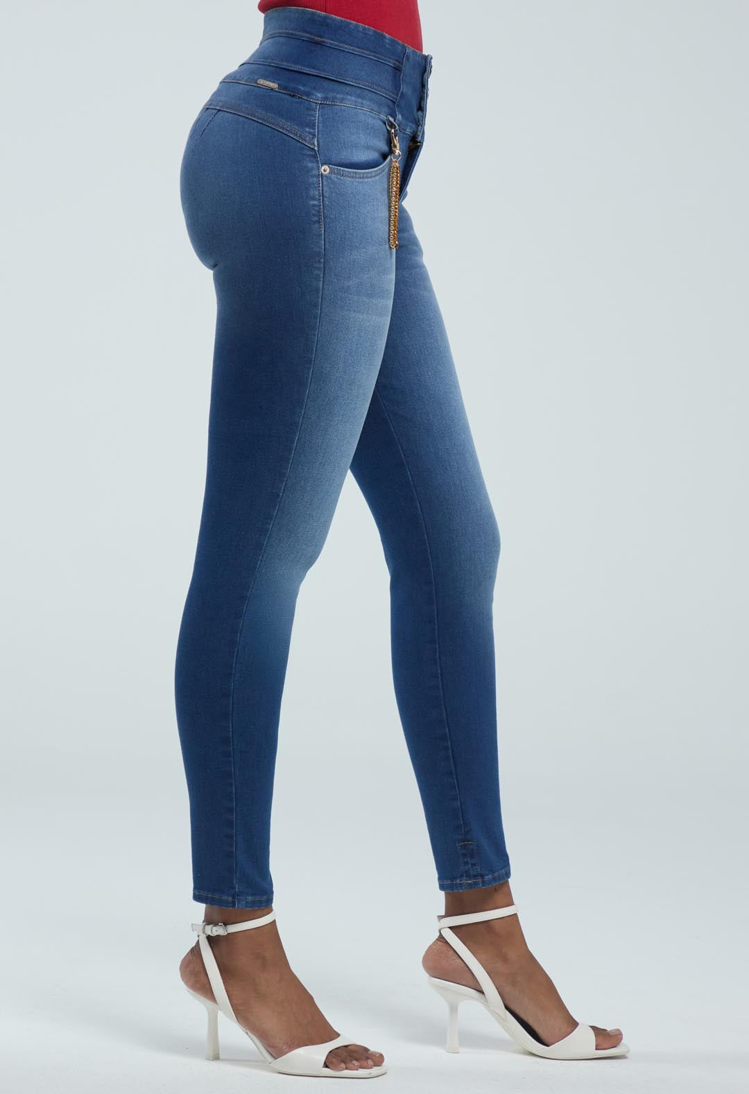Jean escultor, lavado medio, con accesorios, pretina ancha y fondo entero para mujeres.