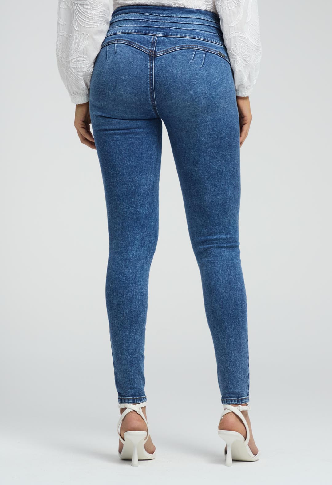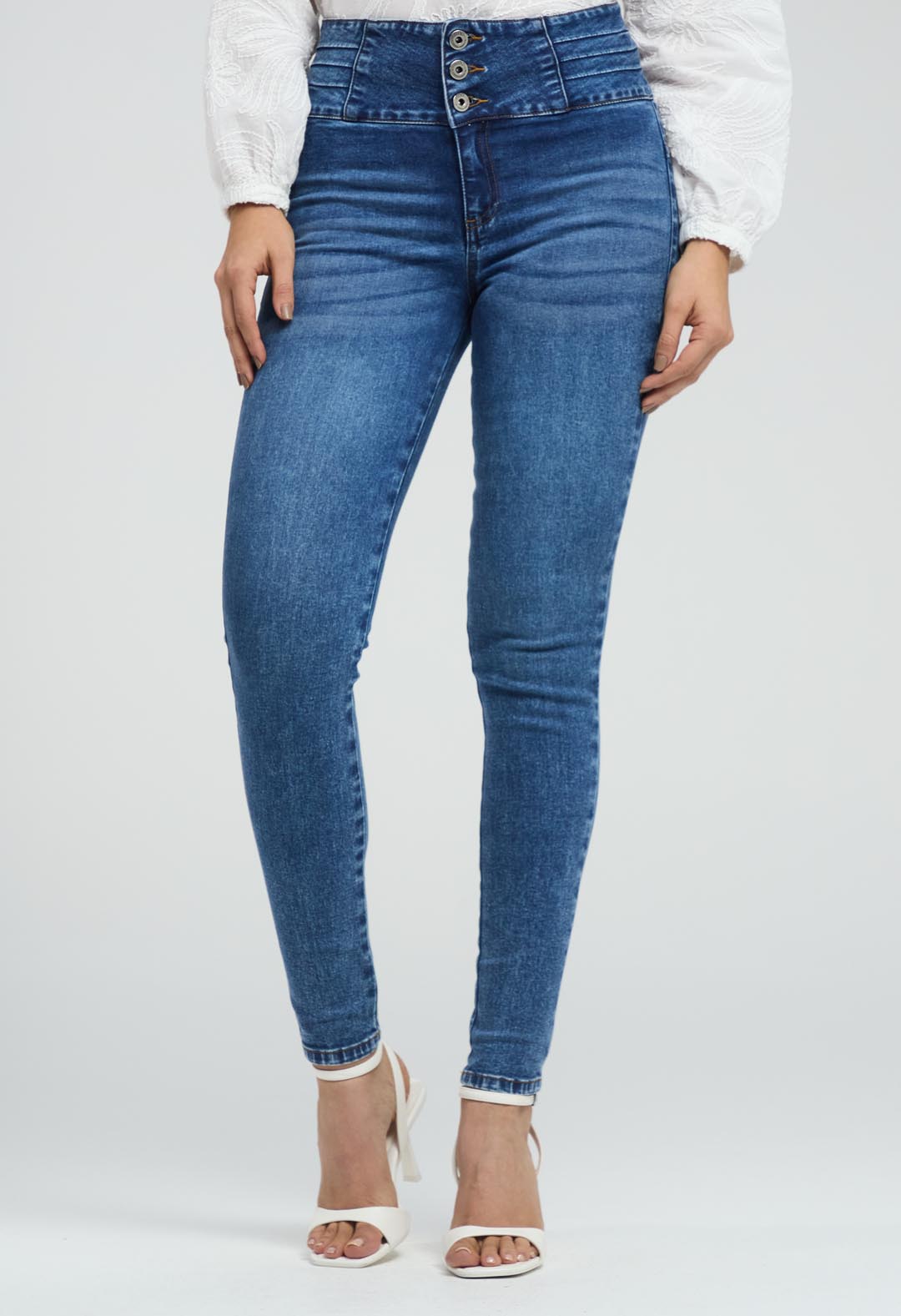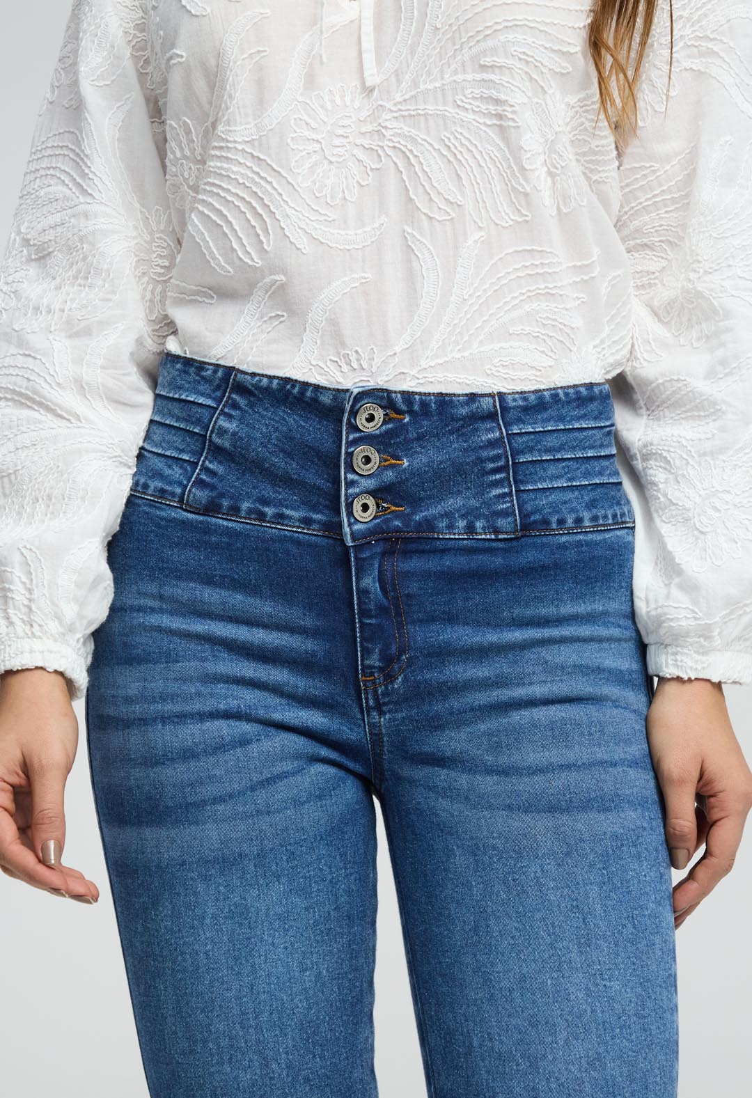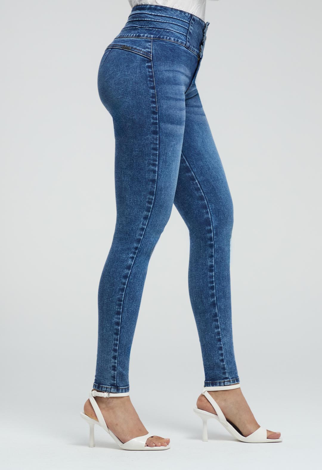 Jean escultor, tiro alto, lavado medio, sin bolsillos, pretina con diseño y fondo entero para mujeres.