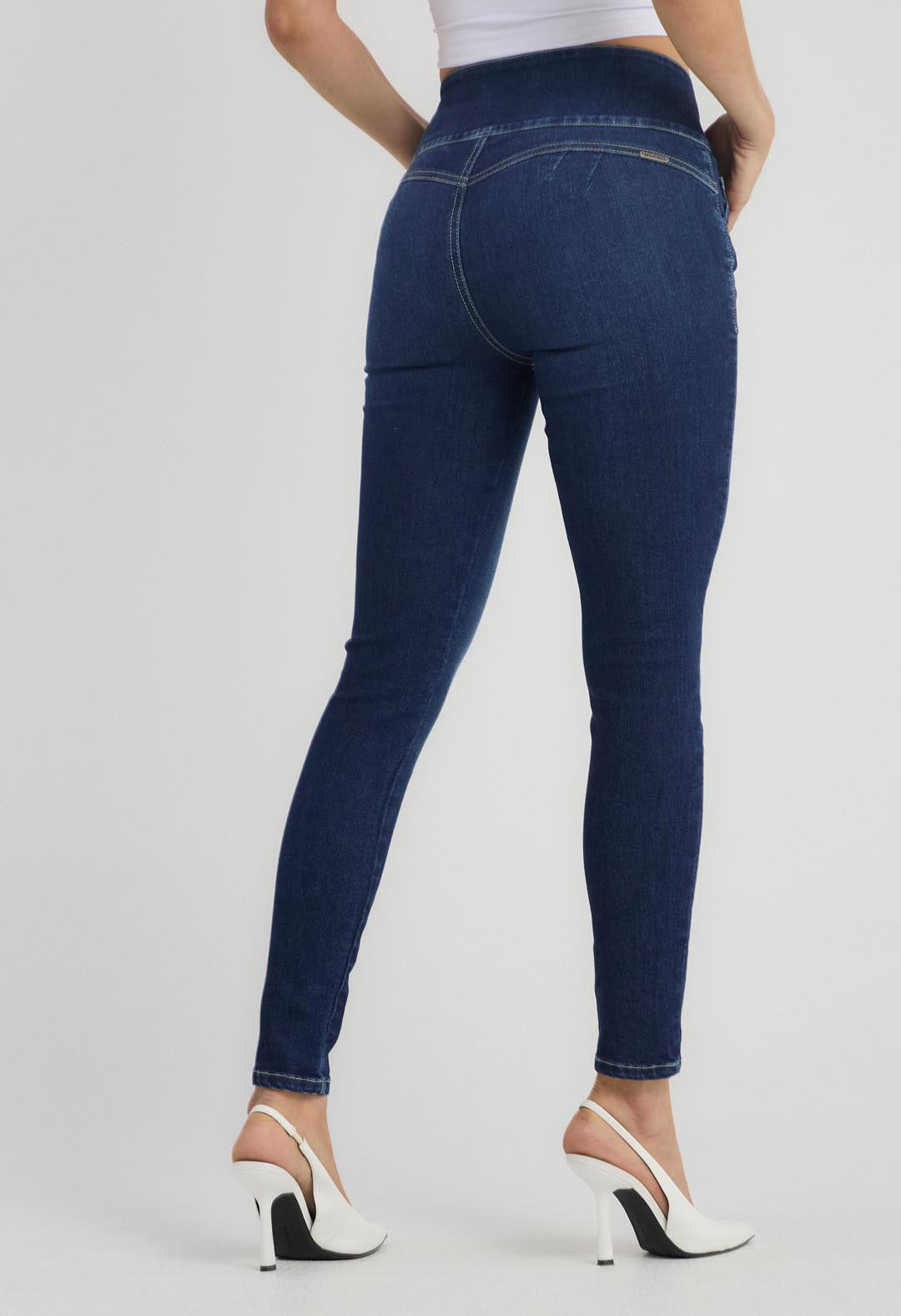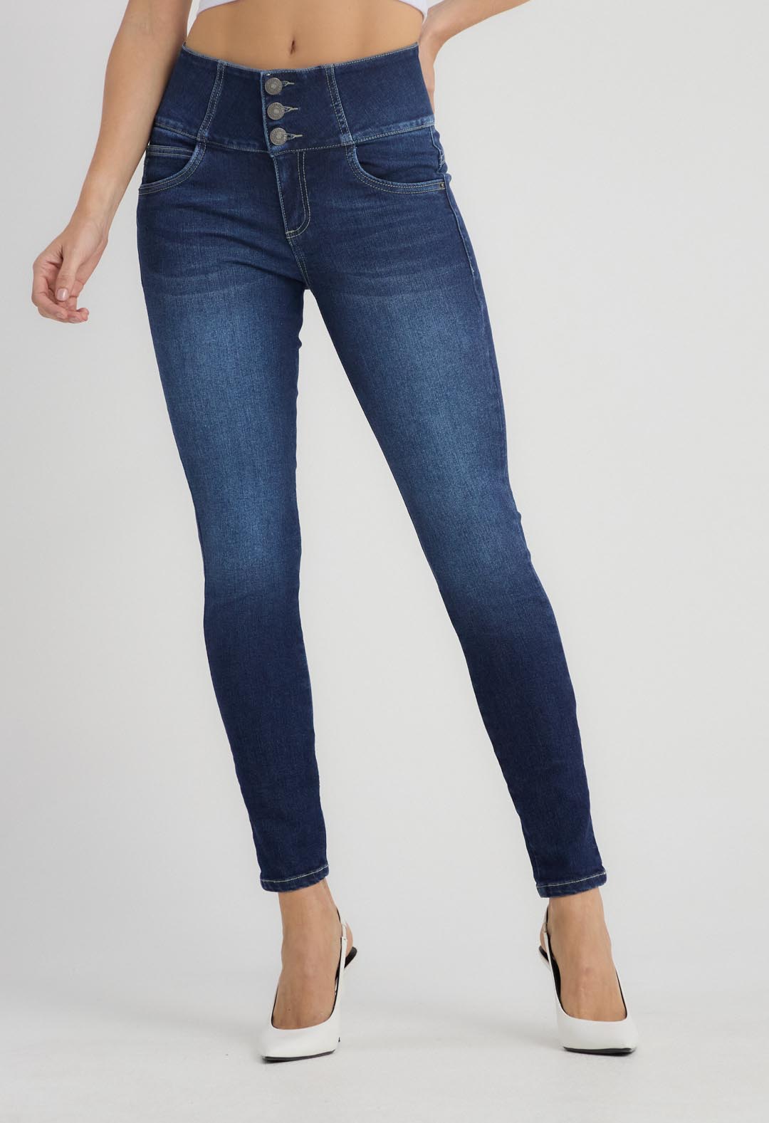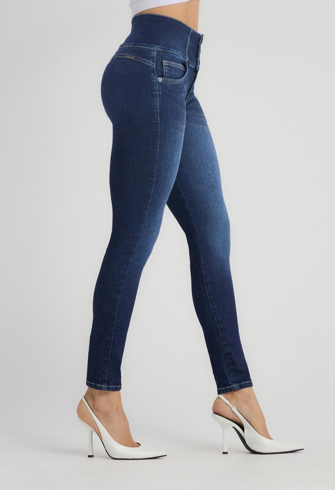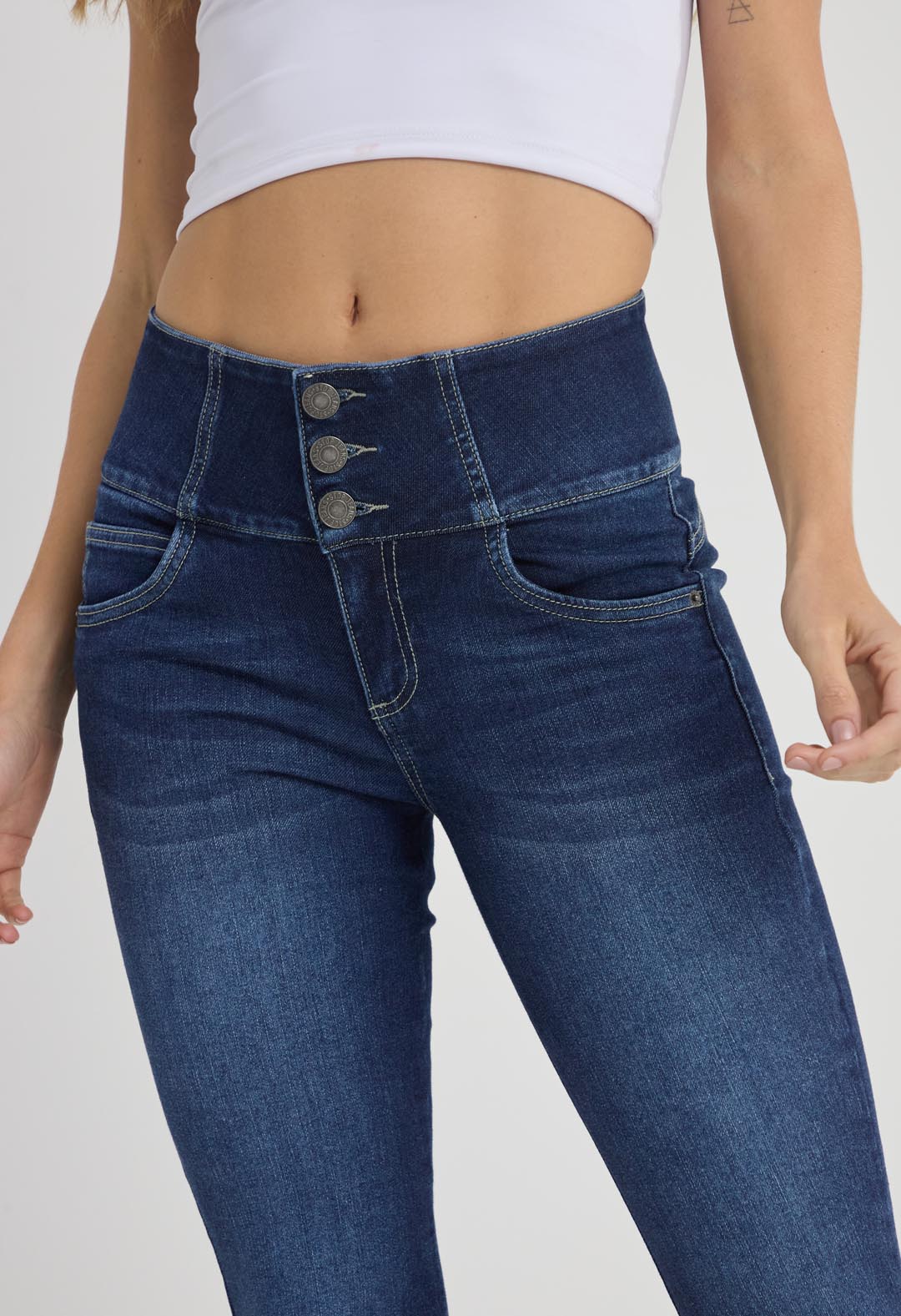 Jean escultor, tiro alto, lavado medio oscuro, bota tubo y fondo entero para mujer.