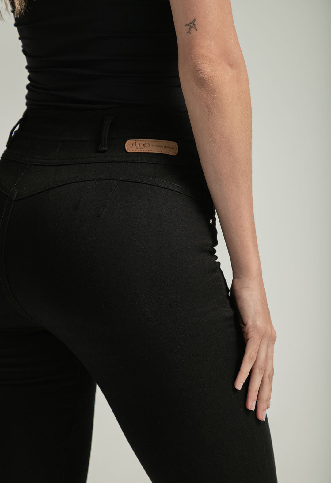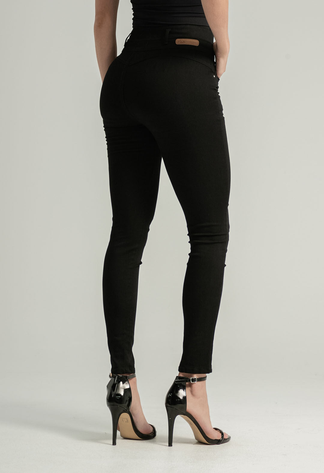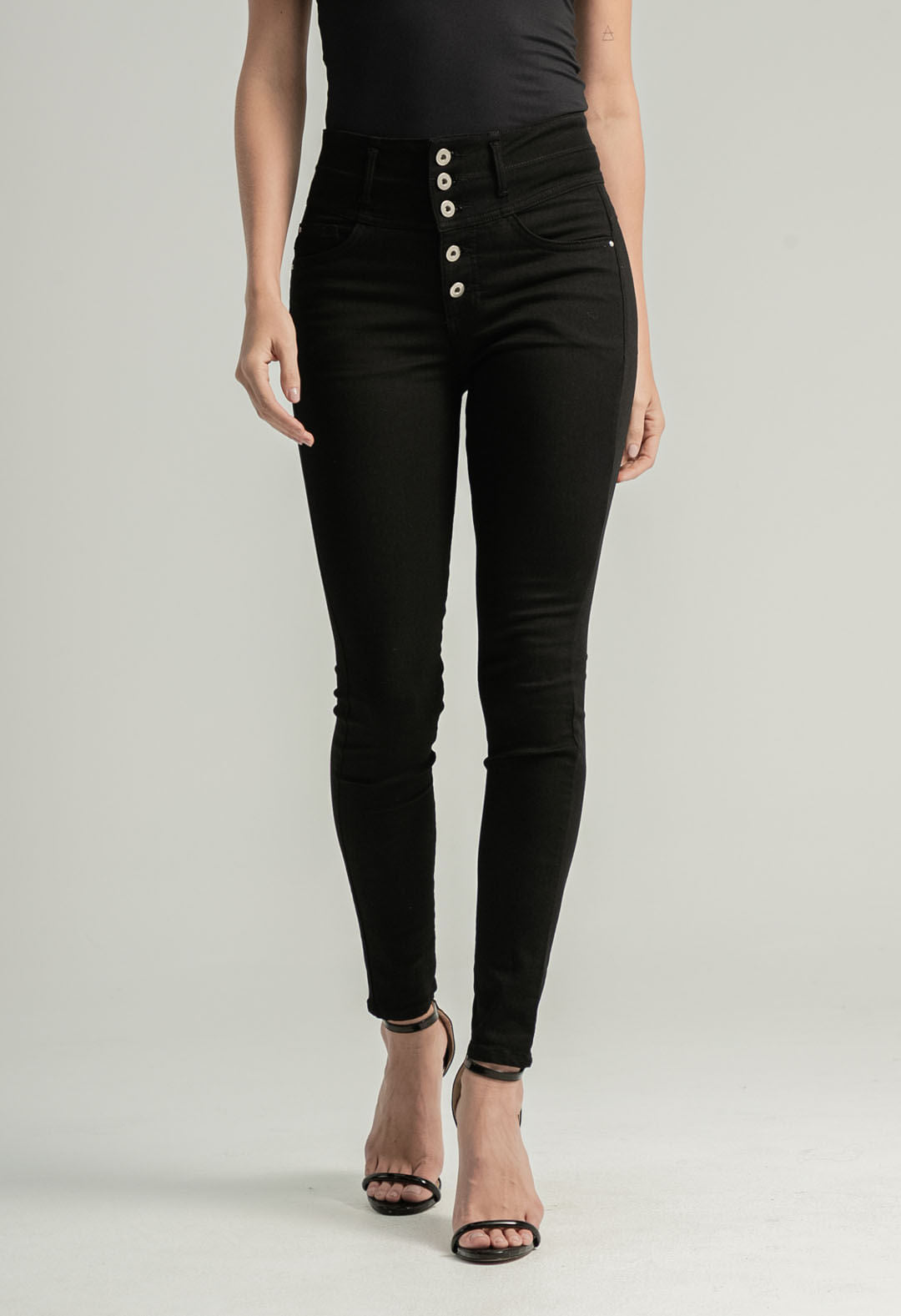 Jean escultor, tiro alto, lavado negro, pretina alta, bolsillos delanteros funcionales y botones para mujeres.