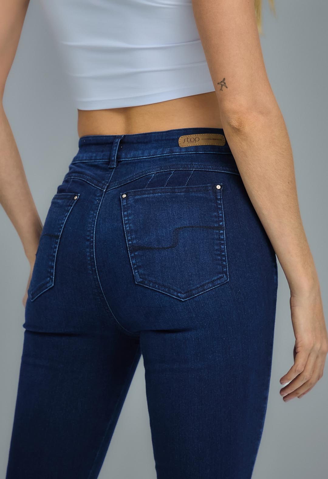 Jean levantacola, tiro alto, lavado oscuro, bota recta y bolsillos funcionales para mujeres.
