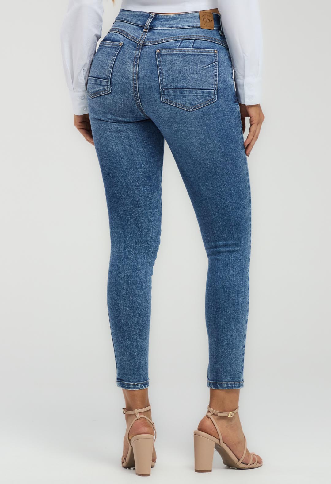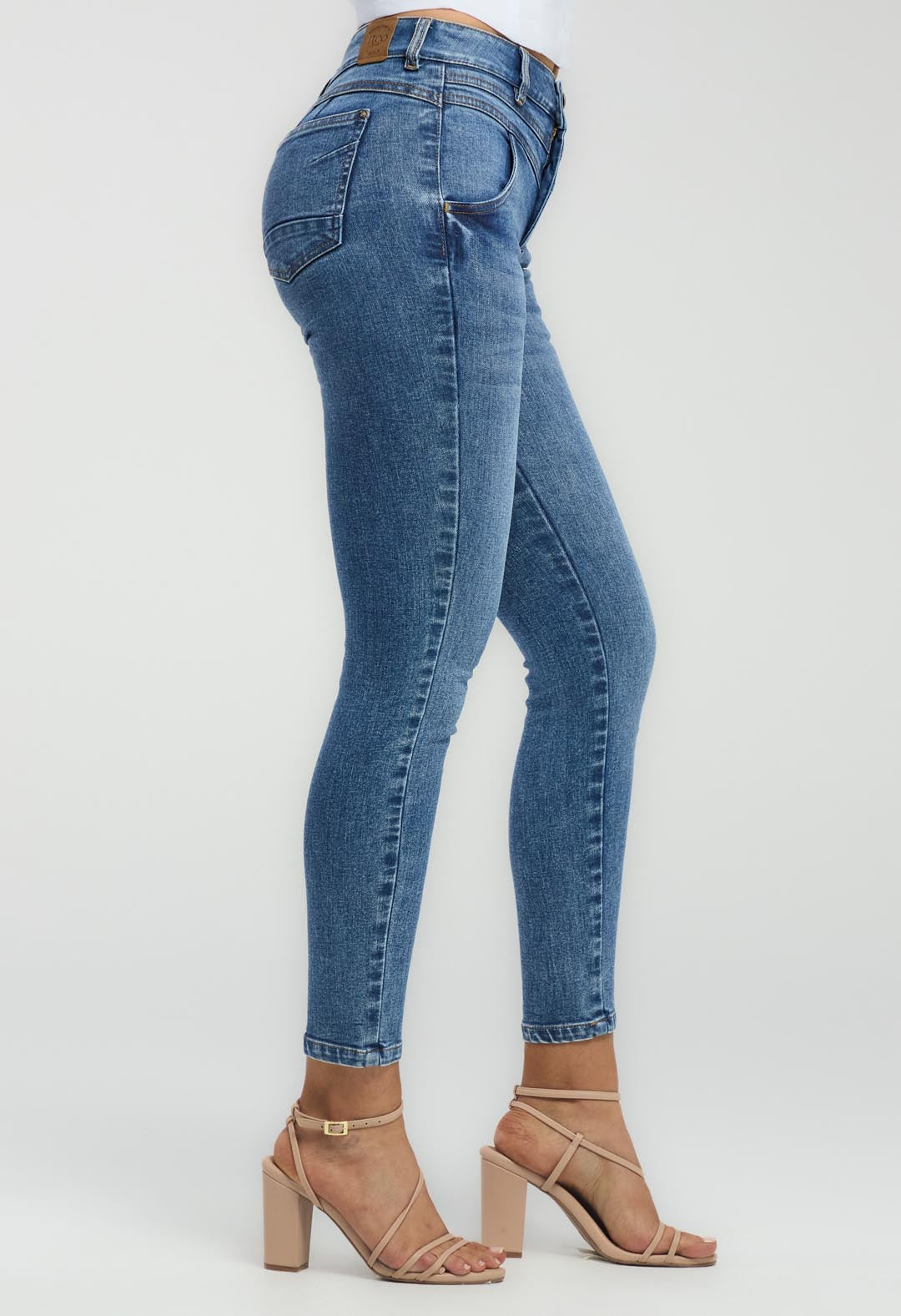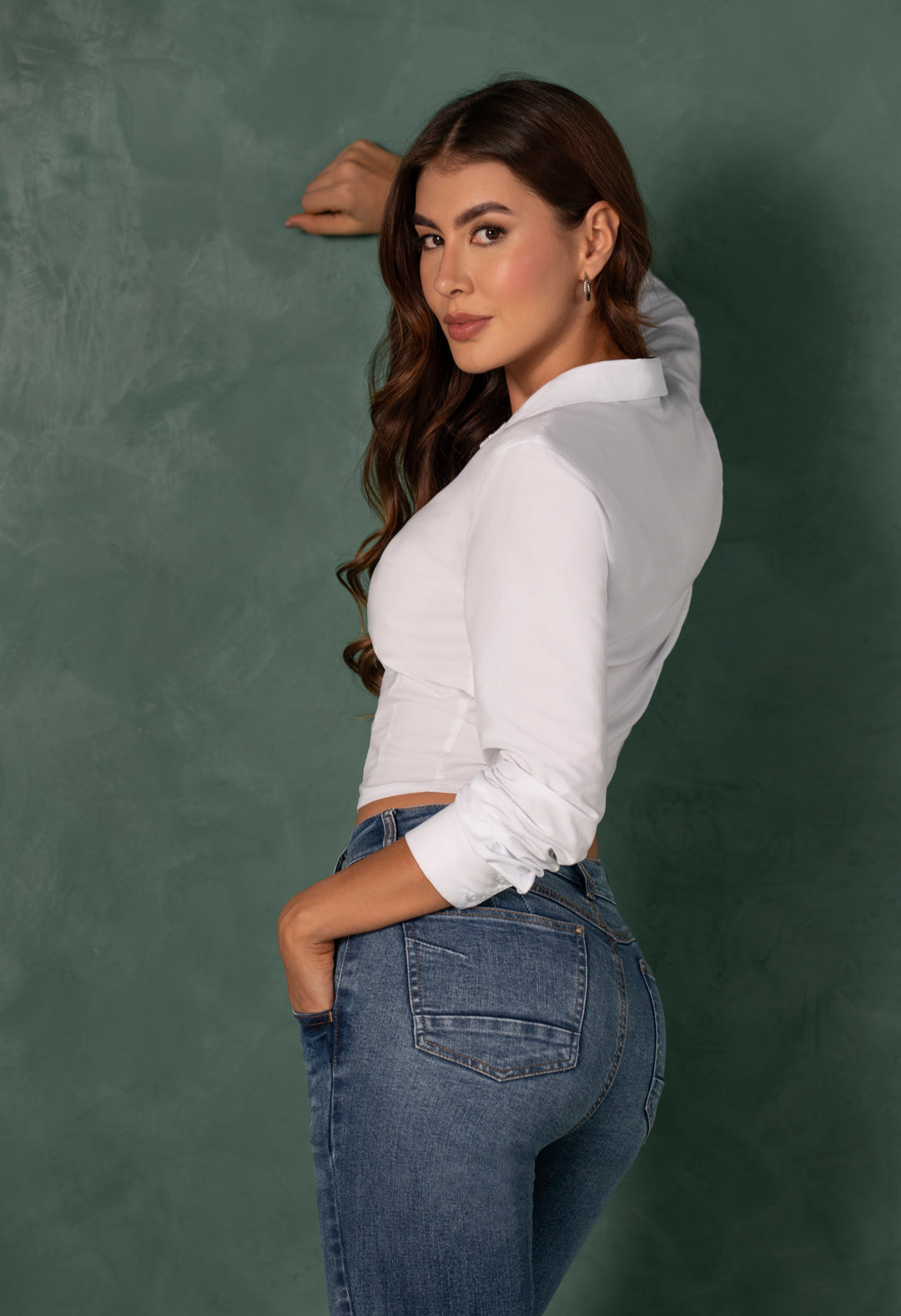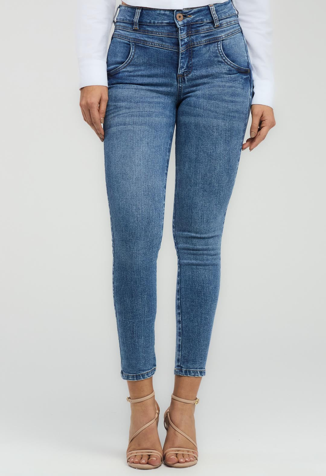 Jean levantacola, tiro alto, lavado medio, cortes en frente y bota tubo para mujeres.