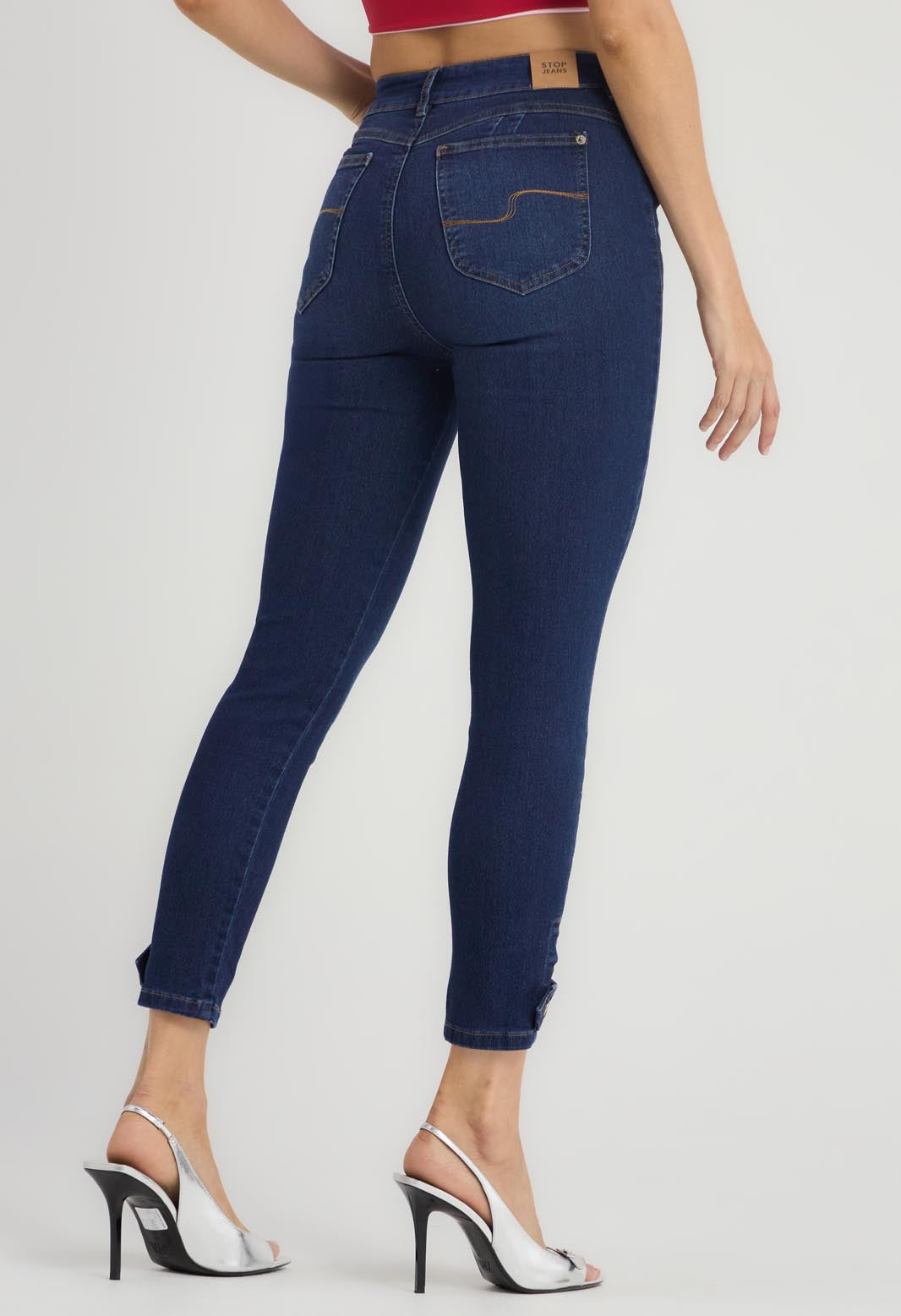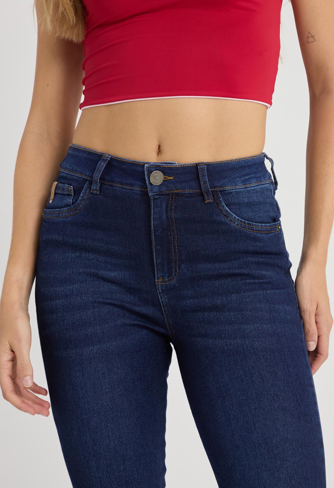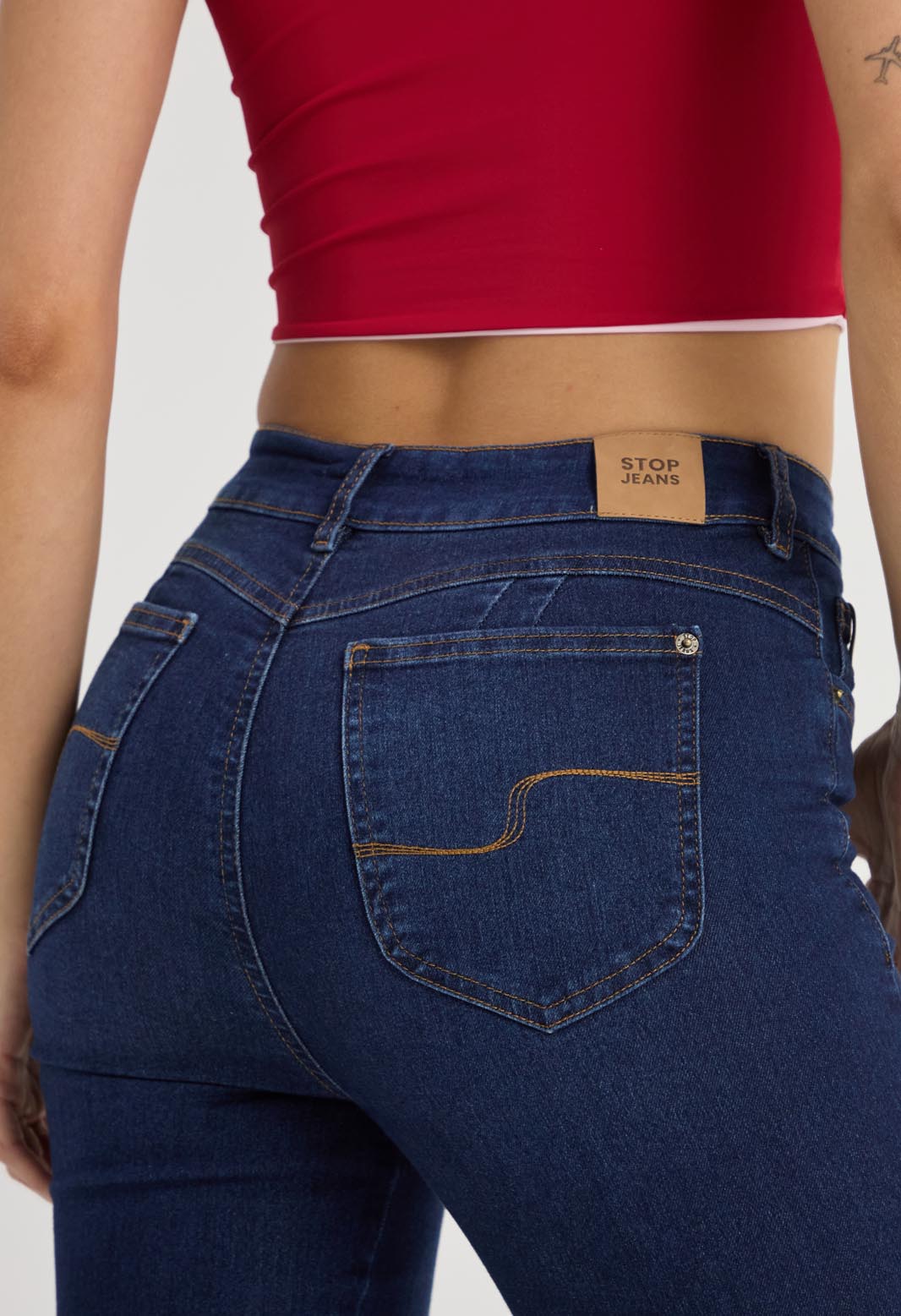 Jean levantacola, tiro alto, lavado medio, detalle en bota y fondo entero para mujeres.