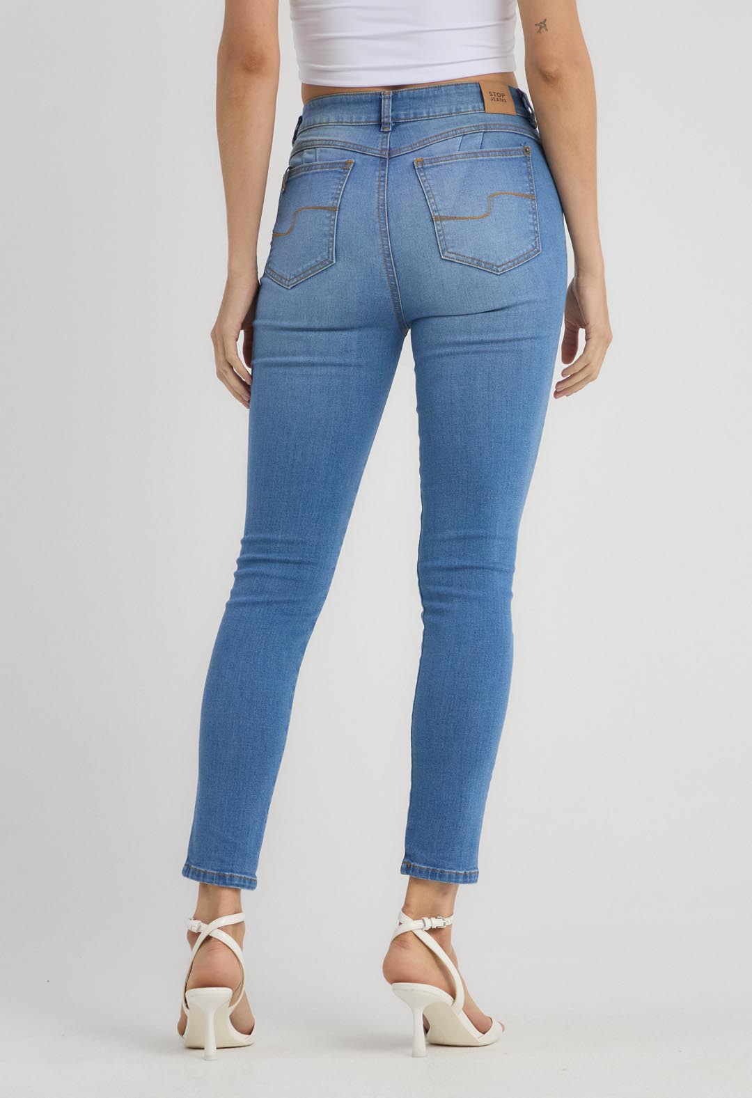Jean levantacola, tiro alto, lavado medio, con detalle en pretina, fondo entero, pinzas en posterior y bolsillos para mujer.
