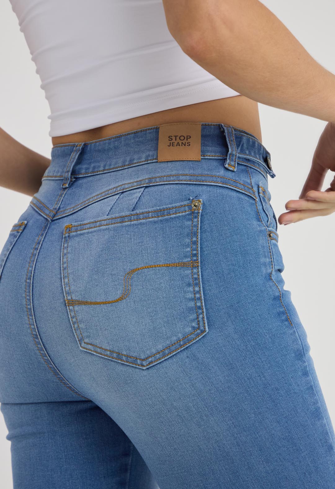 Jean levantacola medio con detalle en pretina para mujer.