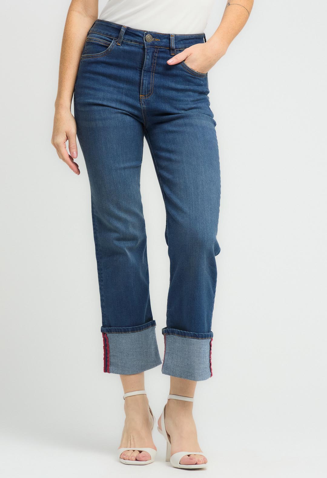 Jean levantacola medio oscuro con bota doblada para mujeres.