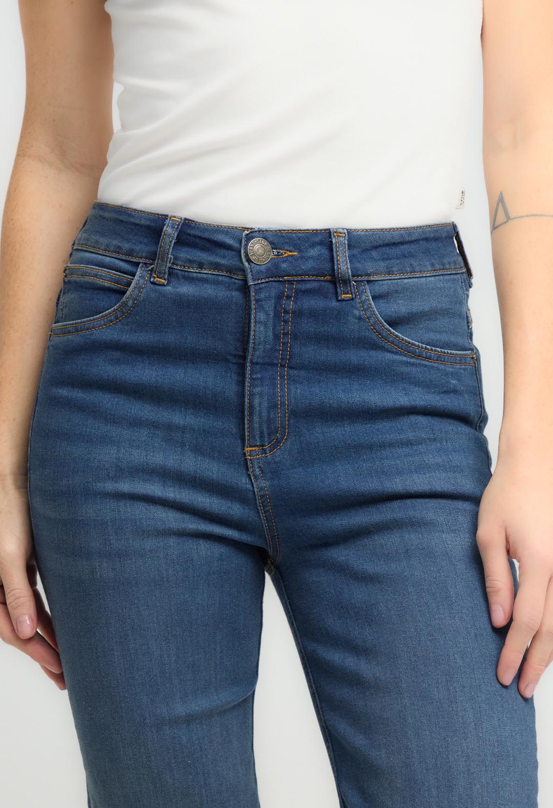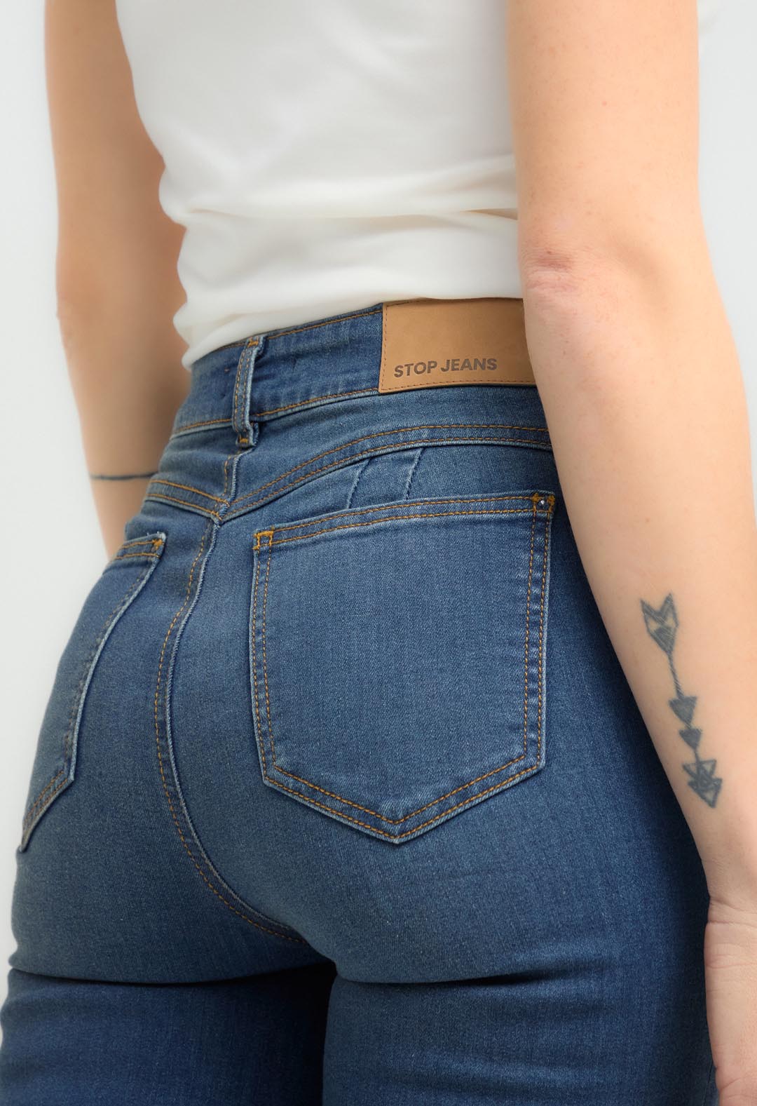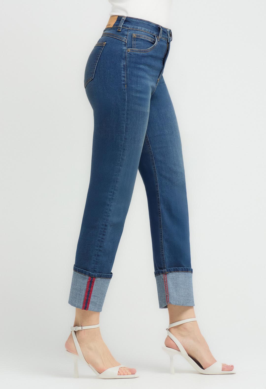 Jean levantacola, tiro alto, lavado medio oscuro, bolsillos funcionales, bota doblada y fondo entero para mujeres.