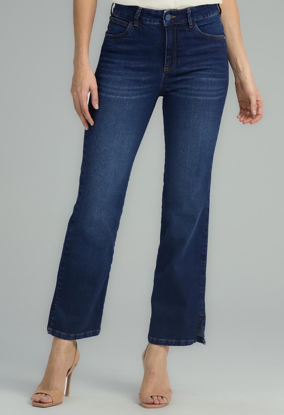 Jean levantacola oscuro con abertura en bota para mujeres.