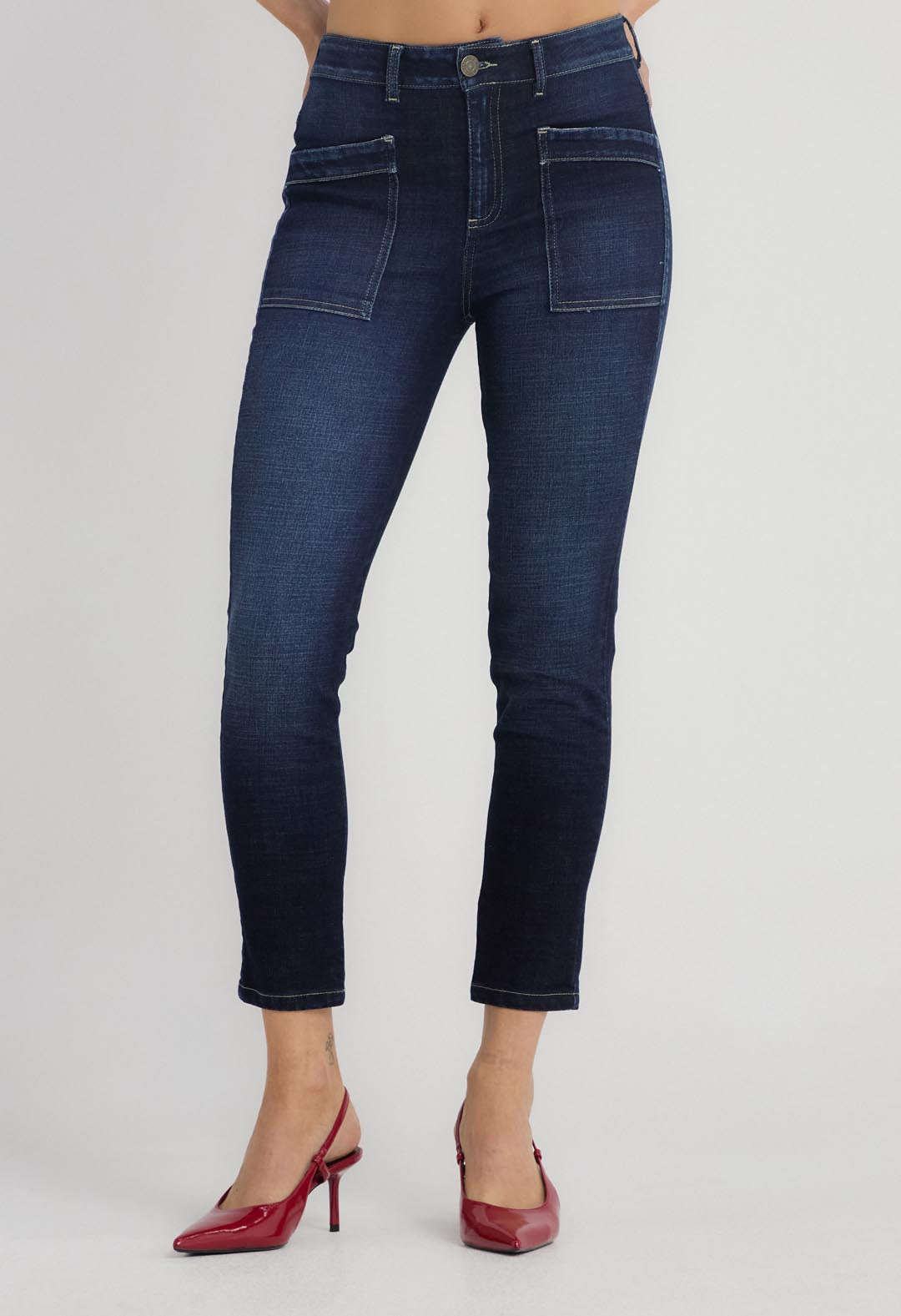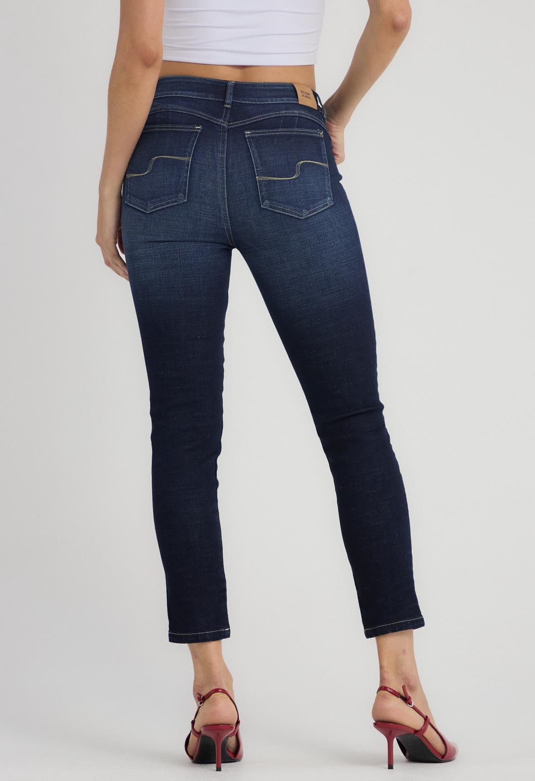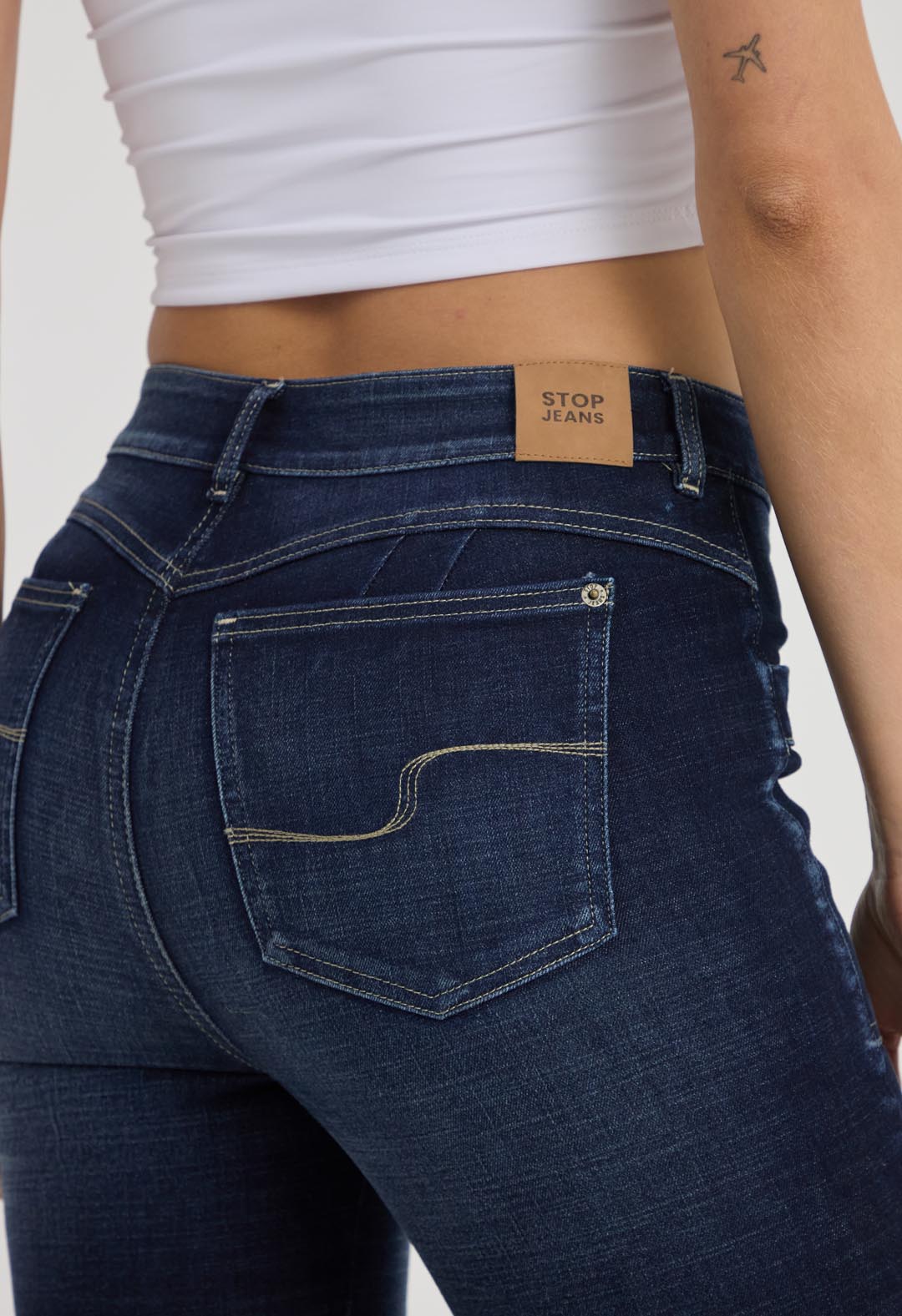 Jean levantacola, tiro alto, lavado oscuro, bolsillos en costados y fondo entero para mujer.