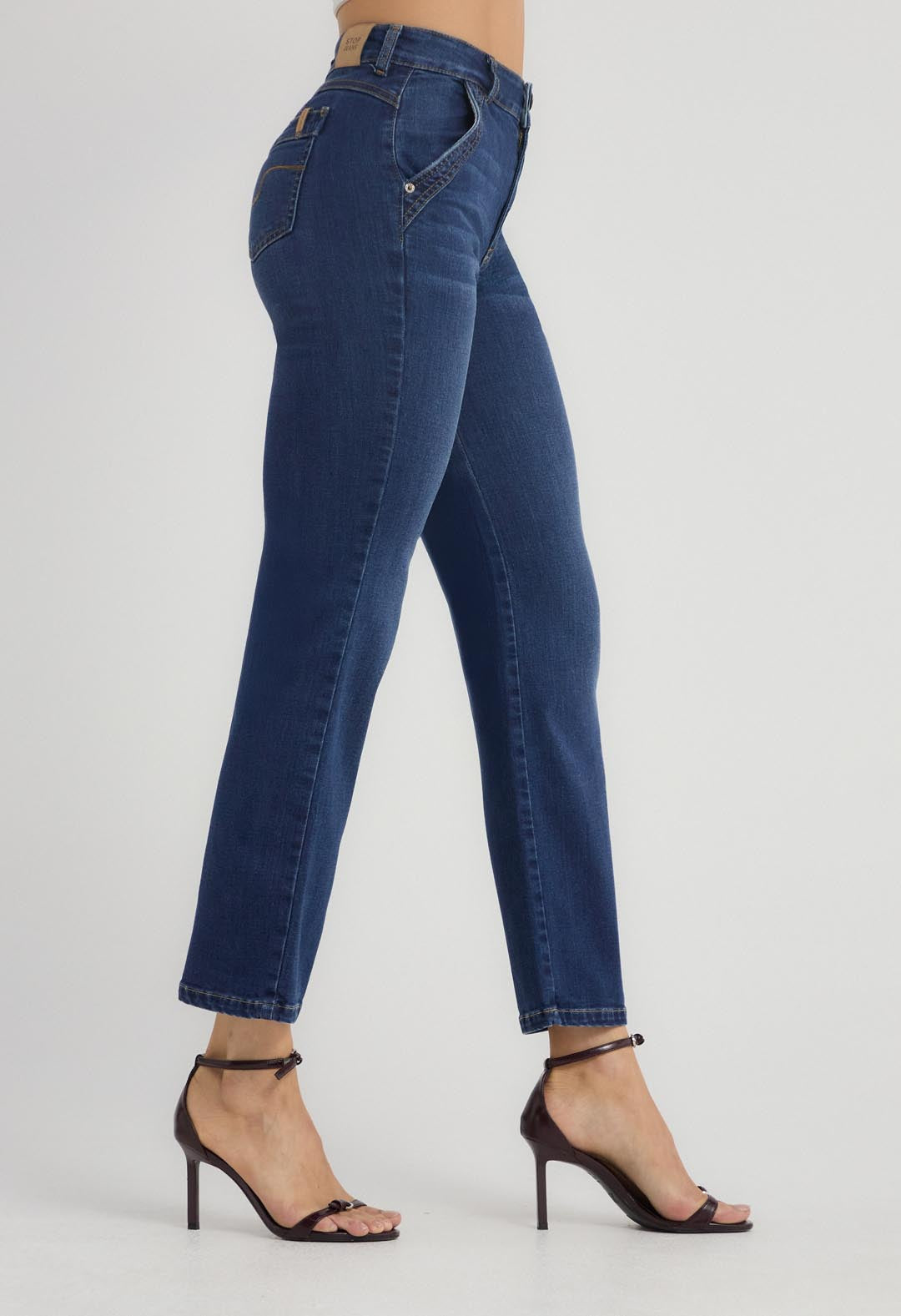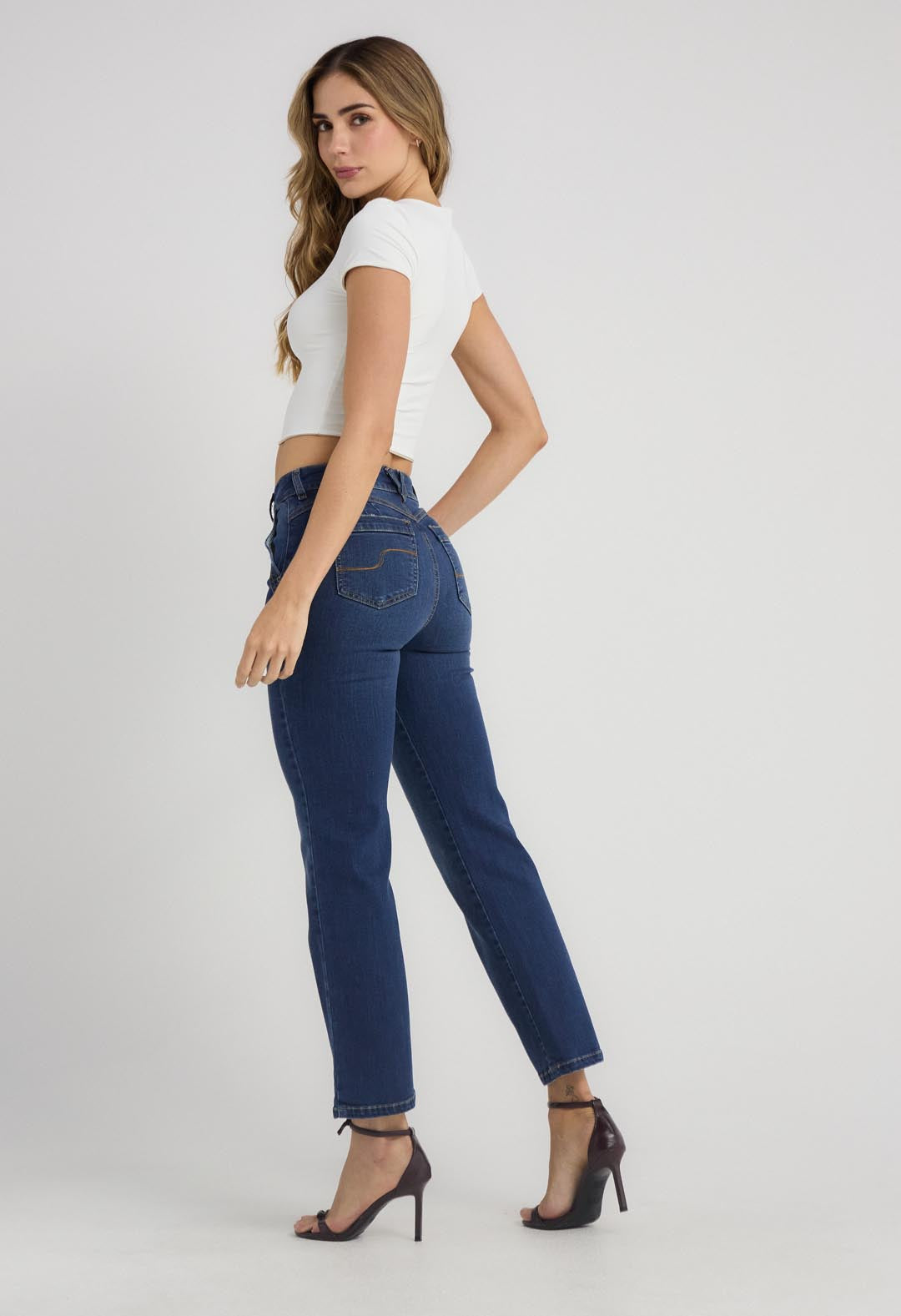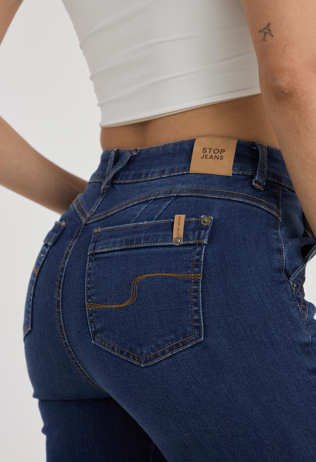 Jean levantacola, tiro alto, lavado oscuro, pinzas en posterior, detalle en bolsillo y fondo entero para mujer.