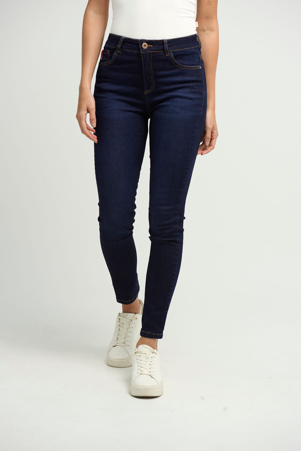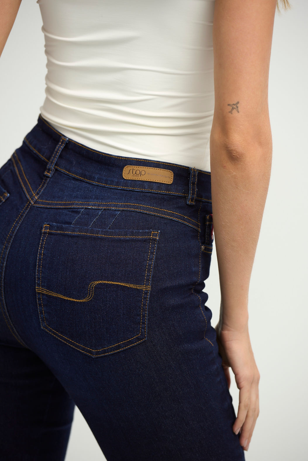 Jean levantacola tiro alto, bolsillos funcionales, bota tubo