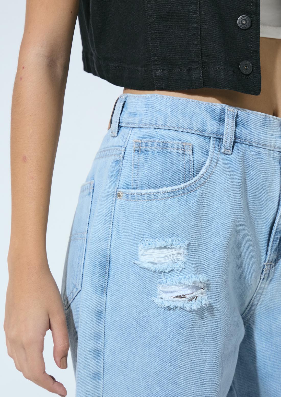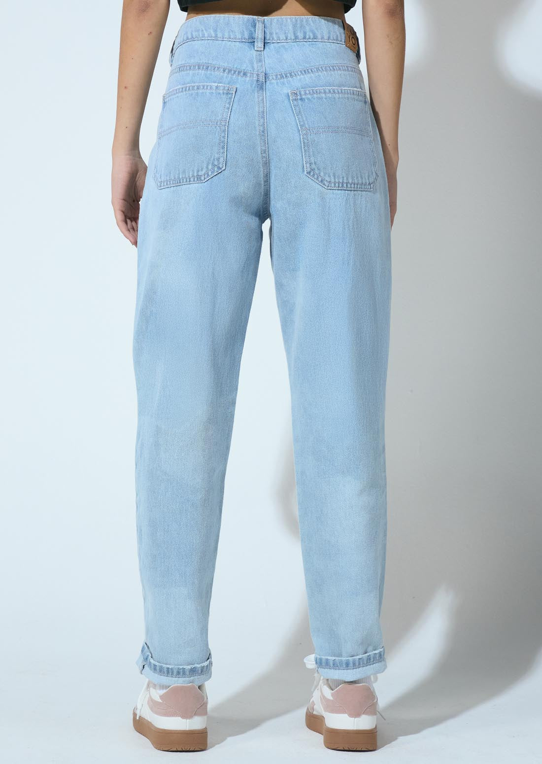 Jean mom jean, tiro alto, lavado claro, fondo entero, bolsillos funcionales y en denim para jóvenes.