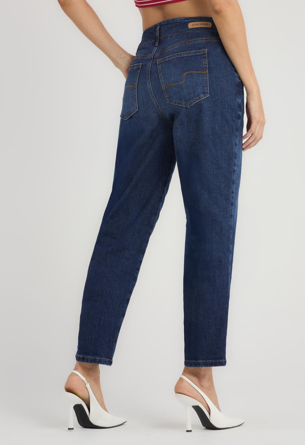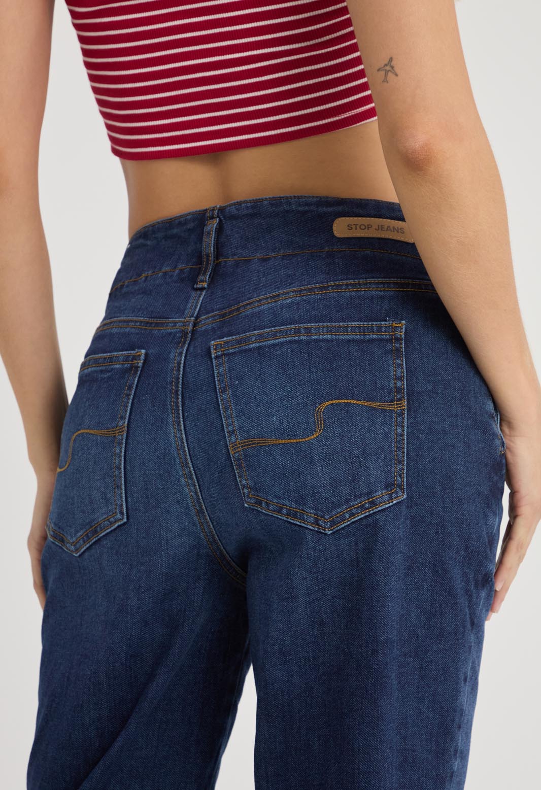 Jean mom jean medio oscuro tiro alto para mujeres.