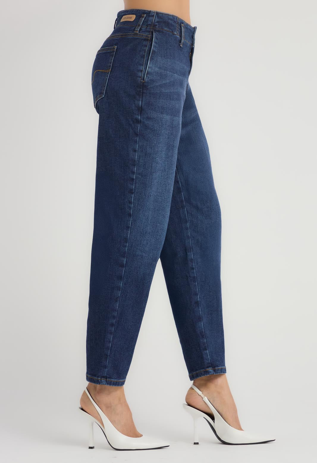Jean mom jean, tiro alto, lavado medio oscuro y fondo entero para mujeres.
