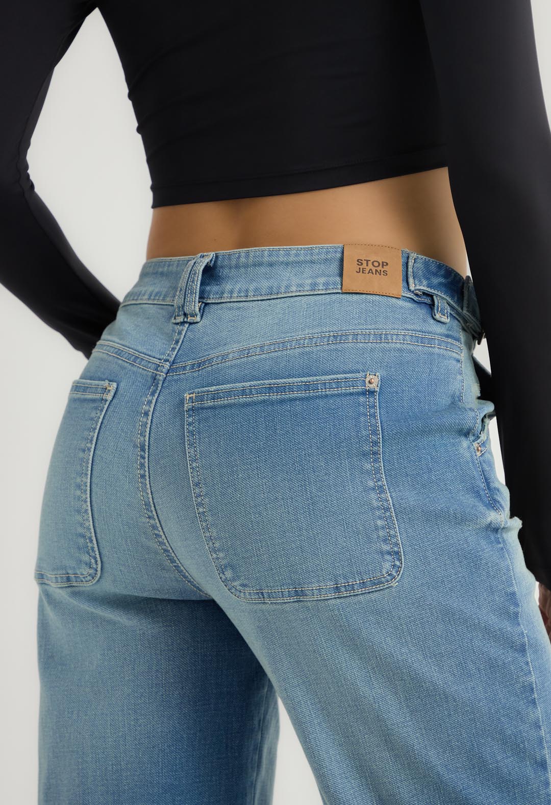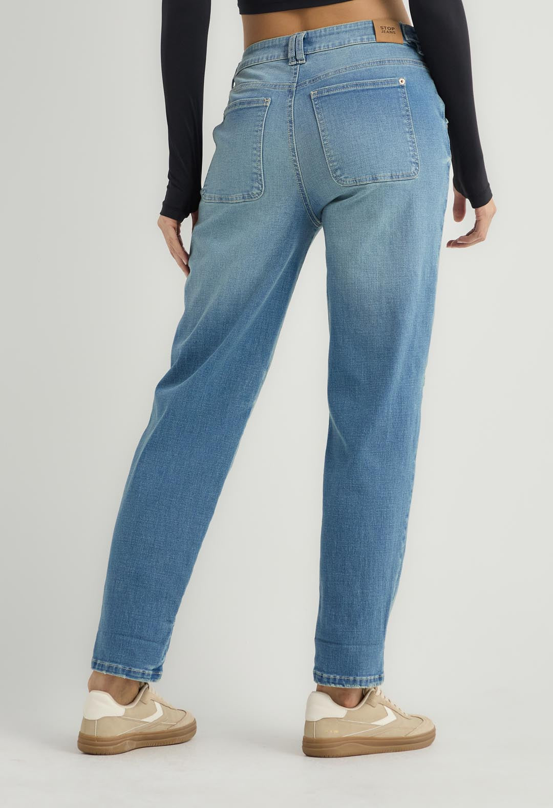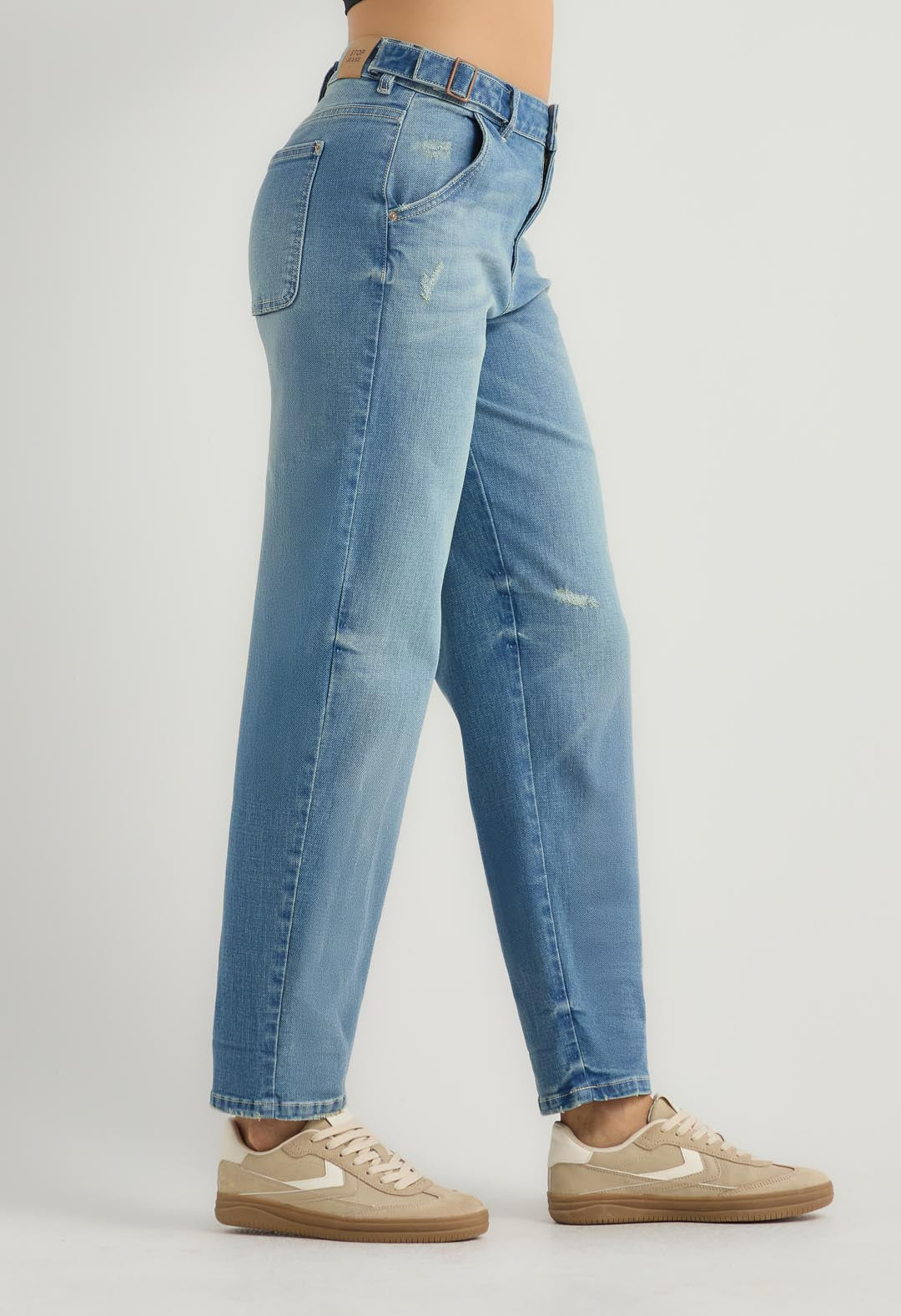 Jean mom jean, tiro alto, lavado medio, fondo entero y con bolsillos para mujer.