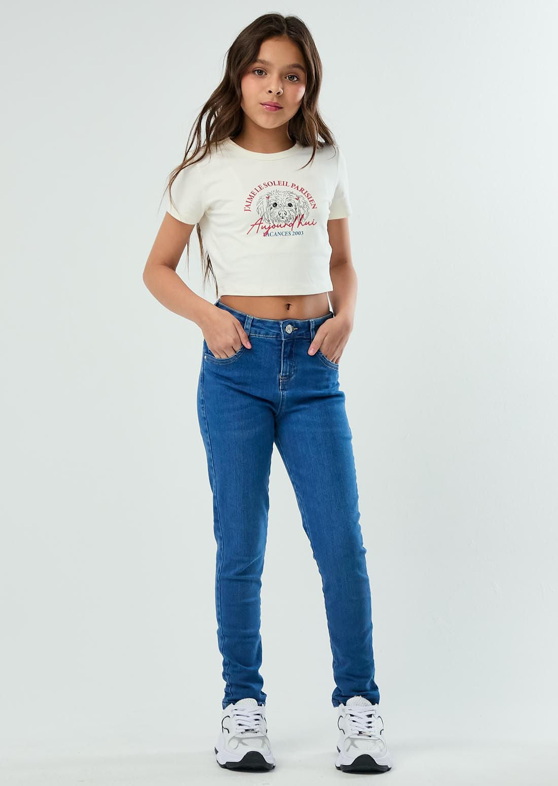 Jean perfect, tiro alto, lavado medio, garra decorativa en bolsillo relojero, bolsillos y elástico en cintura para niñas.