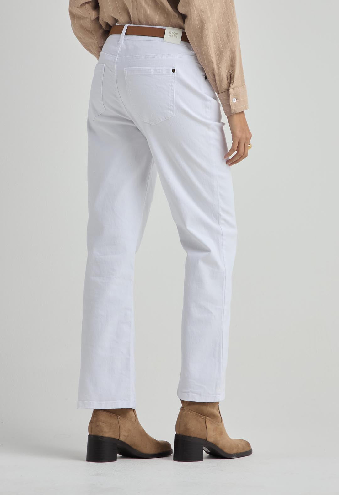 Jean retro, tiro bajo, color blanco, bolsillos funcionales, bota recta y fondo entero para mujer.