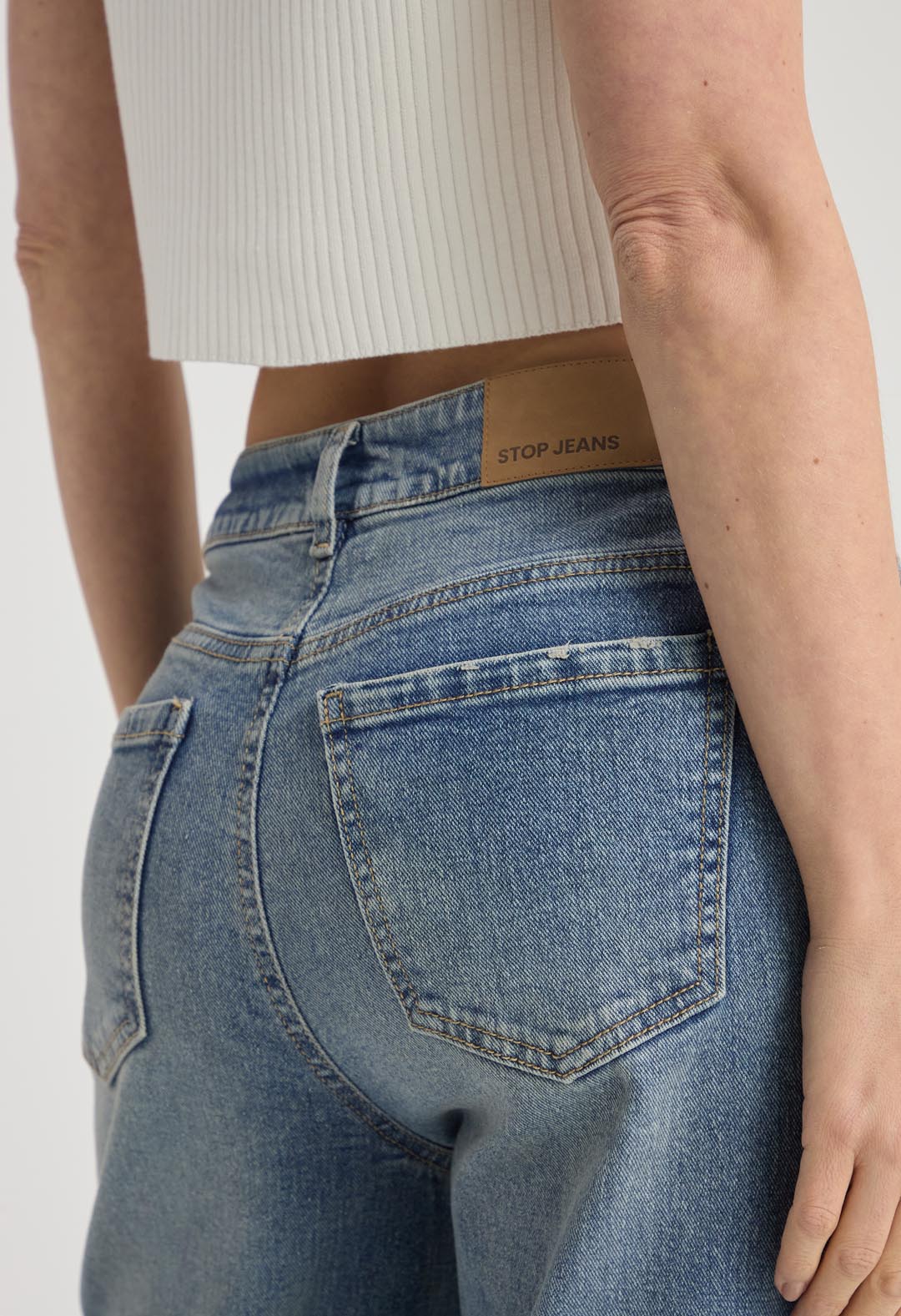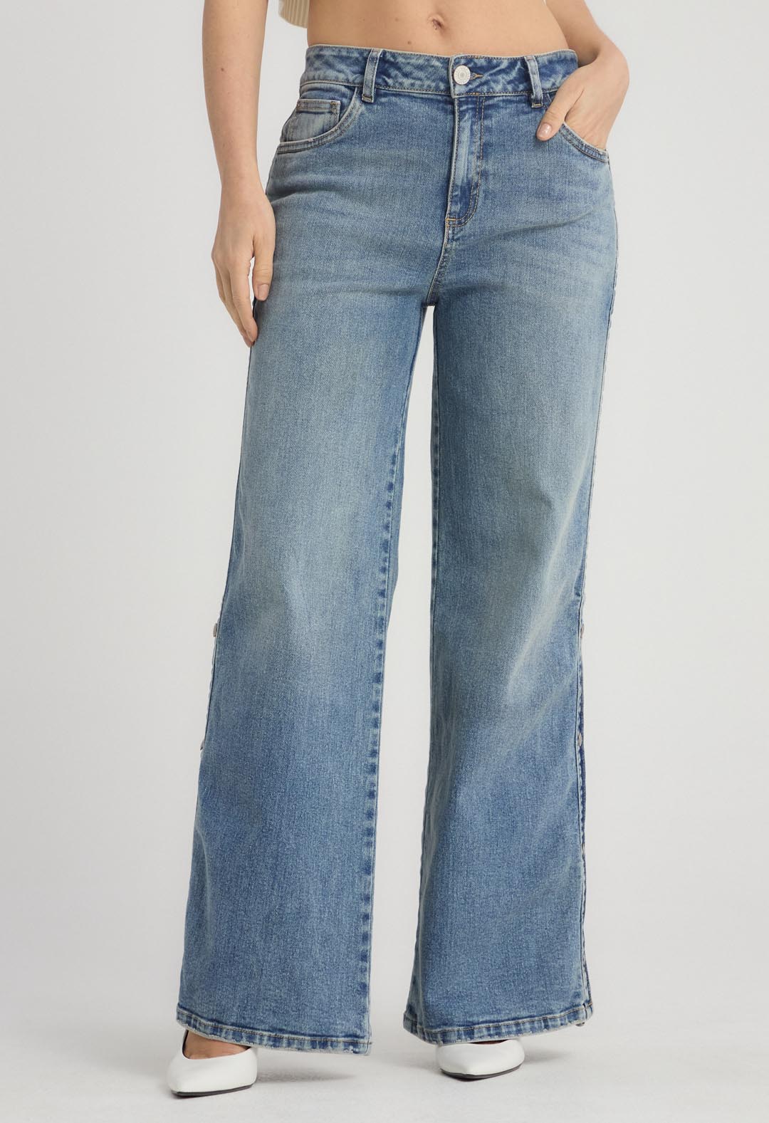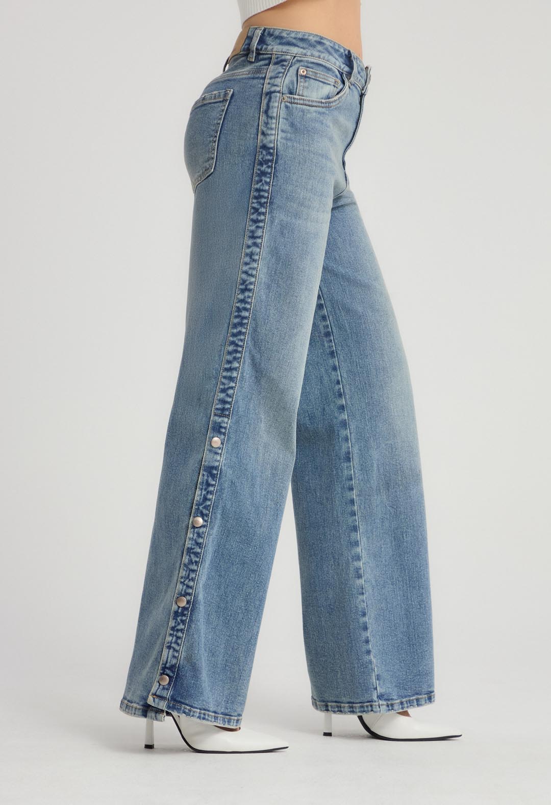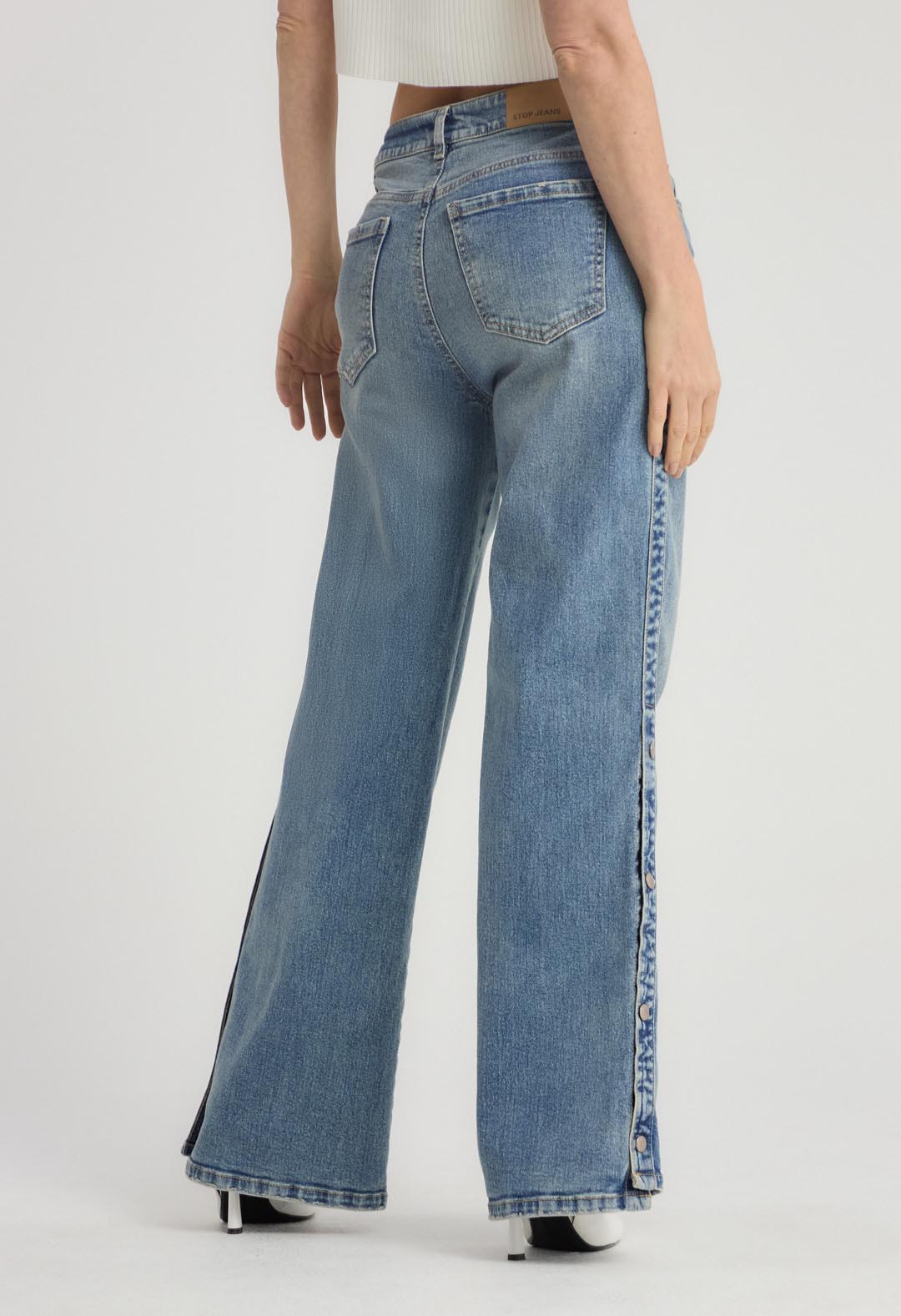 Jean retro, tiro bajo, lavado medio, broches, bota recta y fondo entero para mujeres.