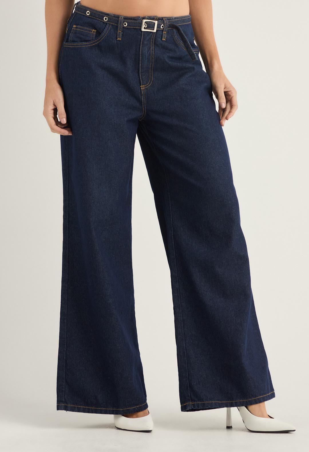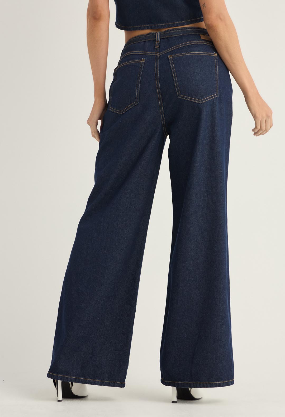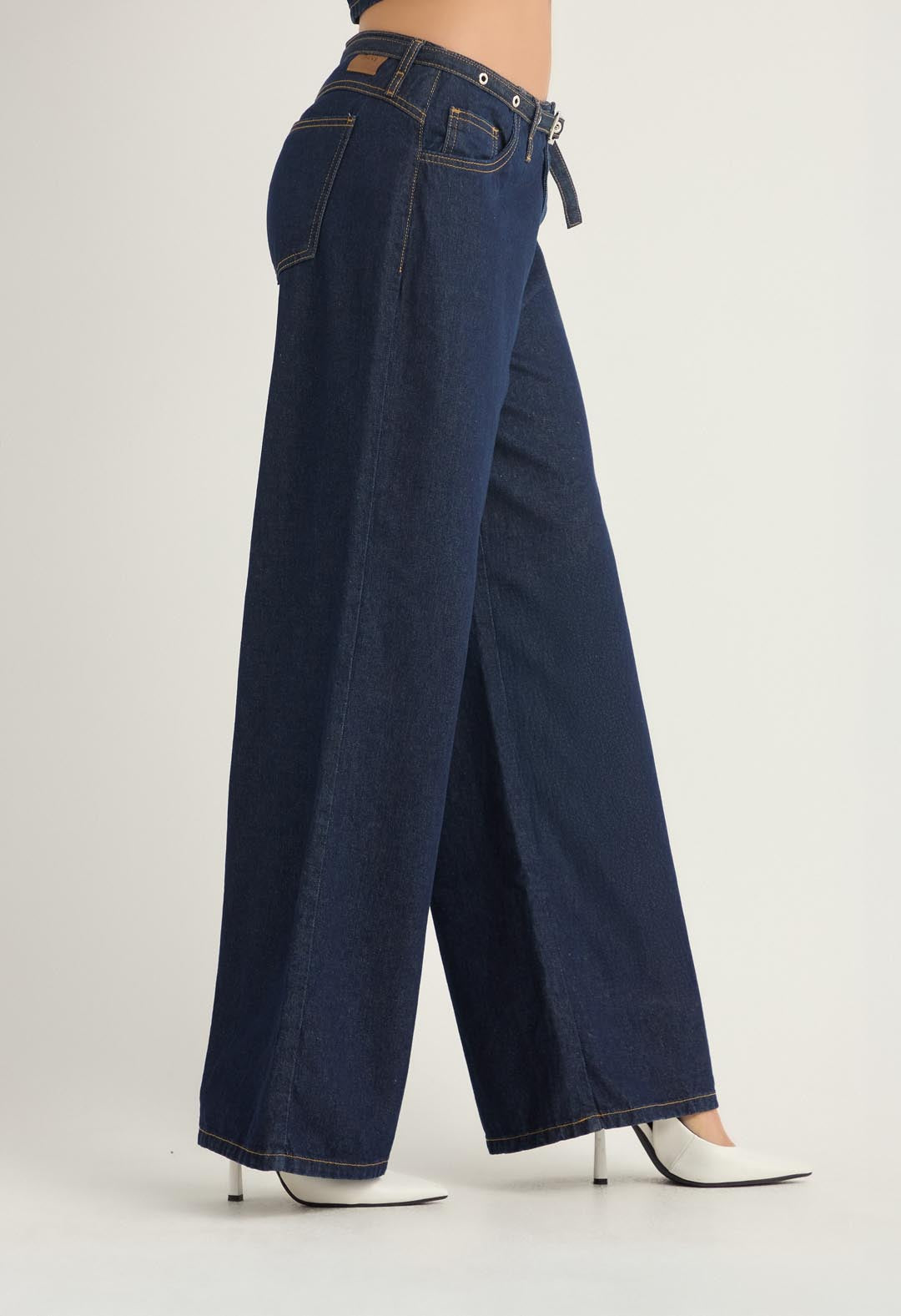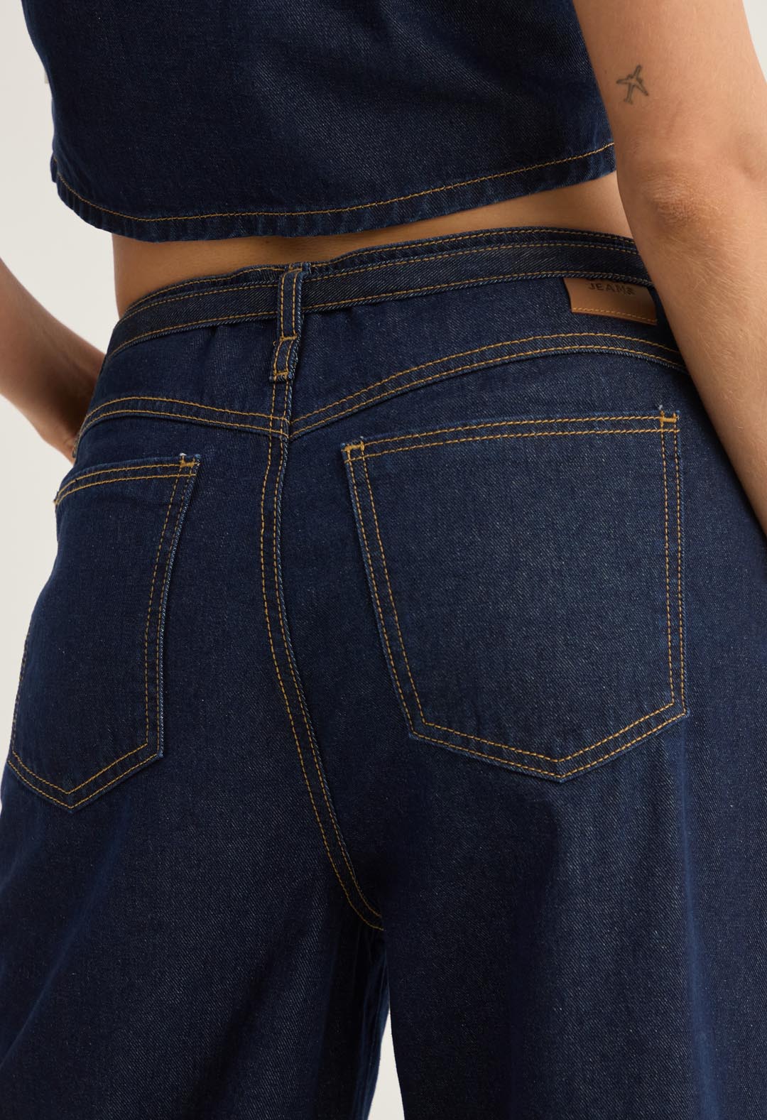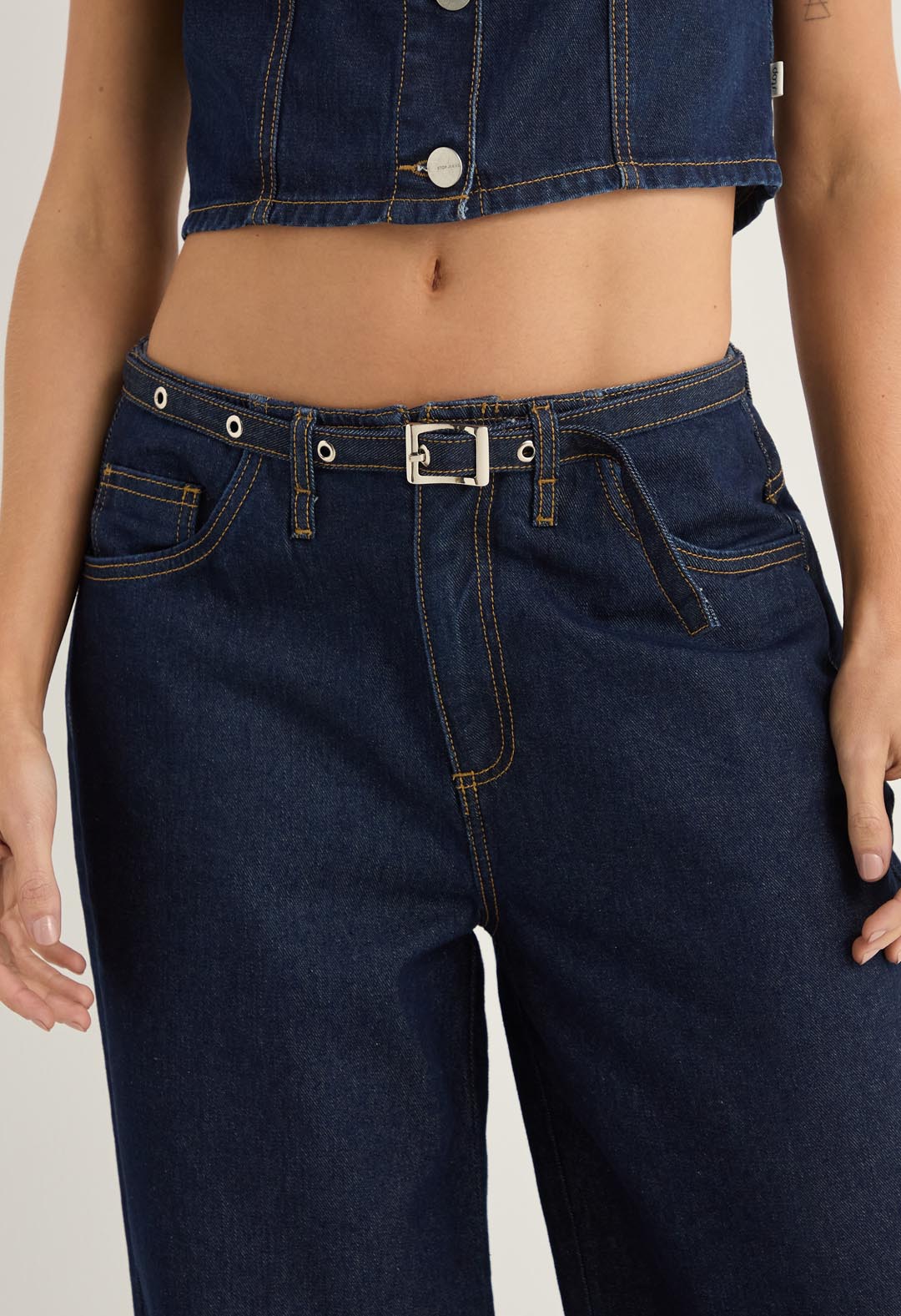 Jean retro tiro alto, lavados oscuro, fondo entero y bolsillos funcionales para mujer.