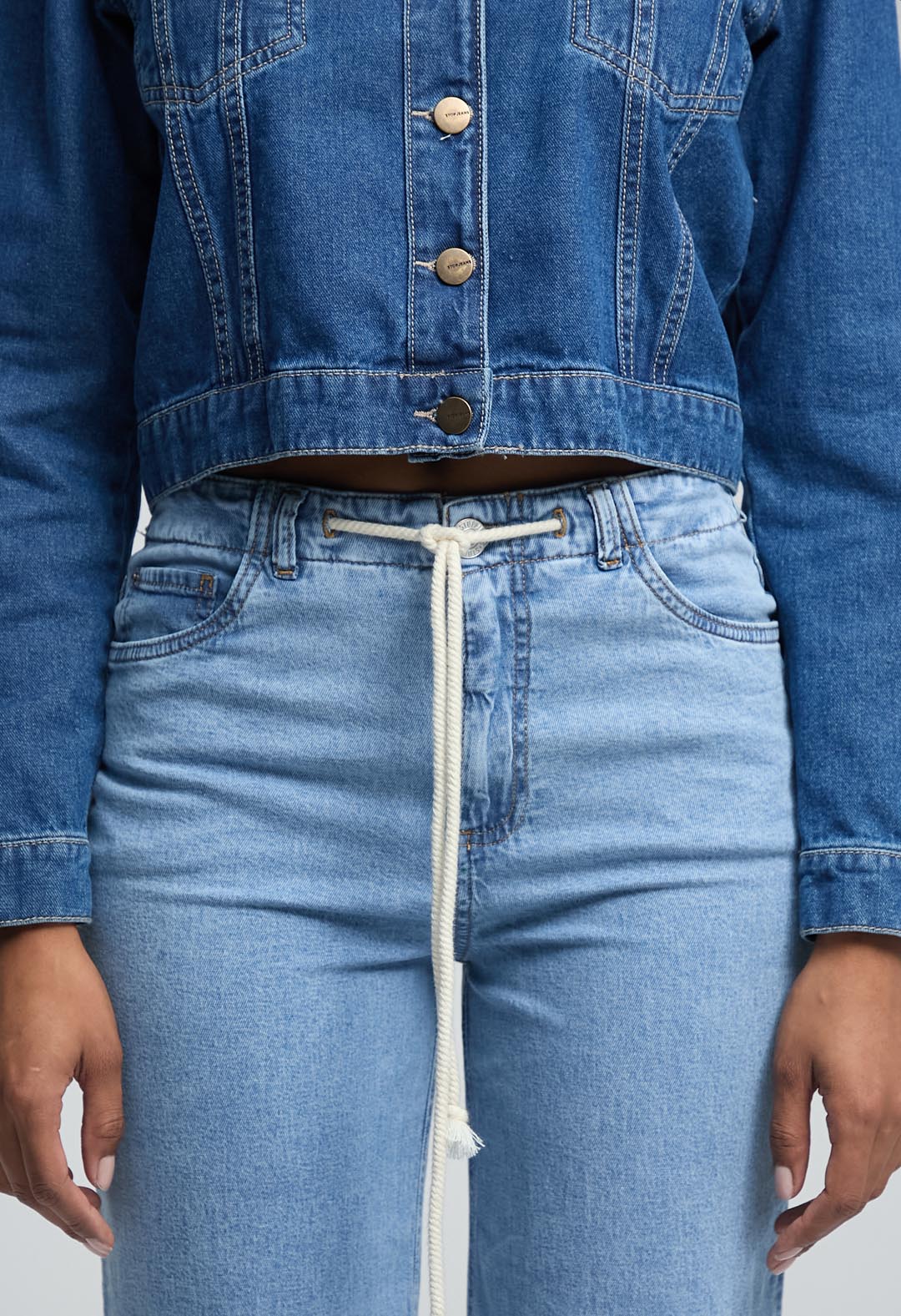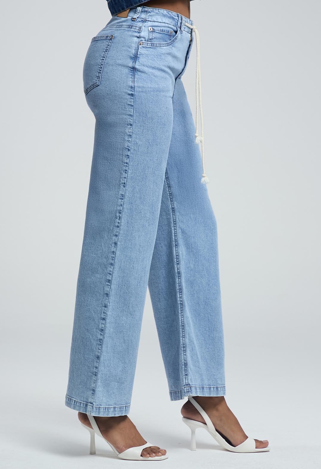 Jean retro, tiro alto, lavado claro, con cordón en pretina, bolsillos funcionales, bota recta y fondo entero para mujeres.