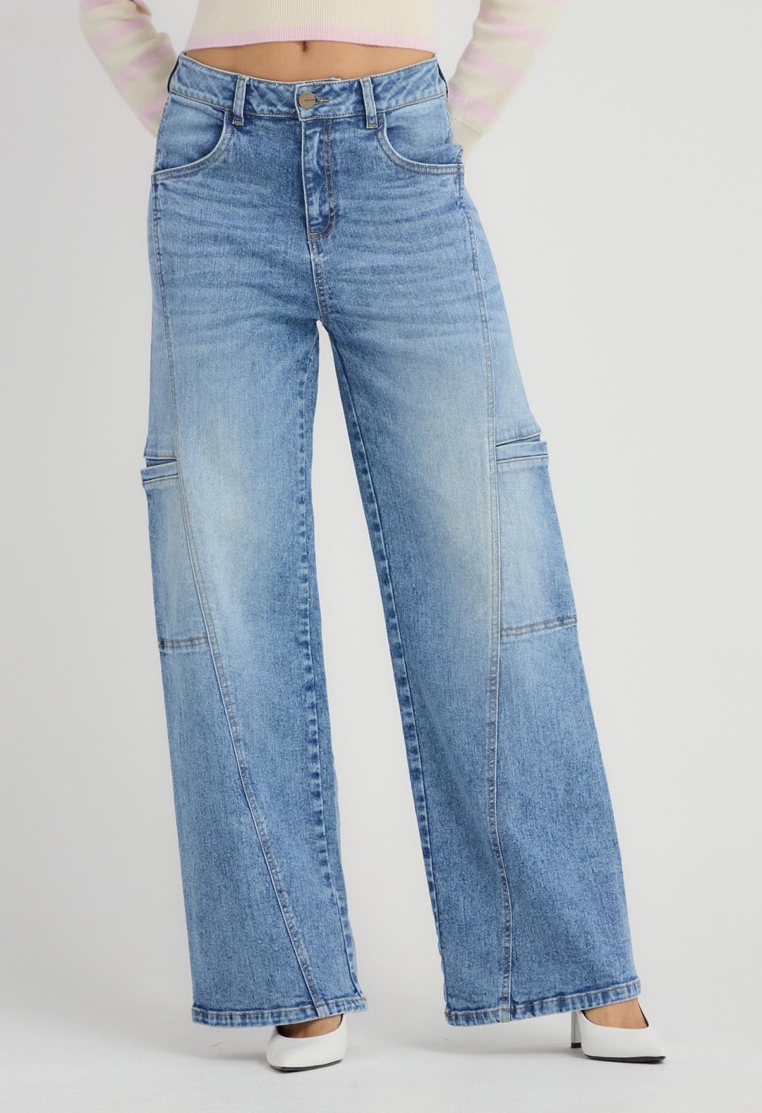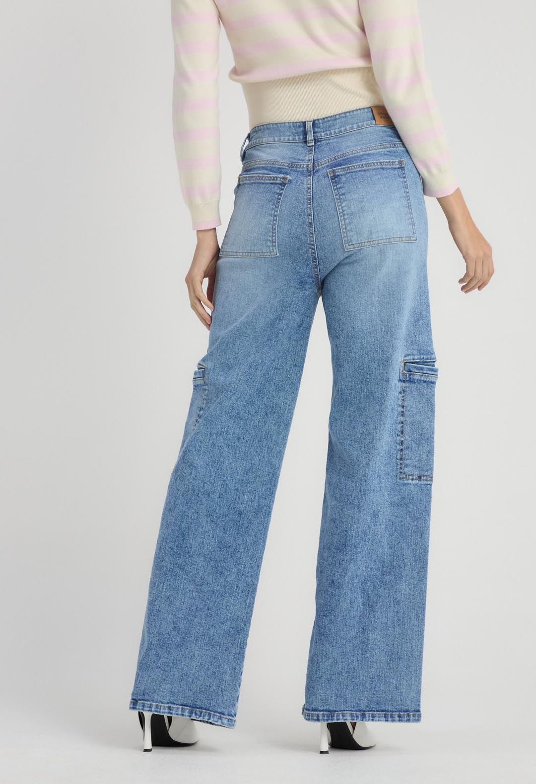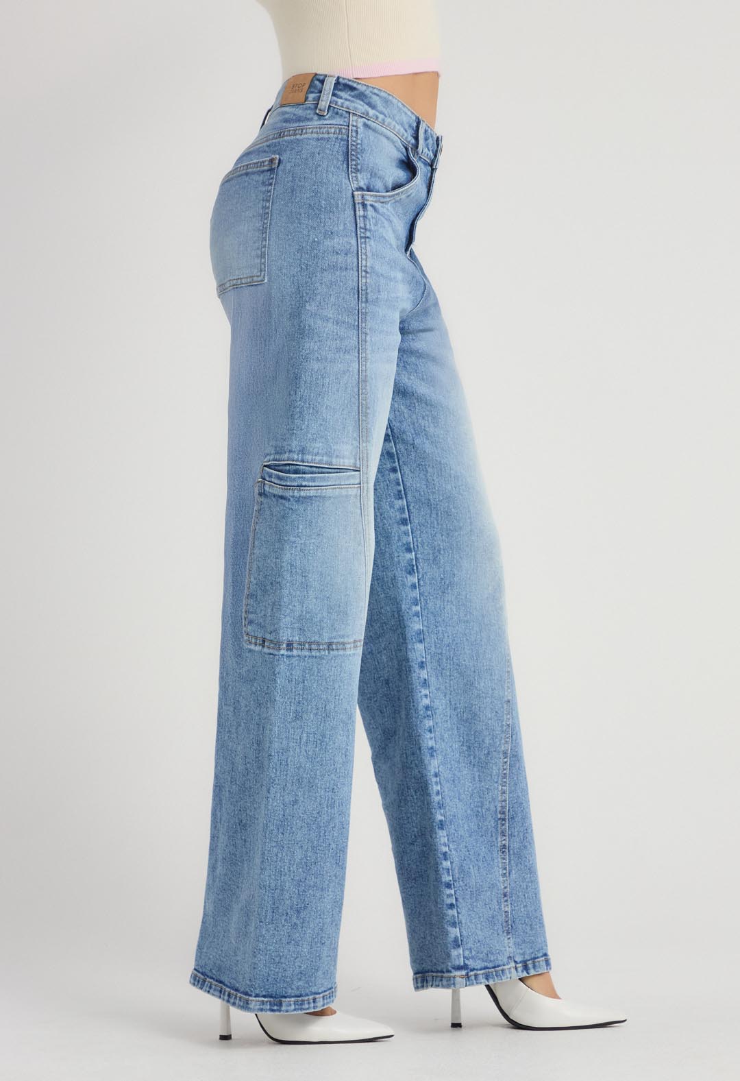 Jean retrojean, tiro alto, lavado claro, con cortes en frente y fondo entero para mujer.