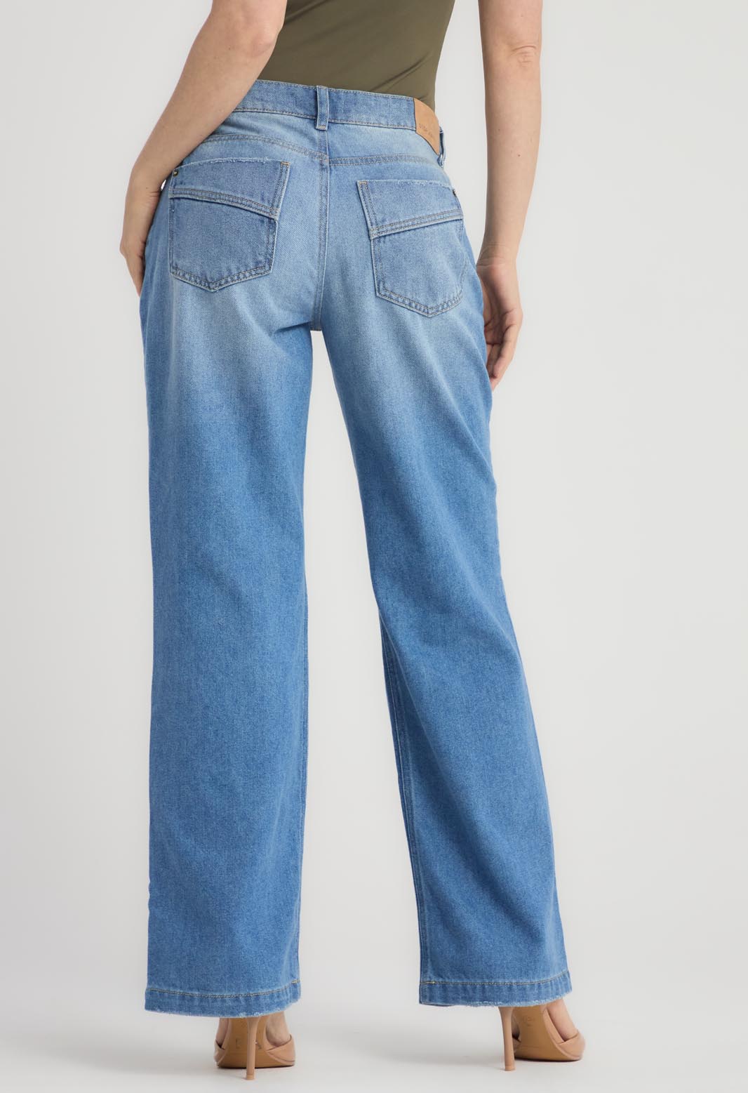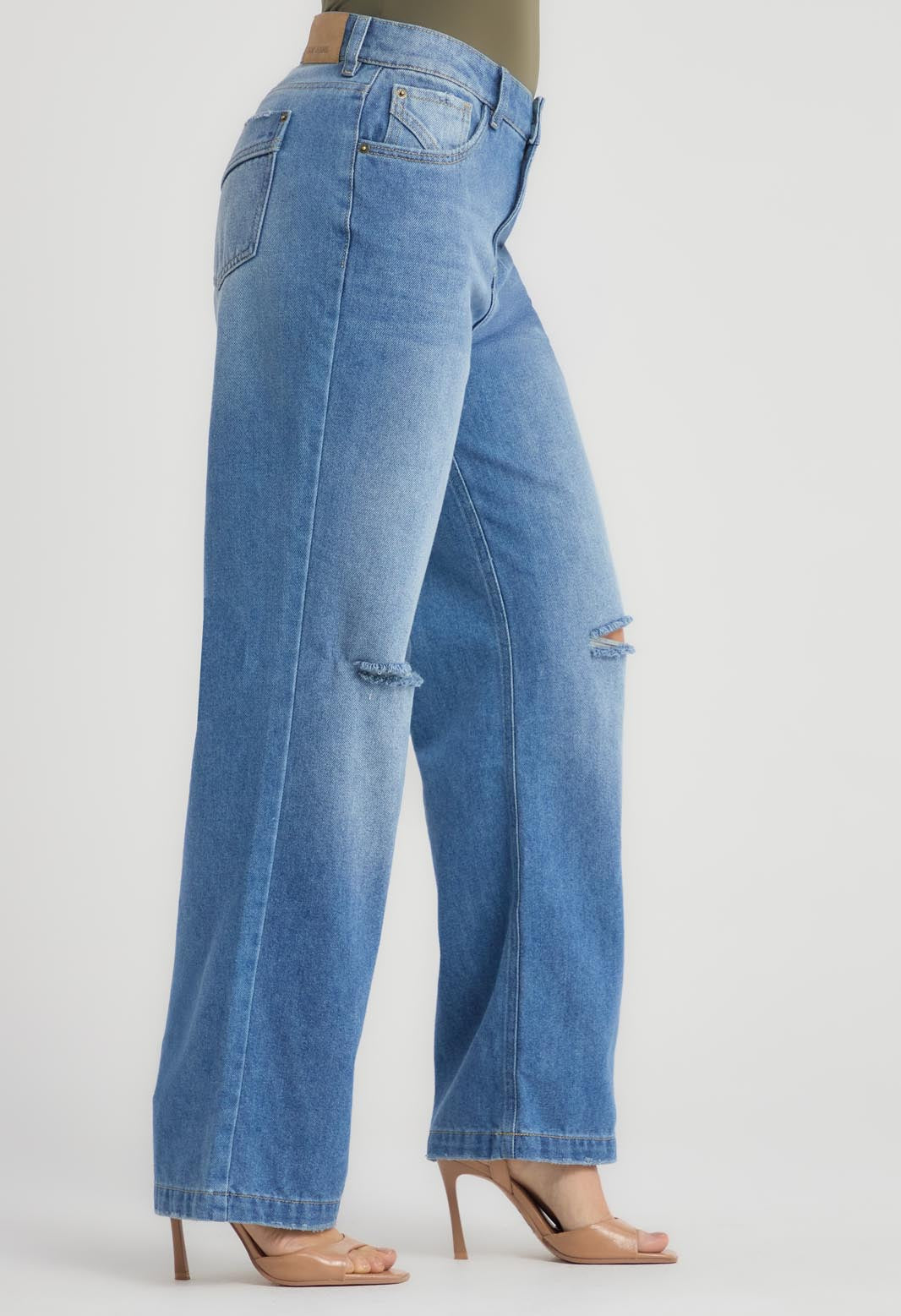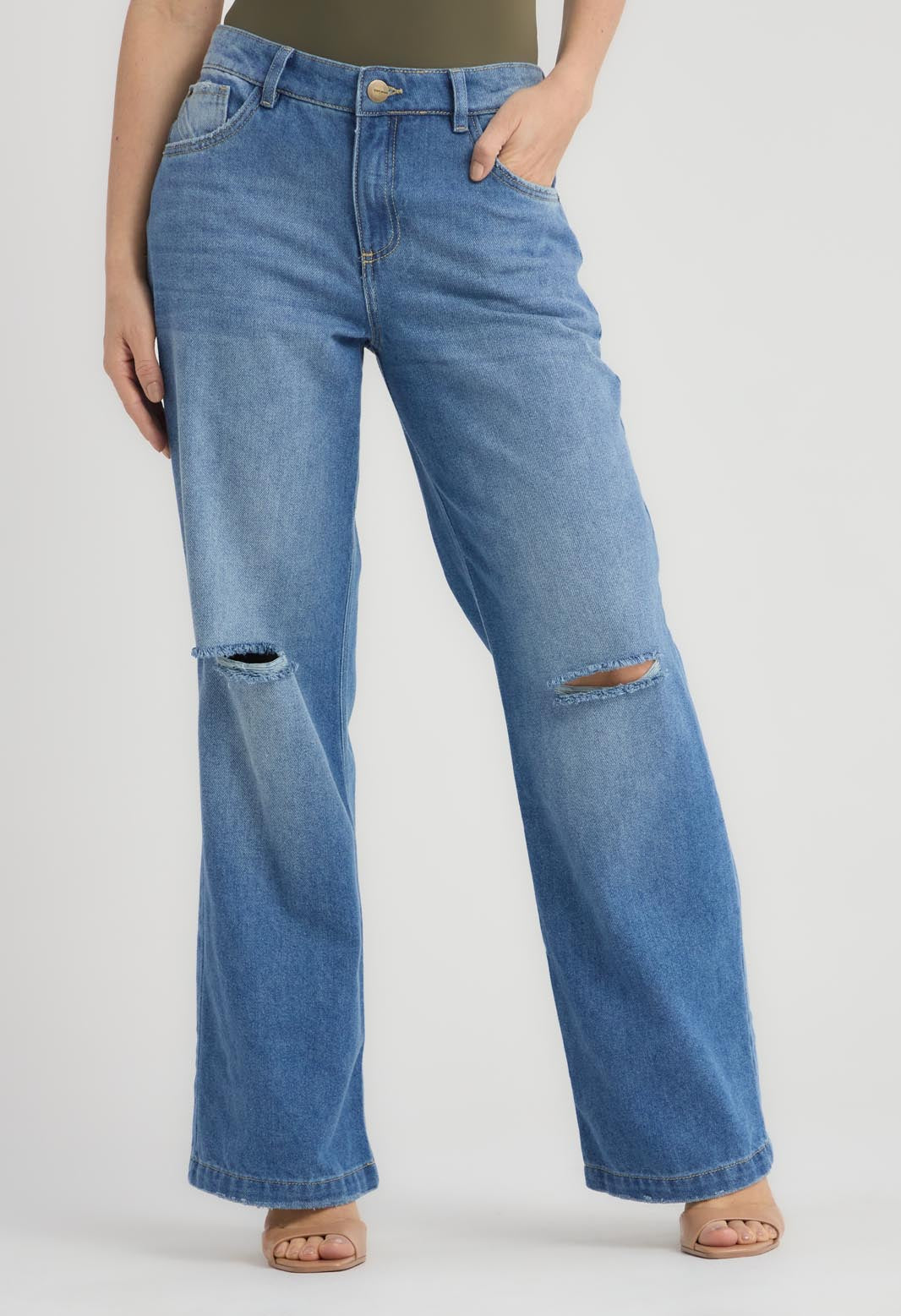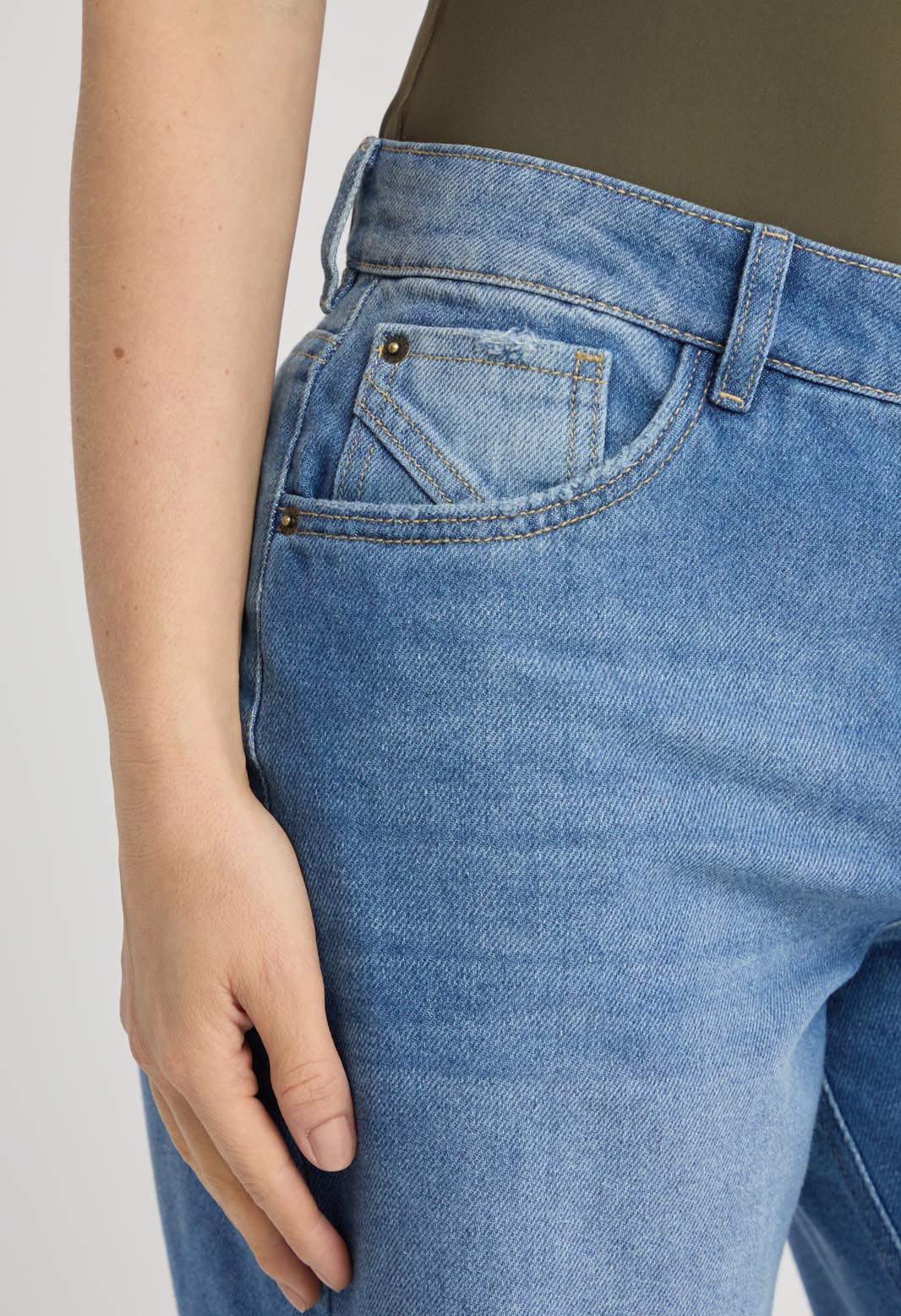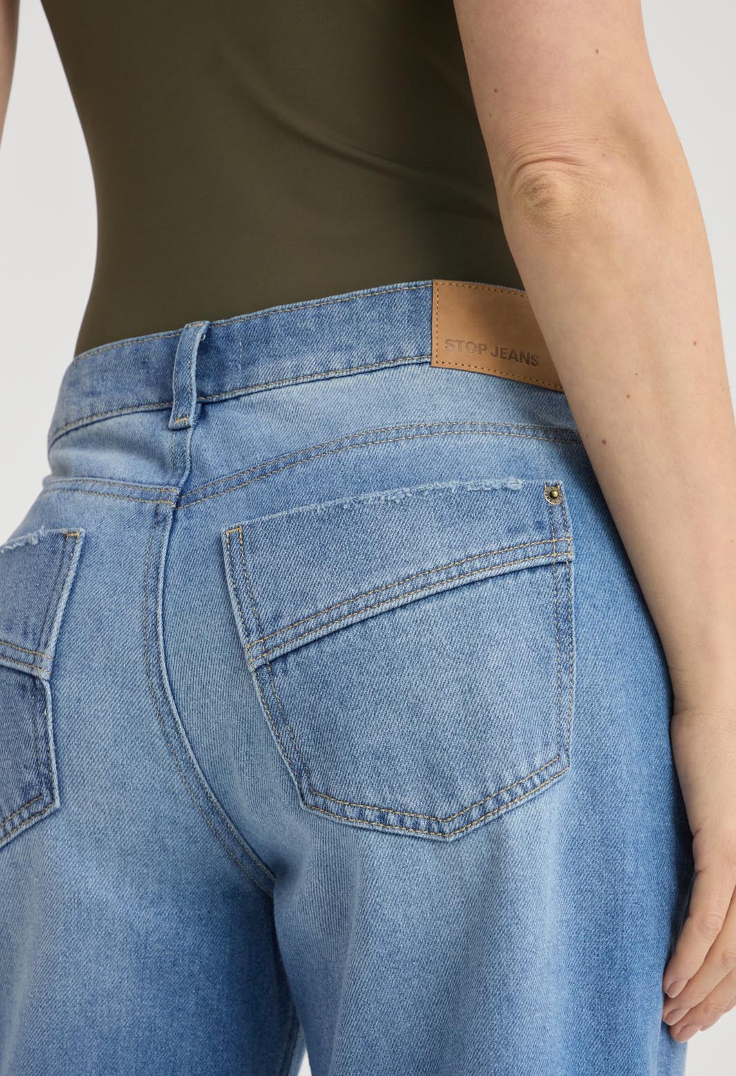 Jean retro, lavado claro, desgastes, bolsillos, bota recta y fondo entero para mujeres.