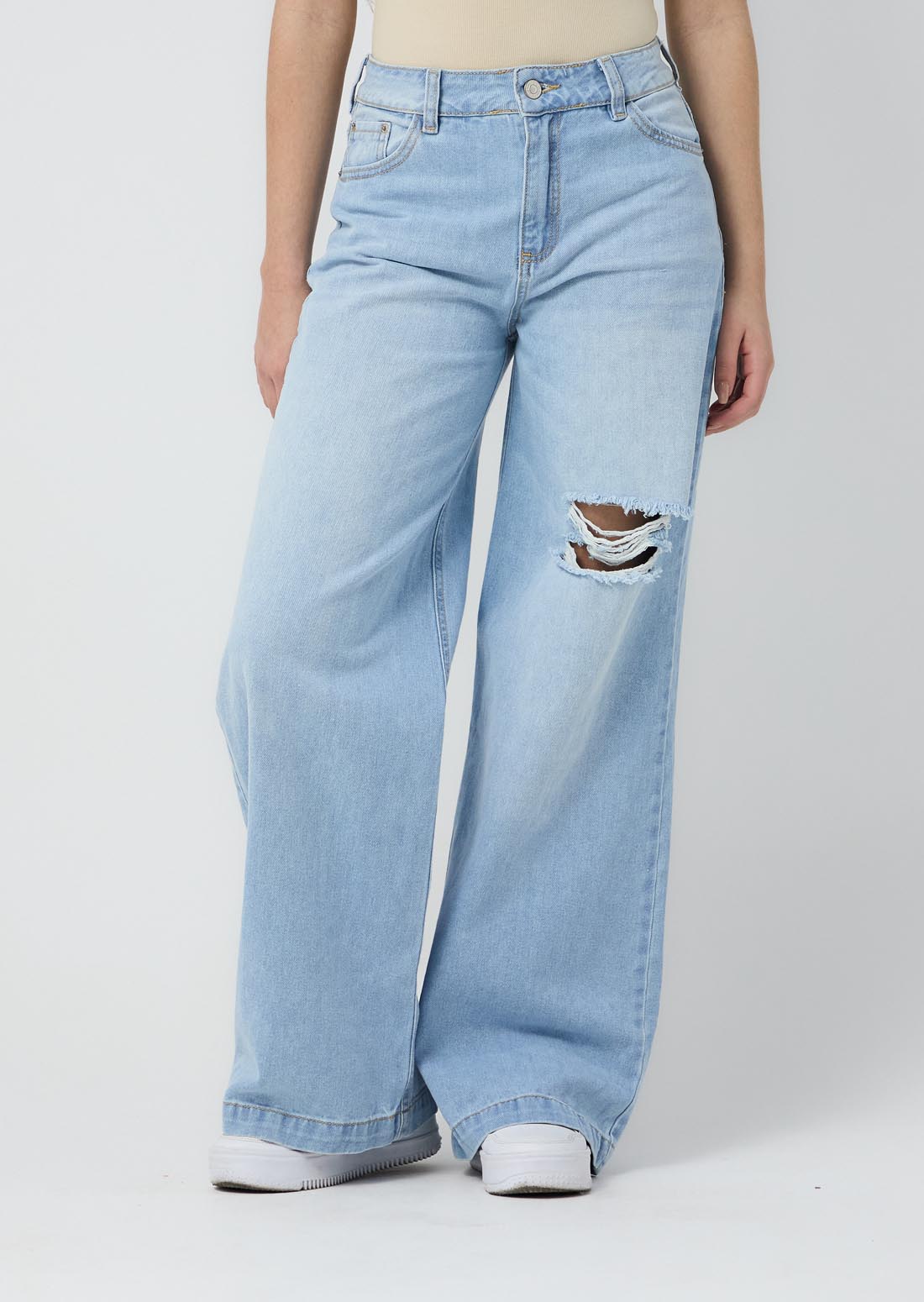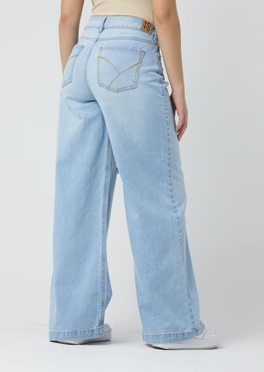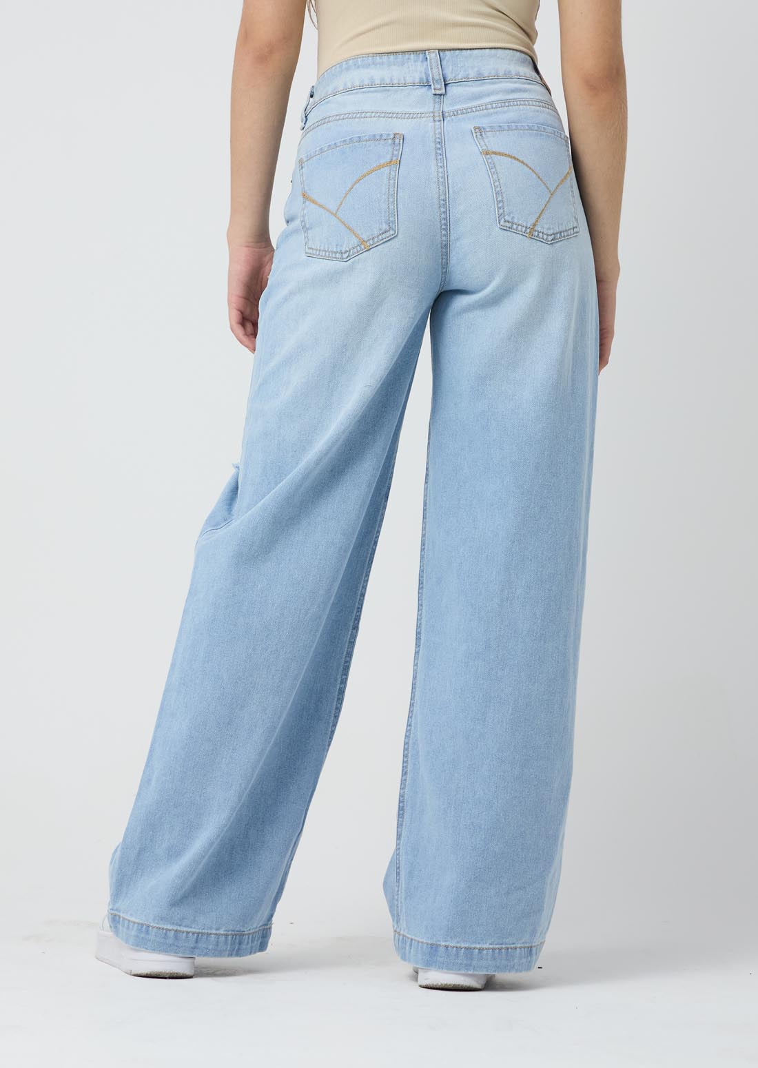 Jean retromom, tiro bajo, lavado claro, fondo entero, bota recta y bolsillos funcionales para jóvenes.