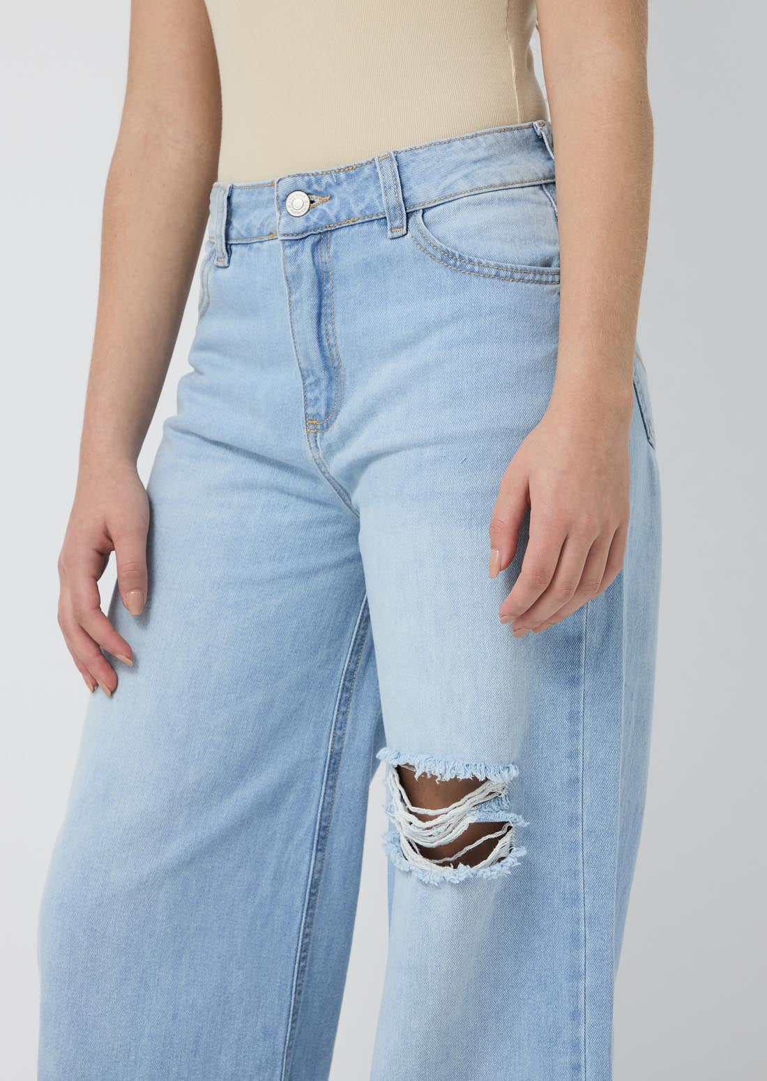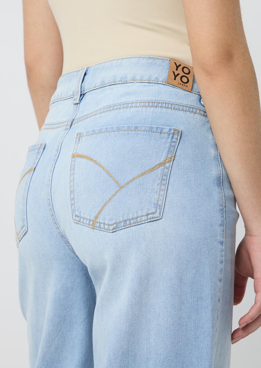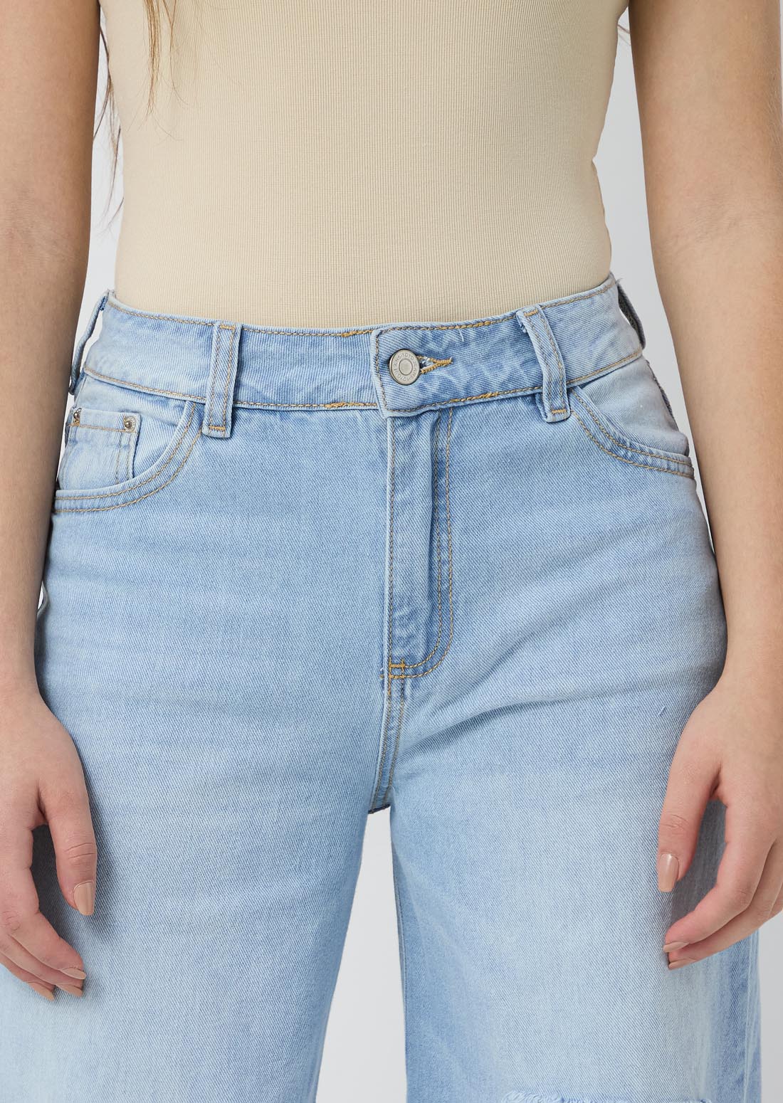 Jean retromom, tiro bajo, lavado claro, fondo entero, bota recta y bolsillos funcionales para jóvenes.