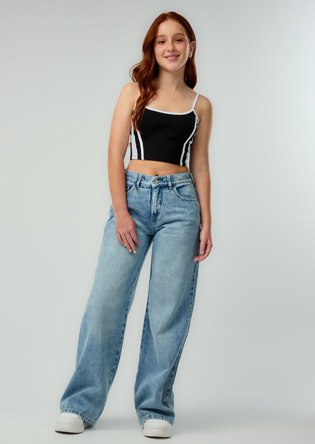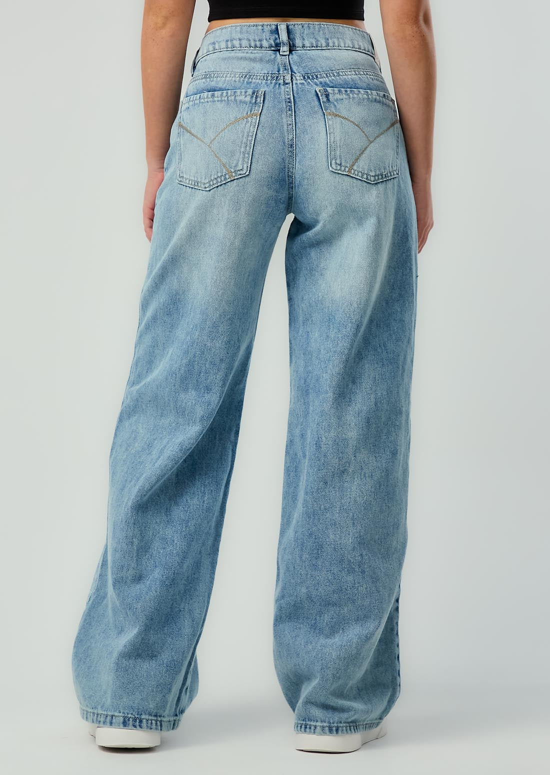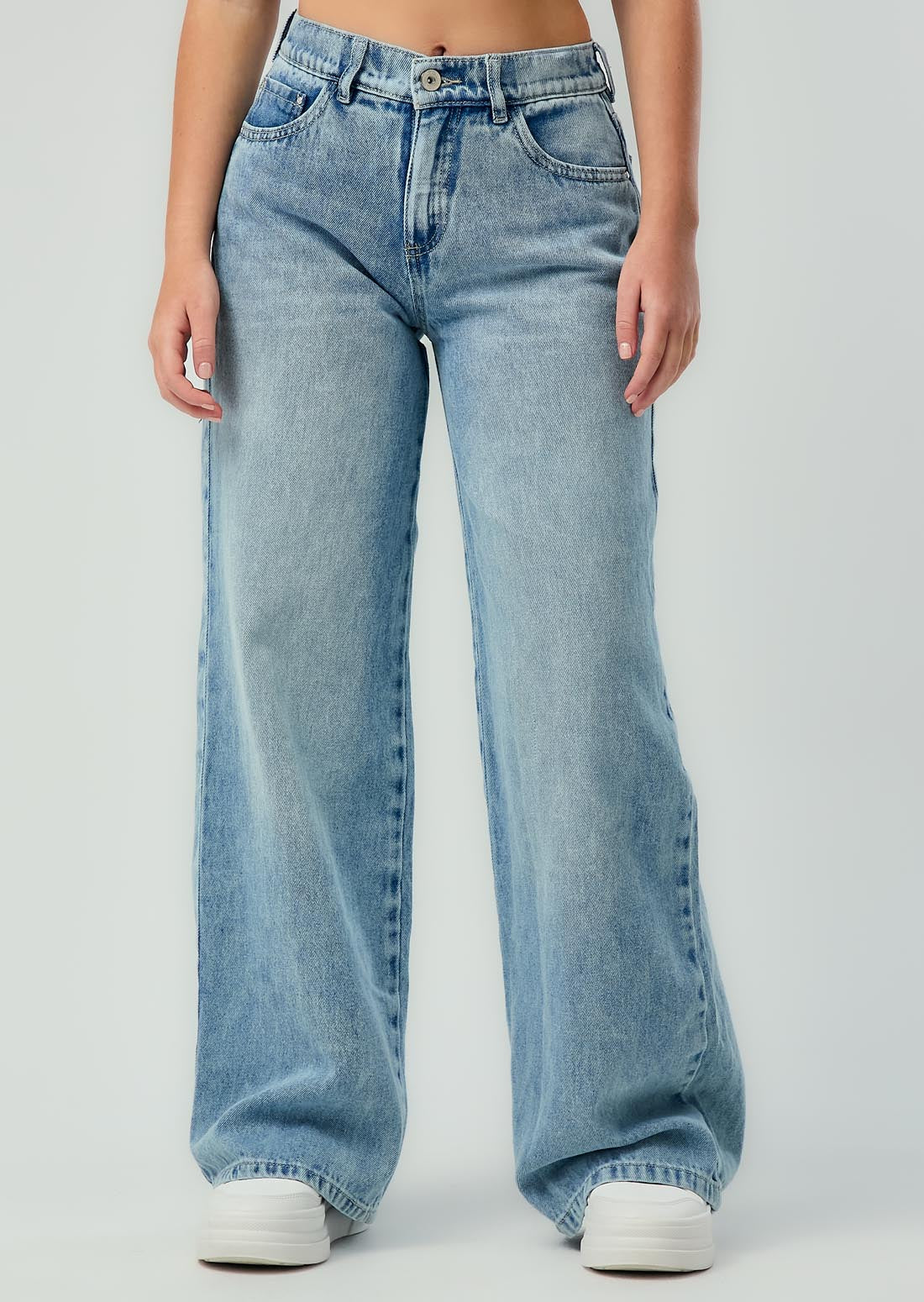 Jean retromom, tiro alto, lavado claro, fondo entero, bolsillos funcionales y elástico en cintura para jóvenes.