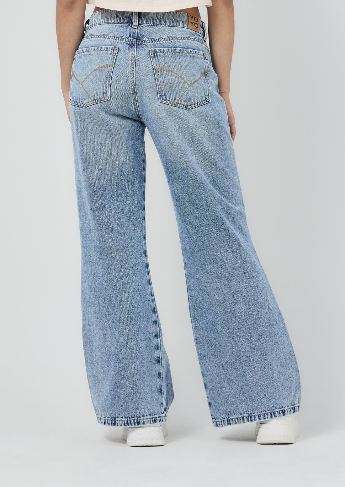 Jean retromom tiro bajo, lavado medio, con corte en frente y bota recta para jóvenes.