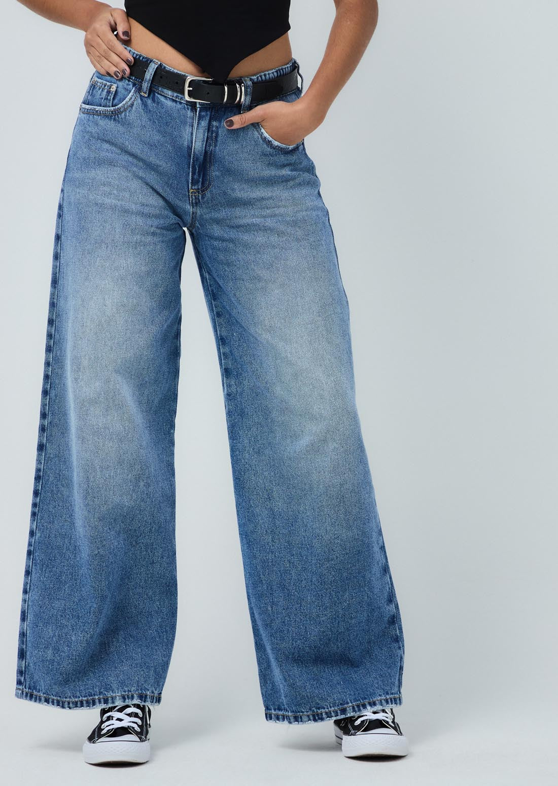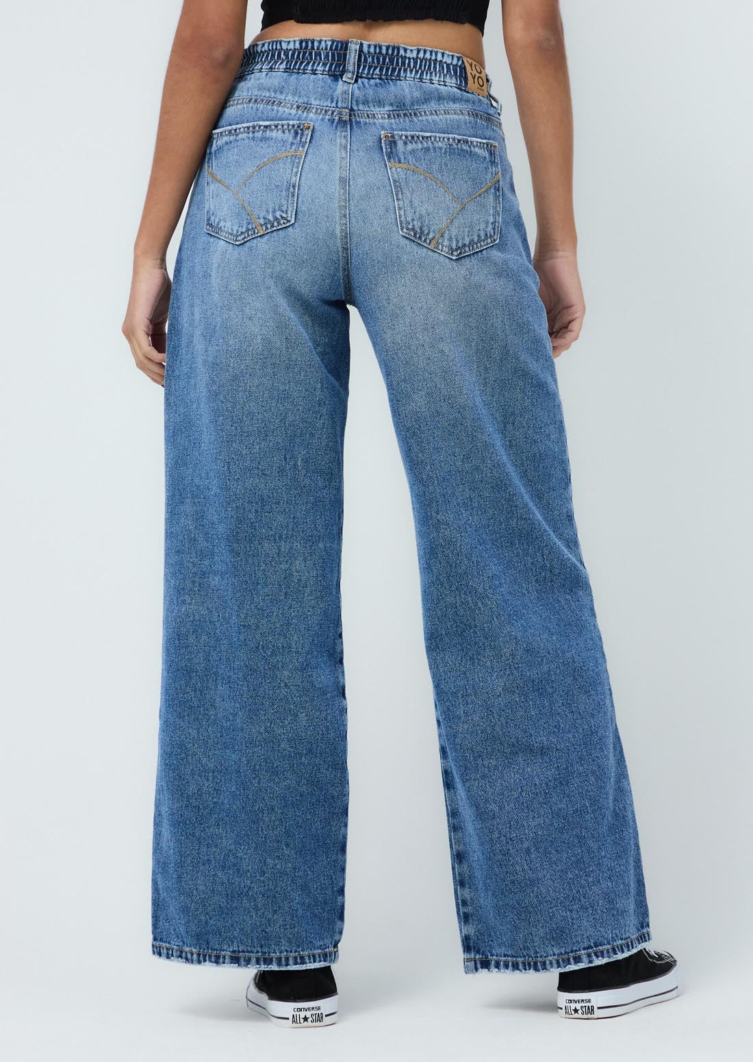 Jean retromom lavado medio oscuro con tiro alto para jóvenes.