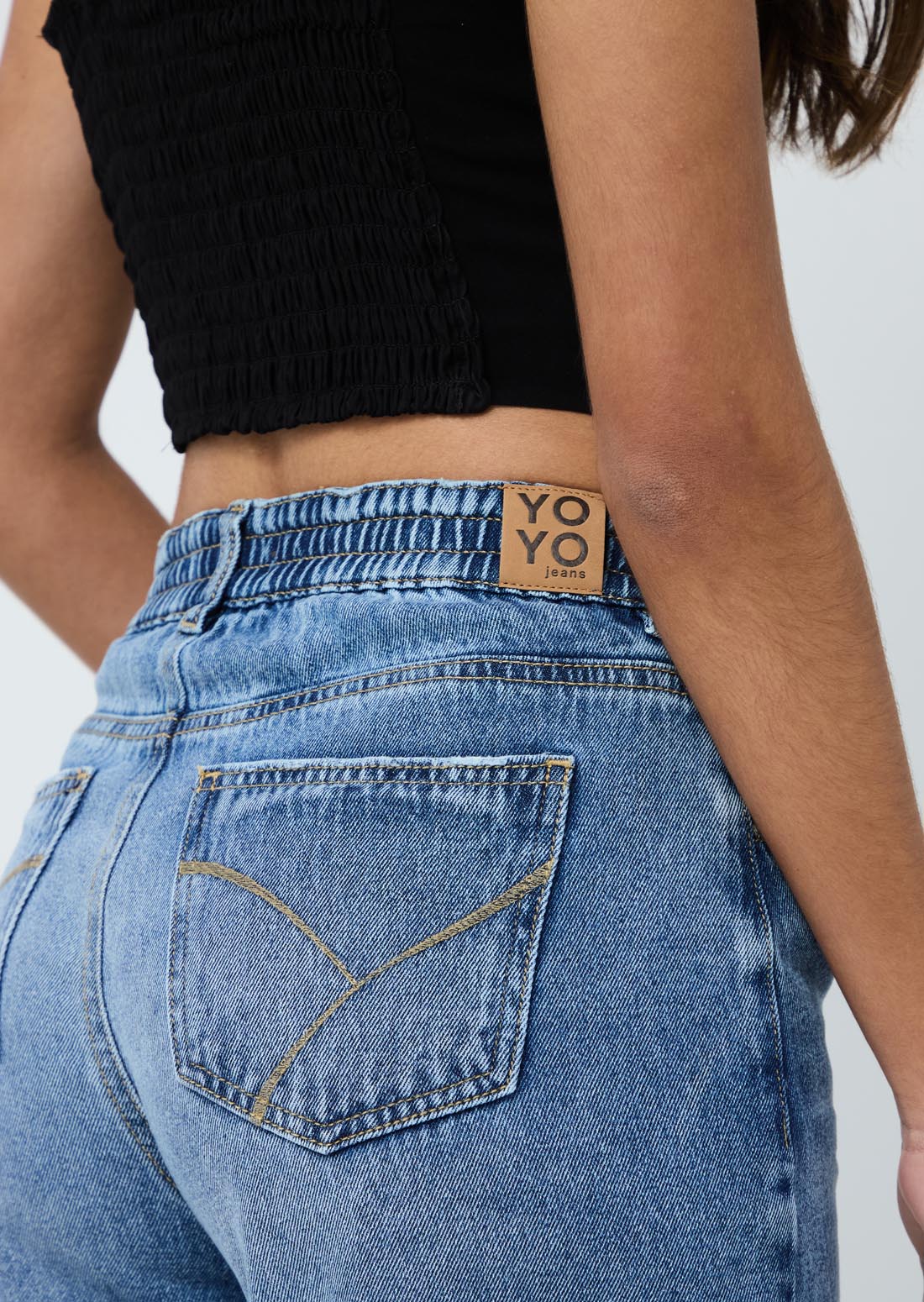 Jean retromom, tiro alto, lavado medio oscuro, fondo entero y bota recta para jóvenes.
