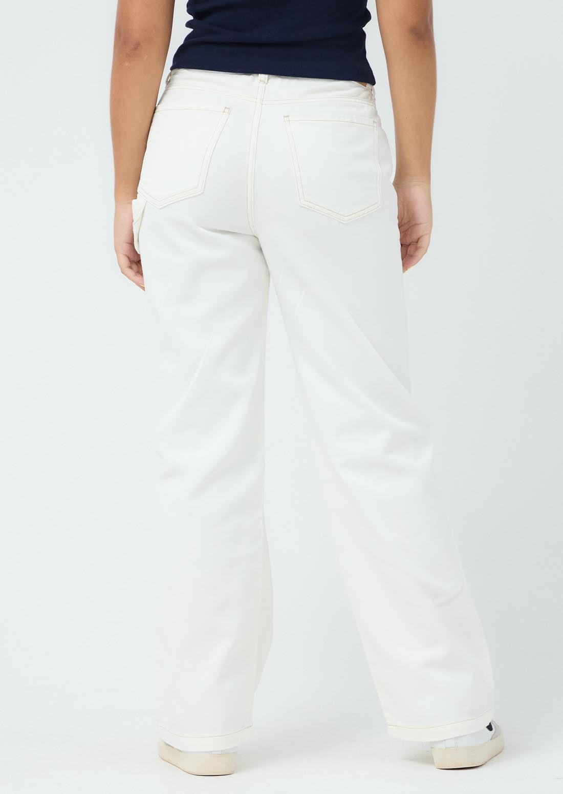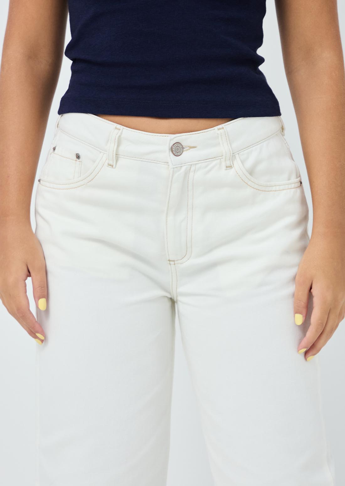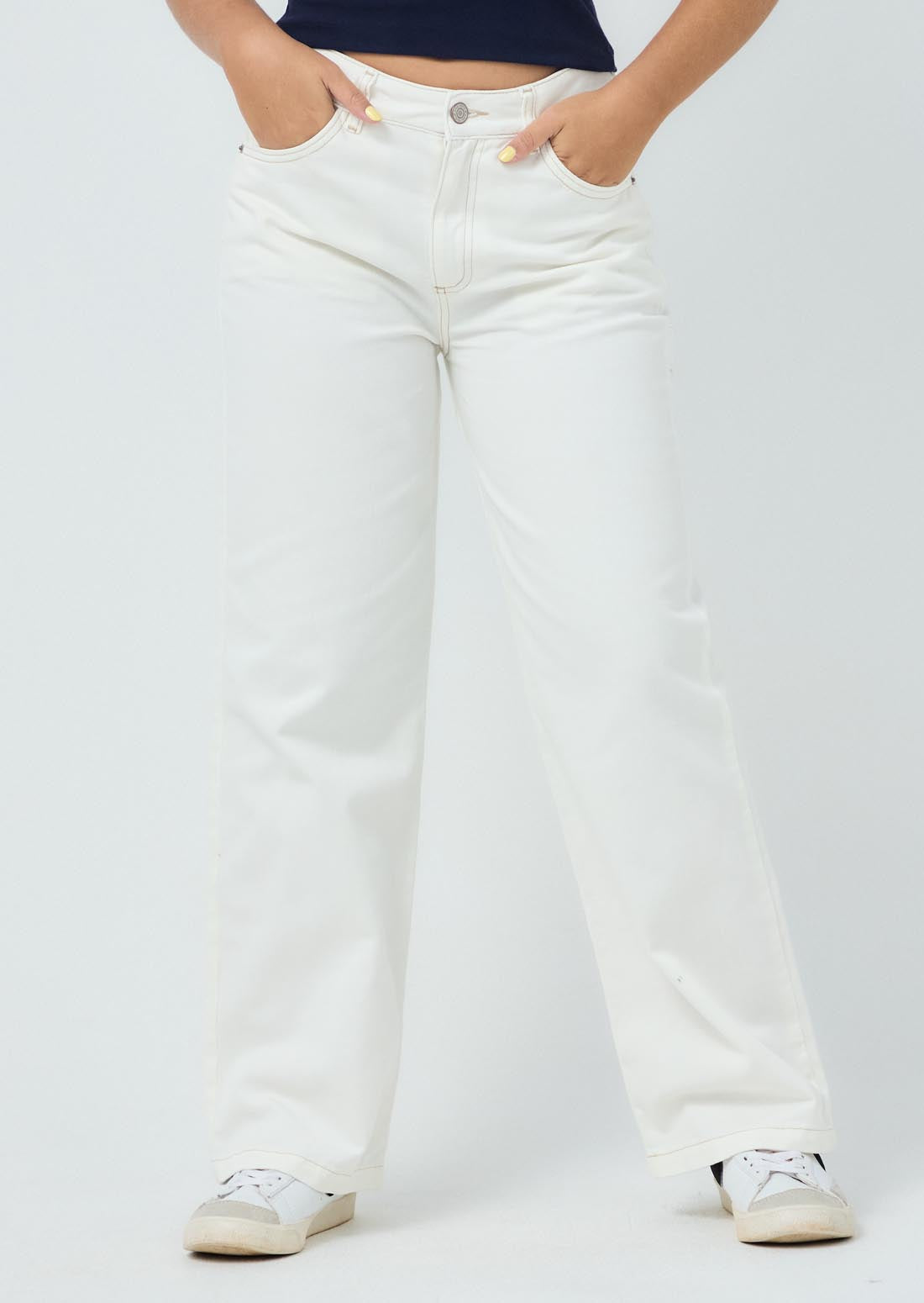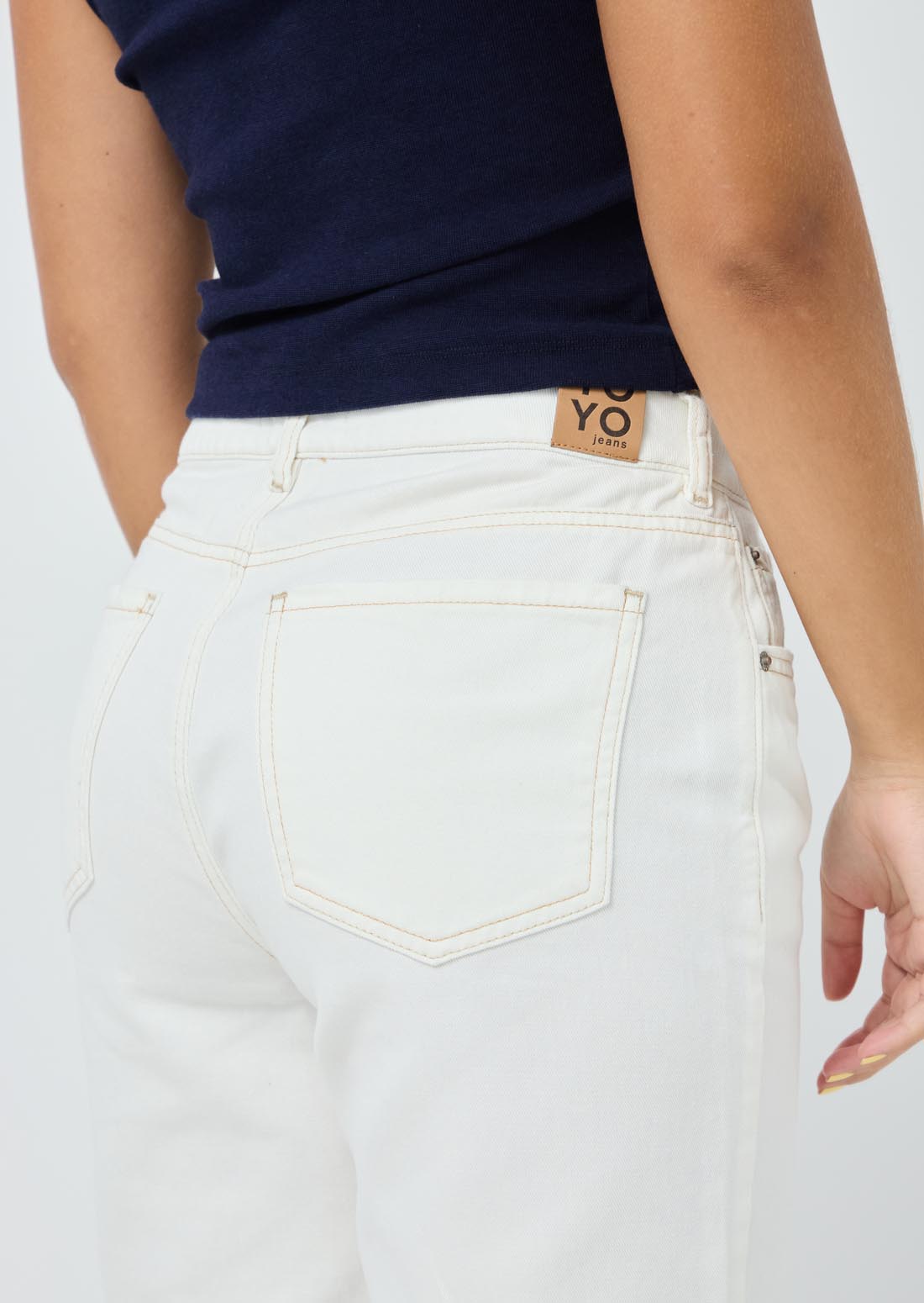 Jean retromom, tiro alto, color marfil, fondo entero y bota recta para jóvenes.