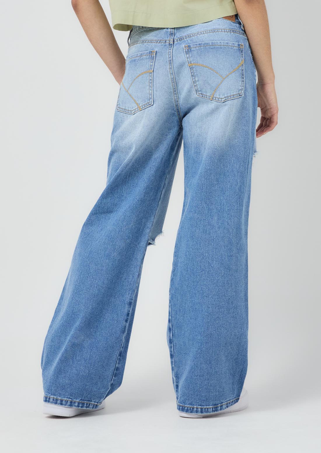 Jean retromom, tiro bajo, lavado medio, fondo entero y en denim para jóvenes.