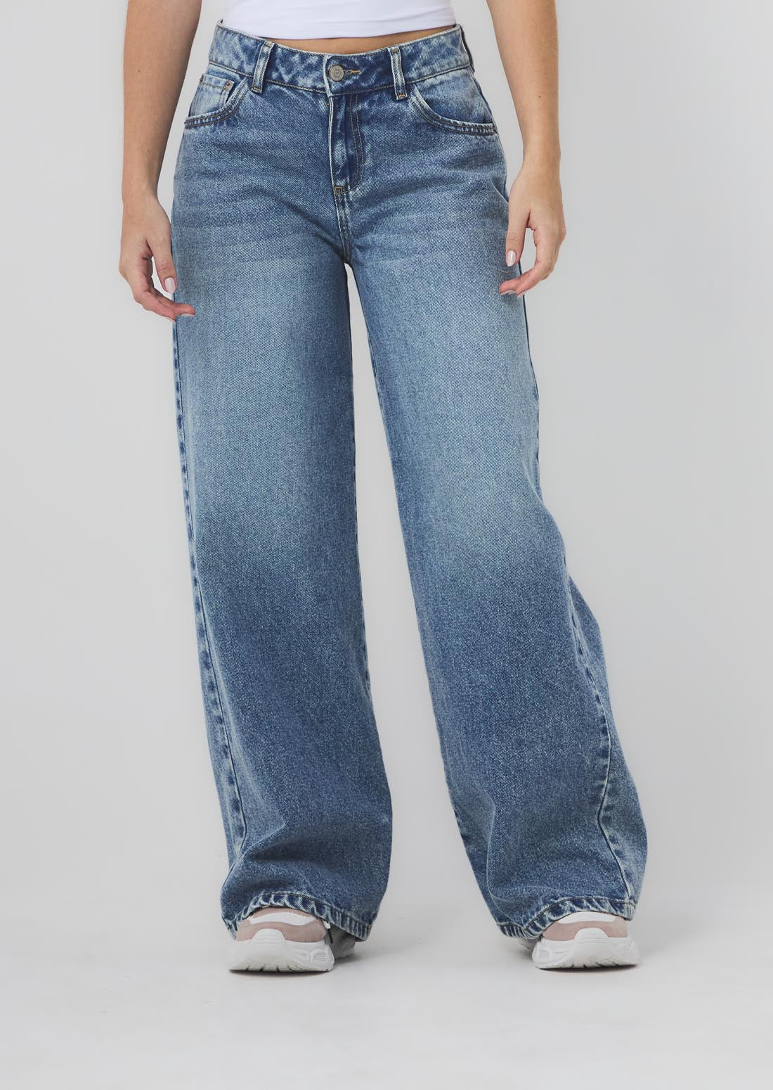 Jean retromom, tiro bajo, lavado medio, fondo entero y bota recta para jóvenes.