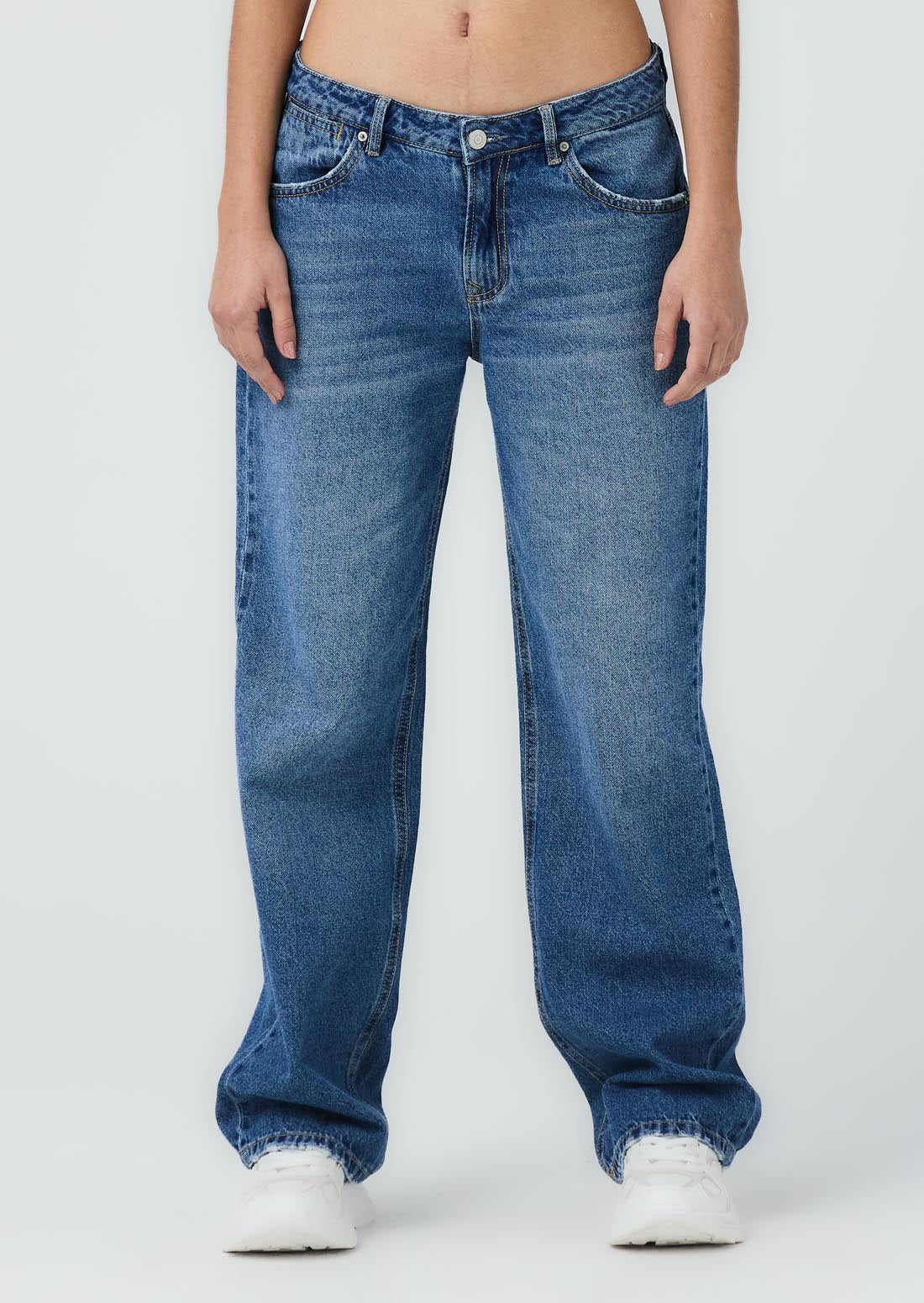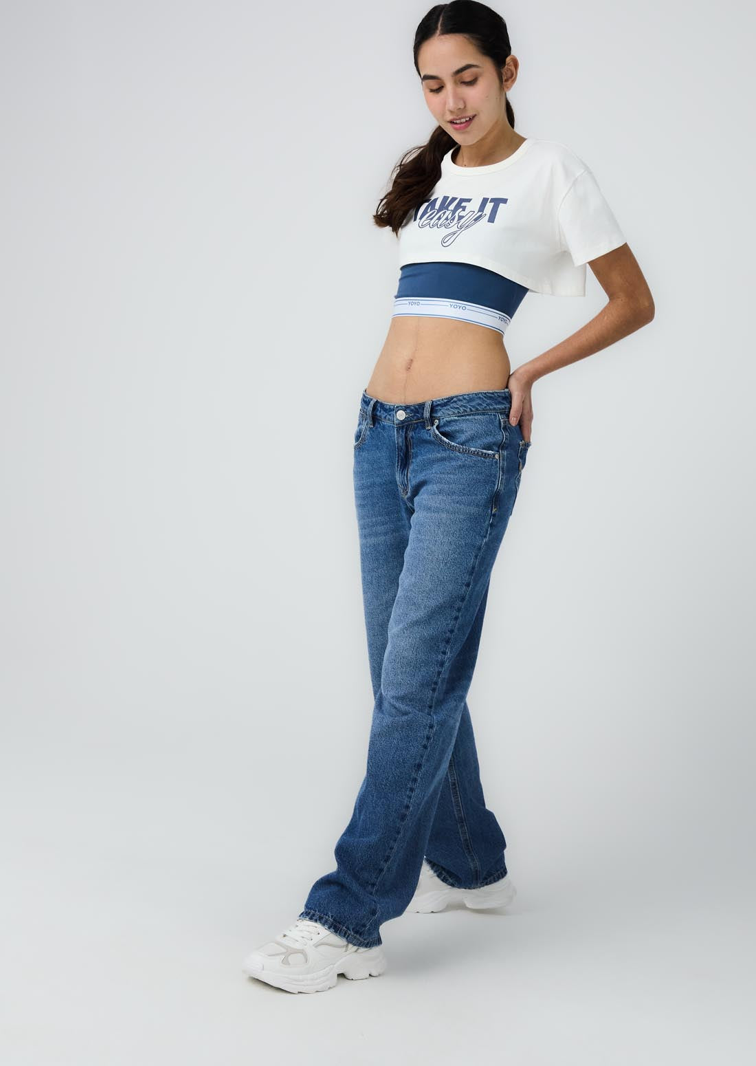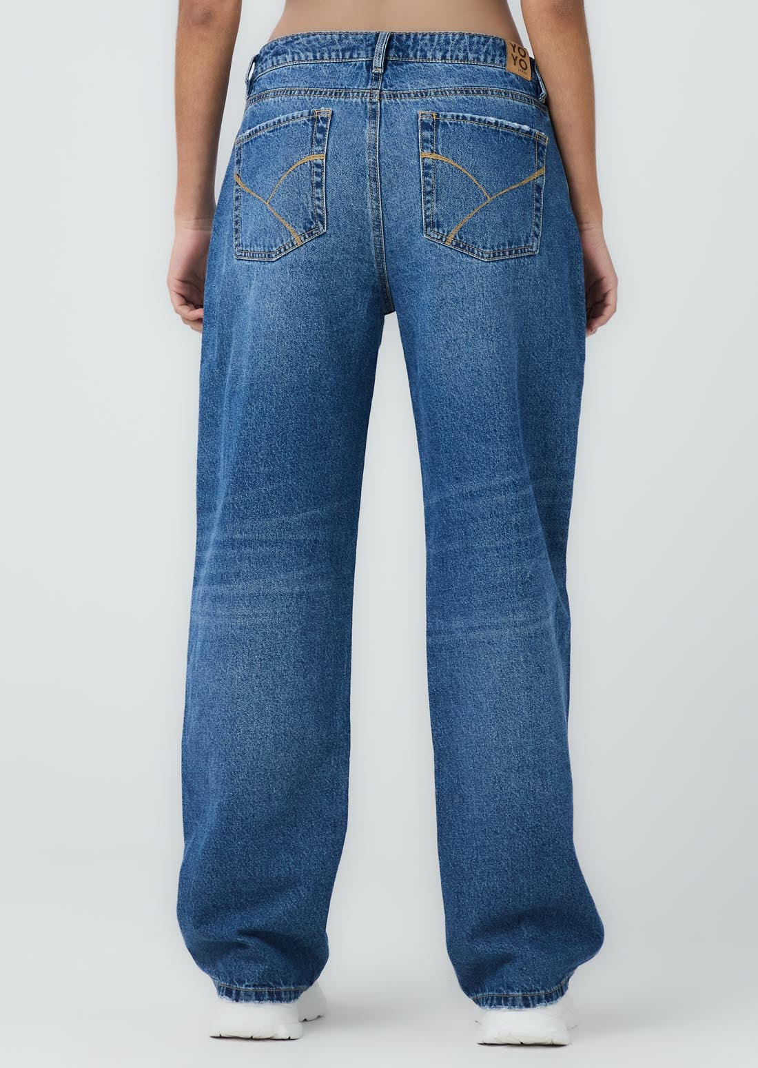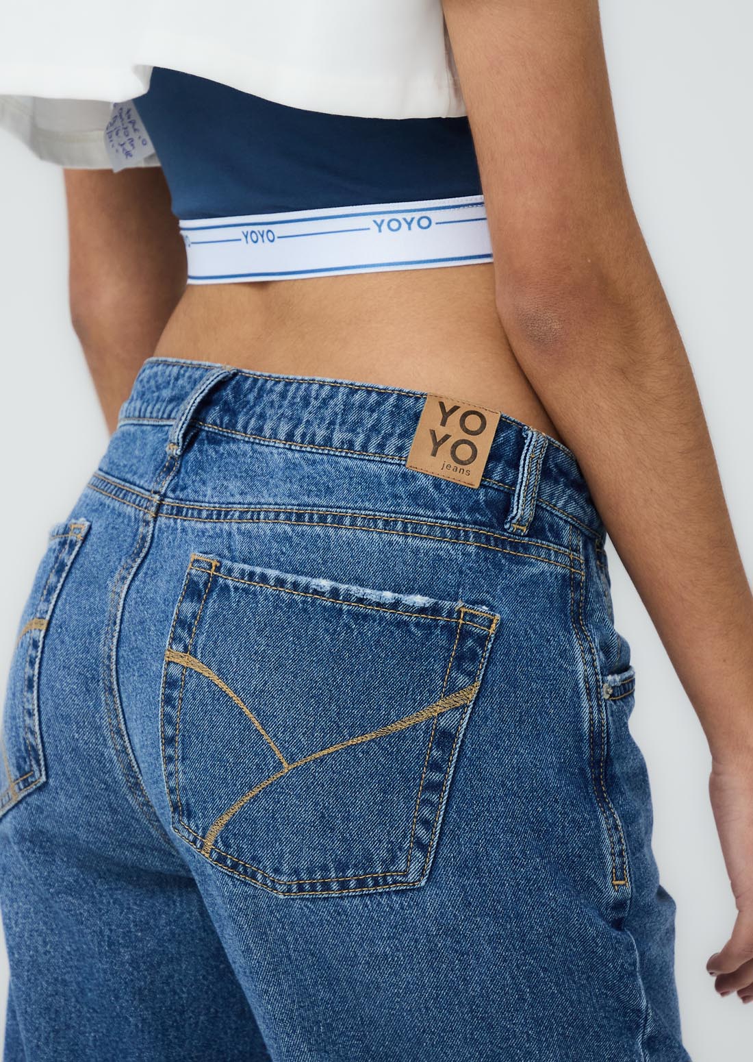 Jean retromom, tiro bajo, lavado medio oscuro, bota recta y fondo entero para jóvenes.