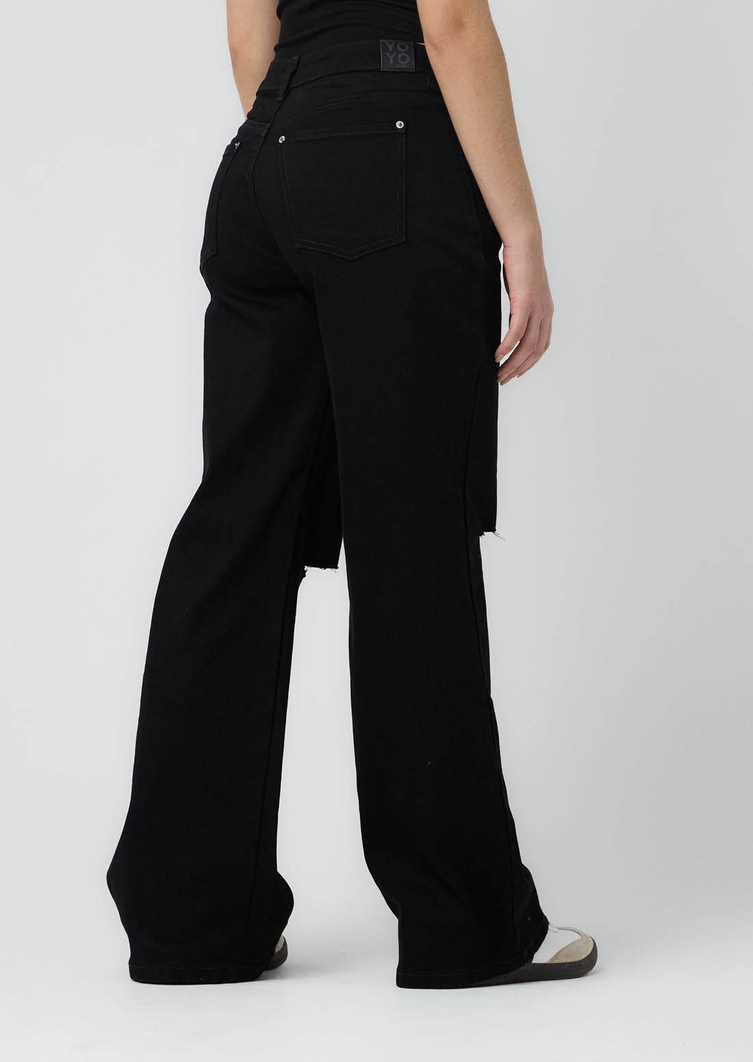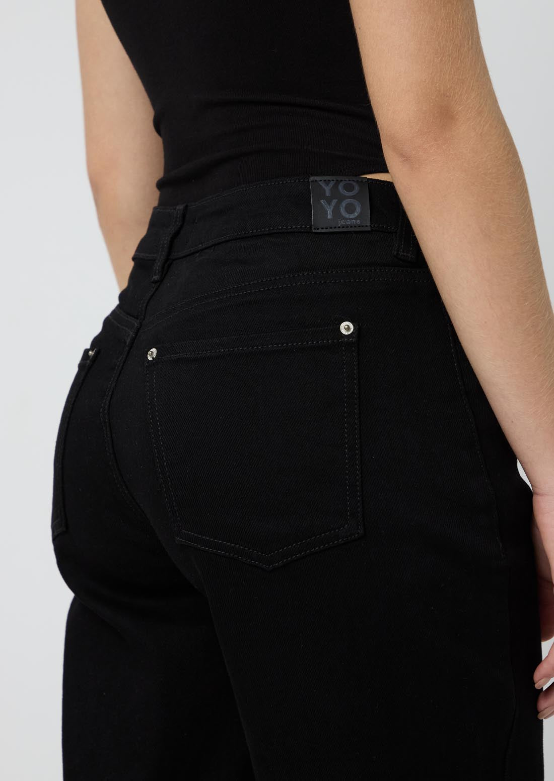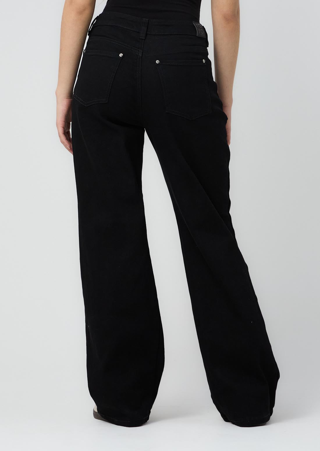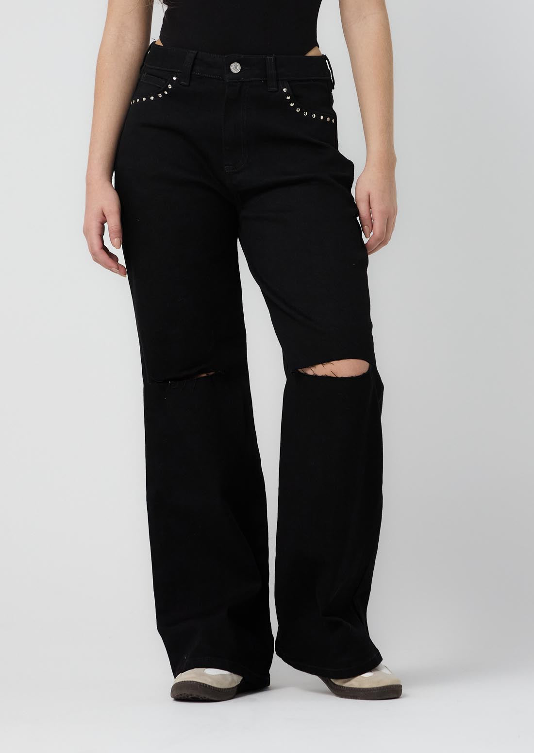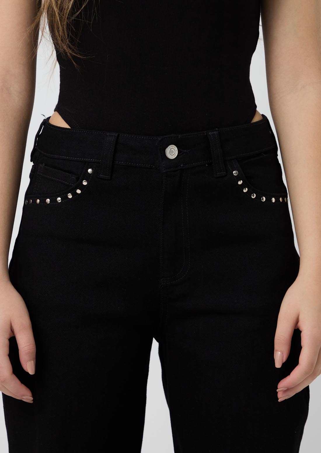 Jean retromom, tiro alto, lavado negro, con taches en bolsillos posteriores y bota recta para jóvenes.
