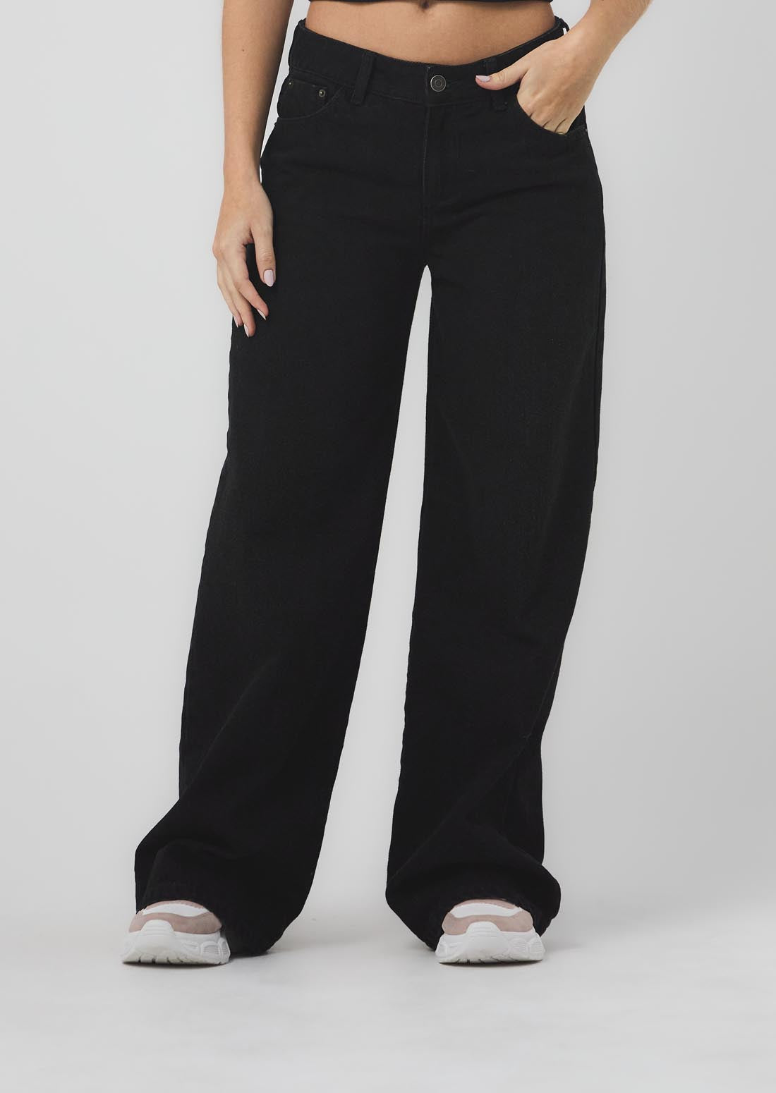 Jean retromom, tiro bajo, lavado negro, fondo entero y bota recta para jóvenes.
