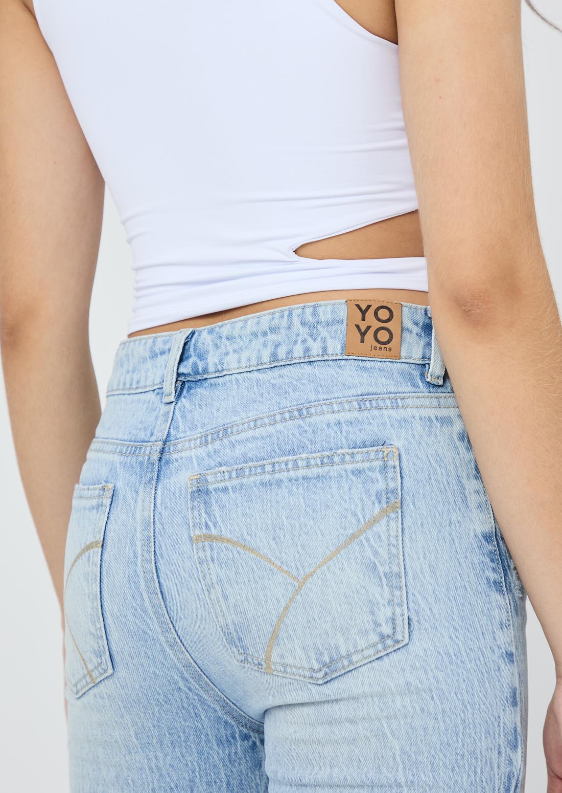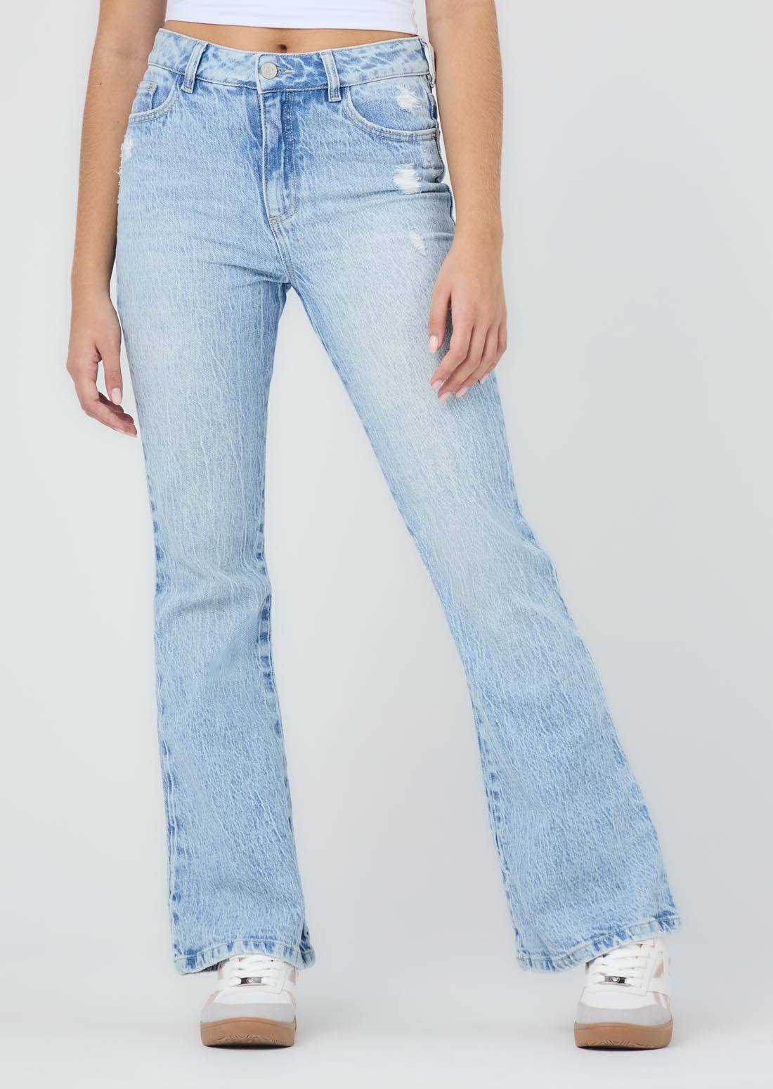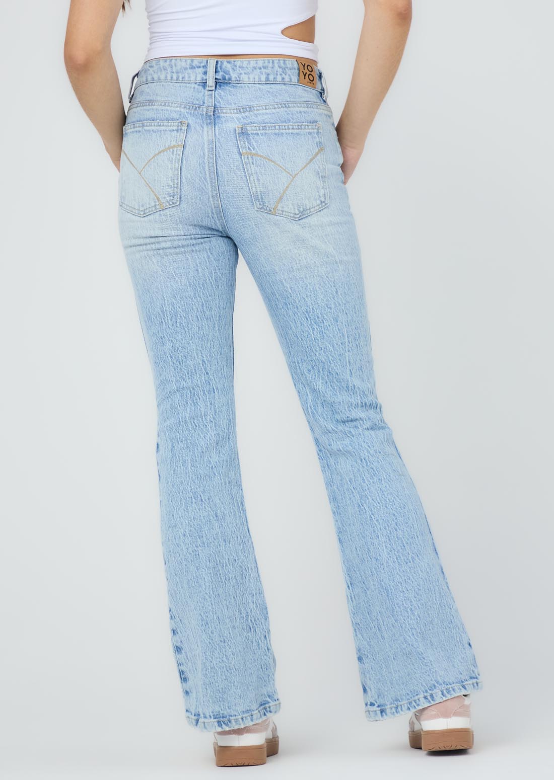 Jean tejano, tiro alto, lavado claro, bolsillos funcionales, bota campana y fondo entero para jóvenes.