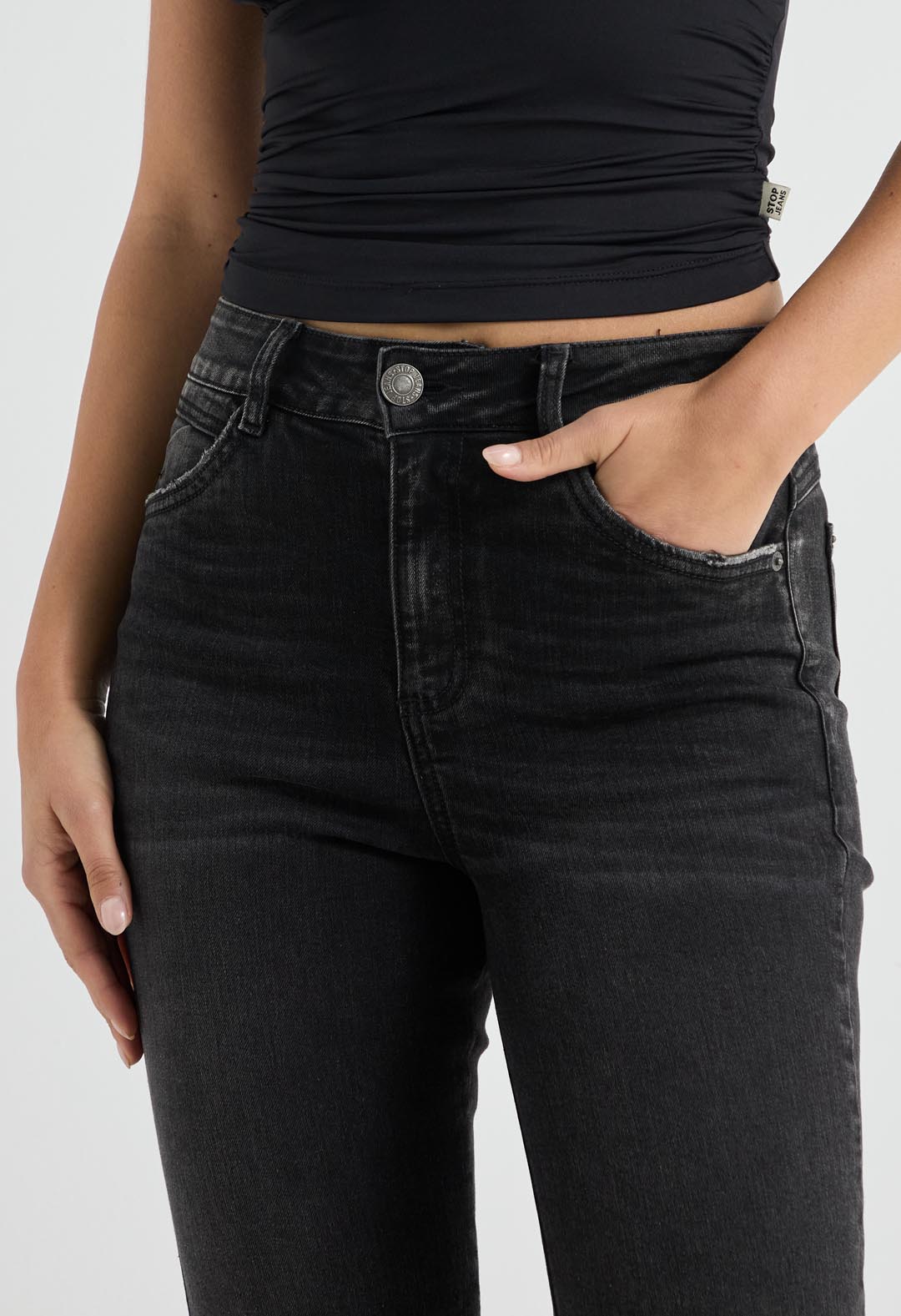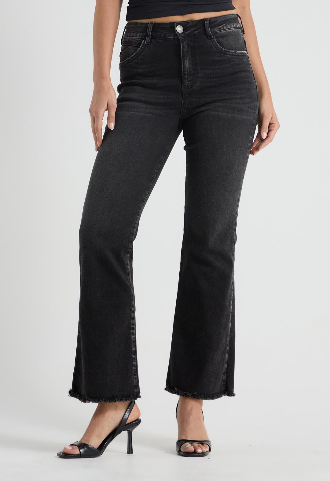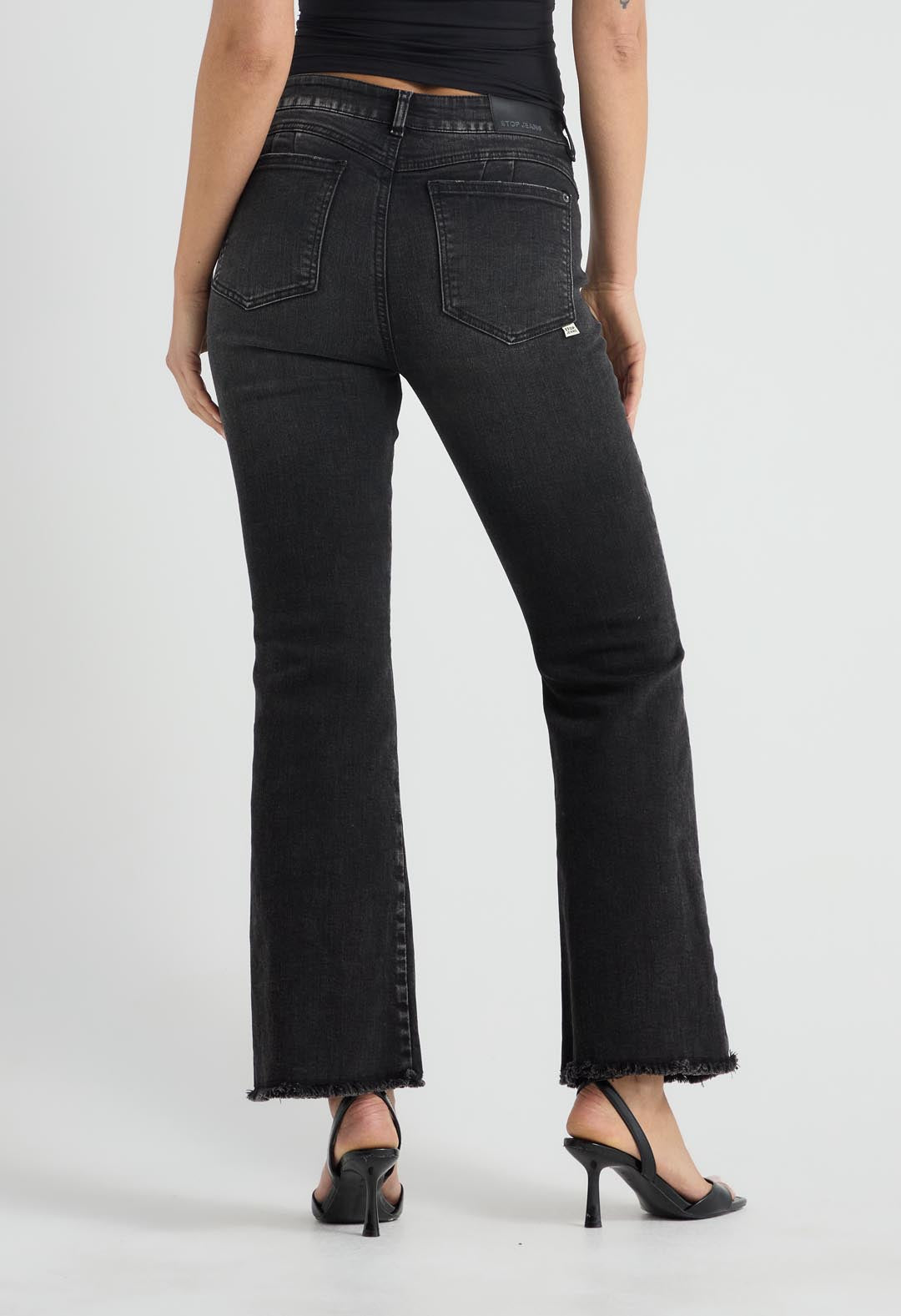 Jean tejano levantacola tiro alto, lavado negro, fondo entero y bota campana para mujer.