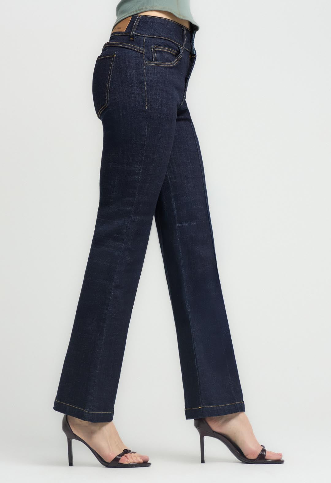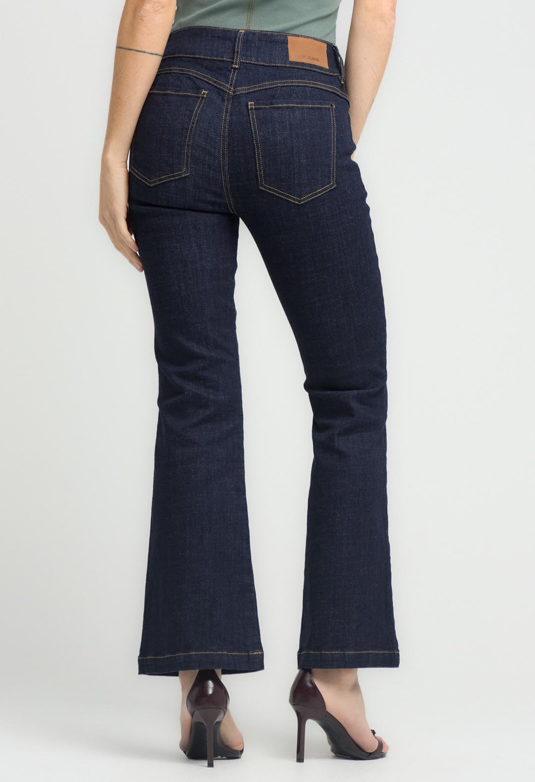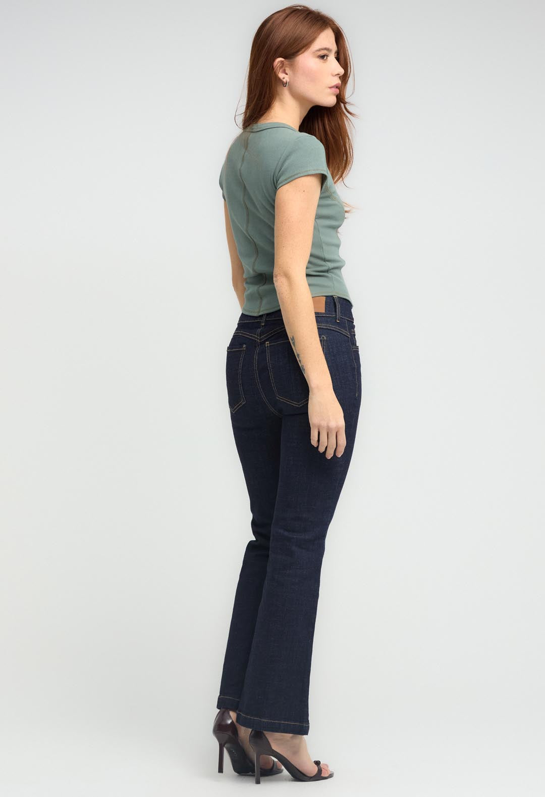Jean tejano, tiro medio, lavado oscuro, corte en frente, bolsillos funcionales, fondo entero y bota campana para mujeres.