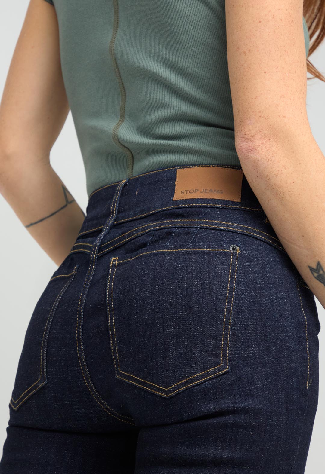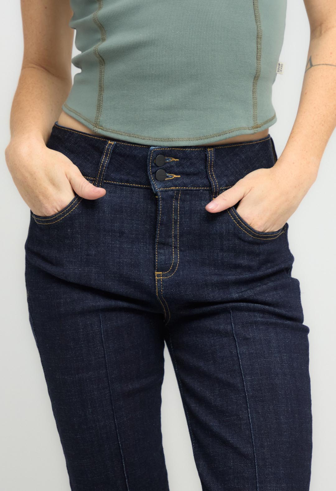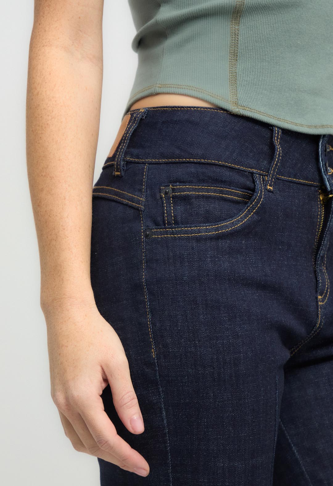 Jean tejano, tiro medio, lavado oscuro, corte en frente, bolsillos funcionales, fondo entero y bota campana para mujeres.