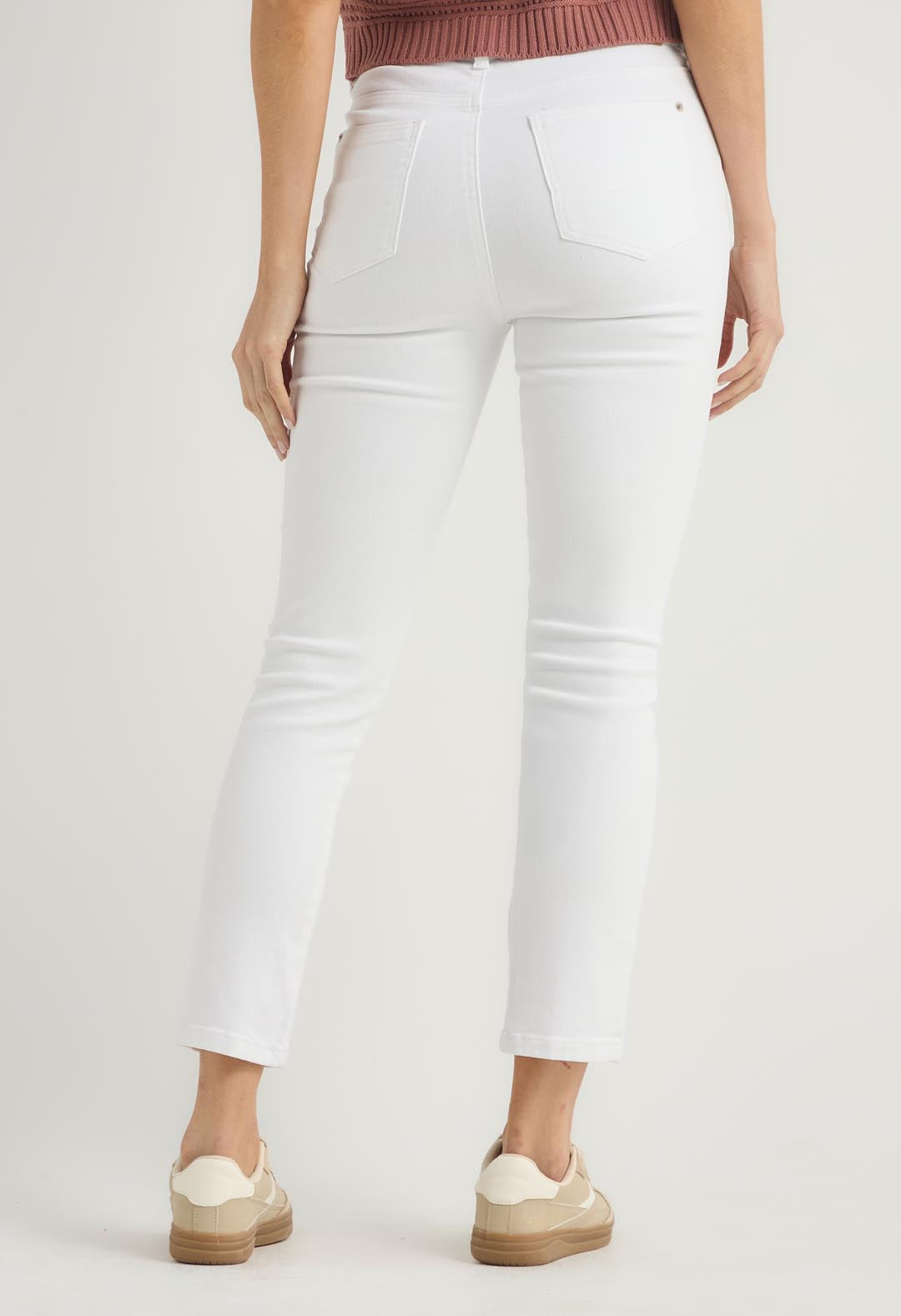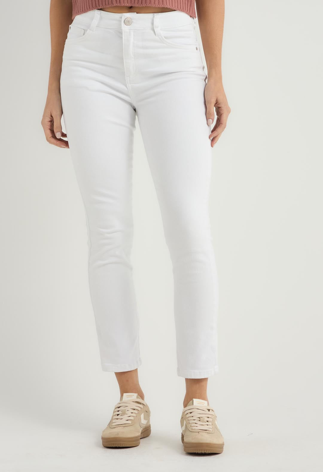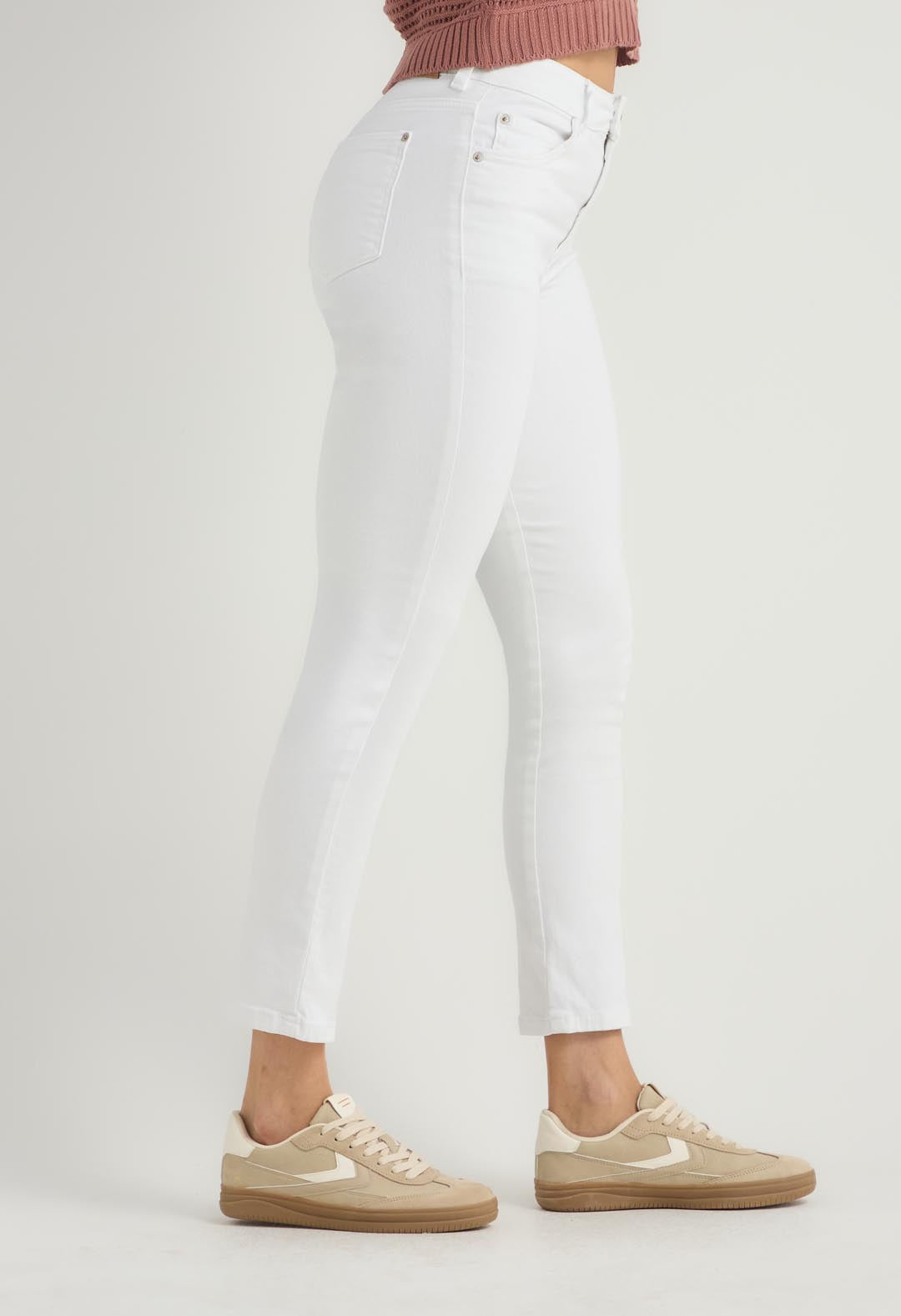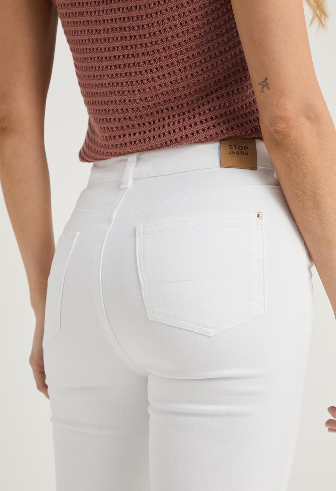 Jean vaquero, tiro alto, color blanco, bolsillos funcionales, fondo entero y bota tubo para mujeres.