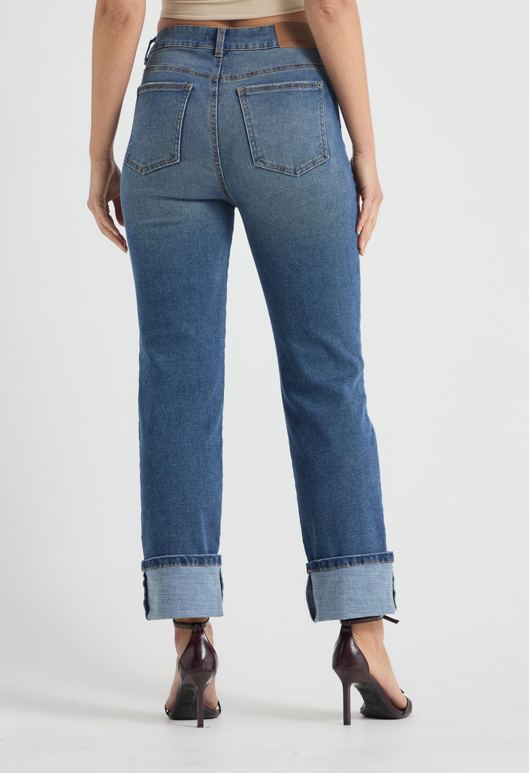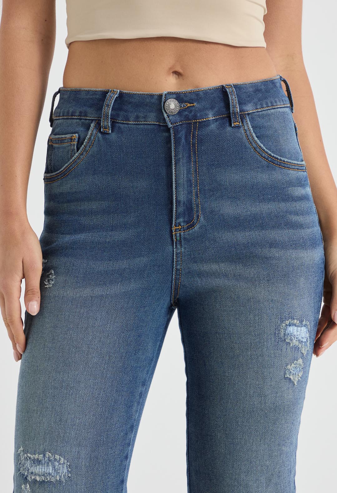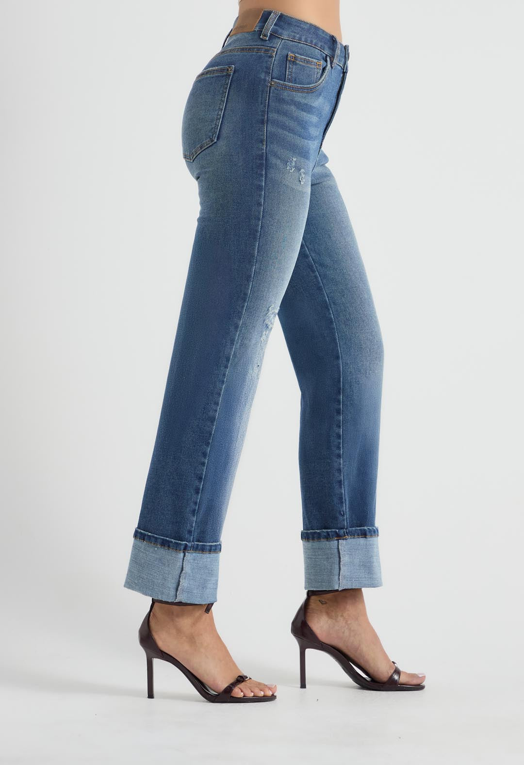 Jean vaquero, tiro alto, lavado medio, bota recta y fondo entero para mujer.
