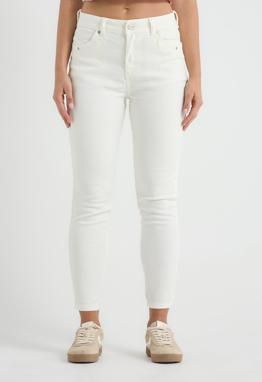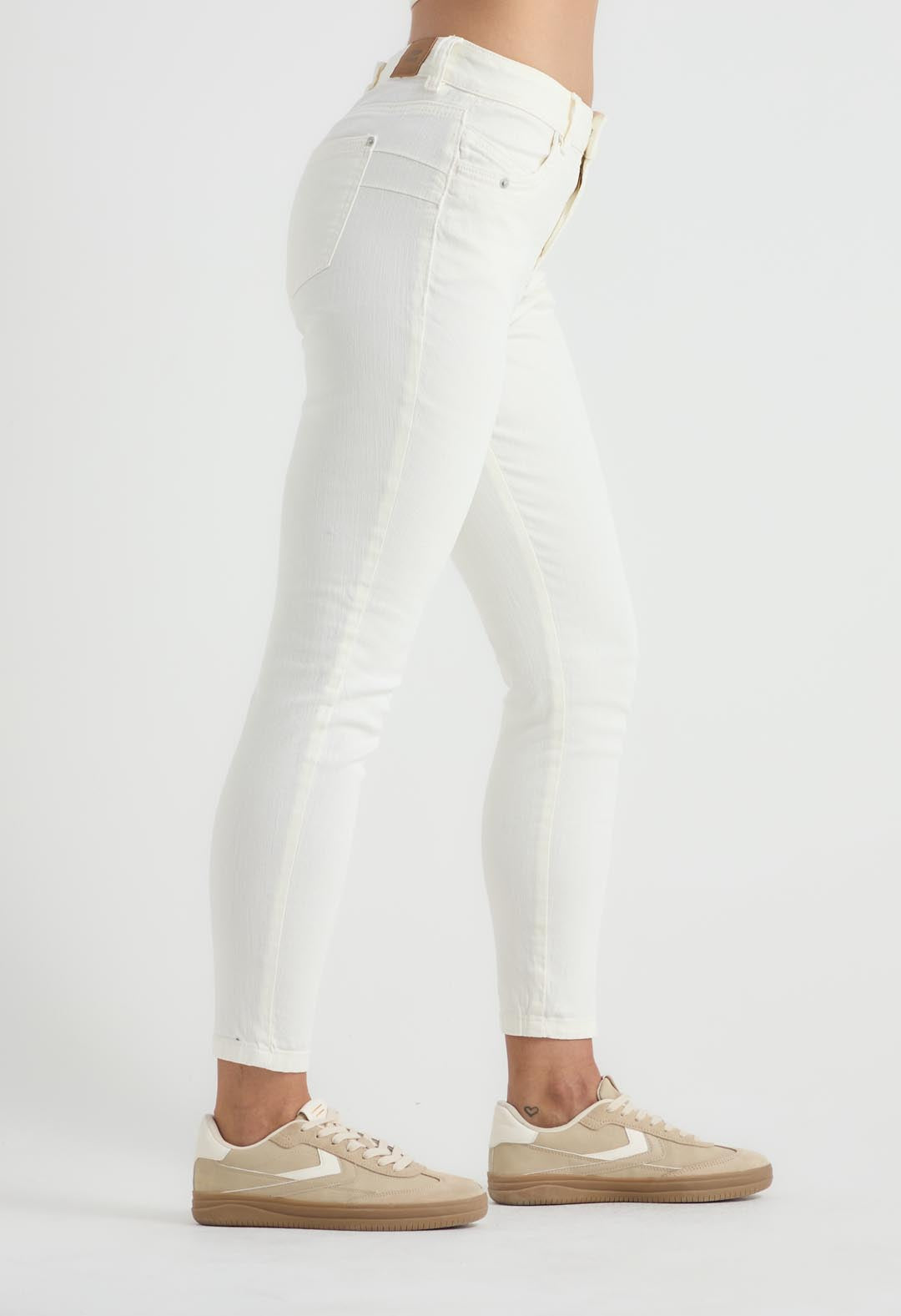 Jean vaquero, tiro alto, color marfil, bolsillos funcionales, fondo entero y tobillero para mujeres.