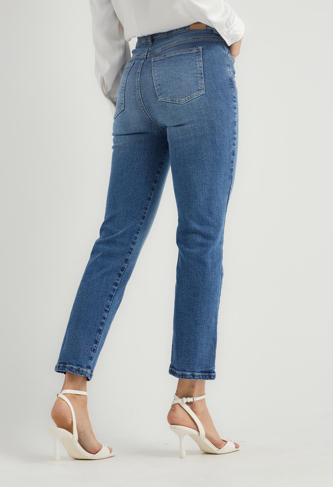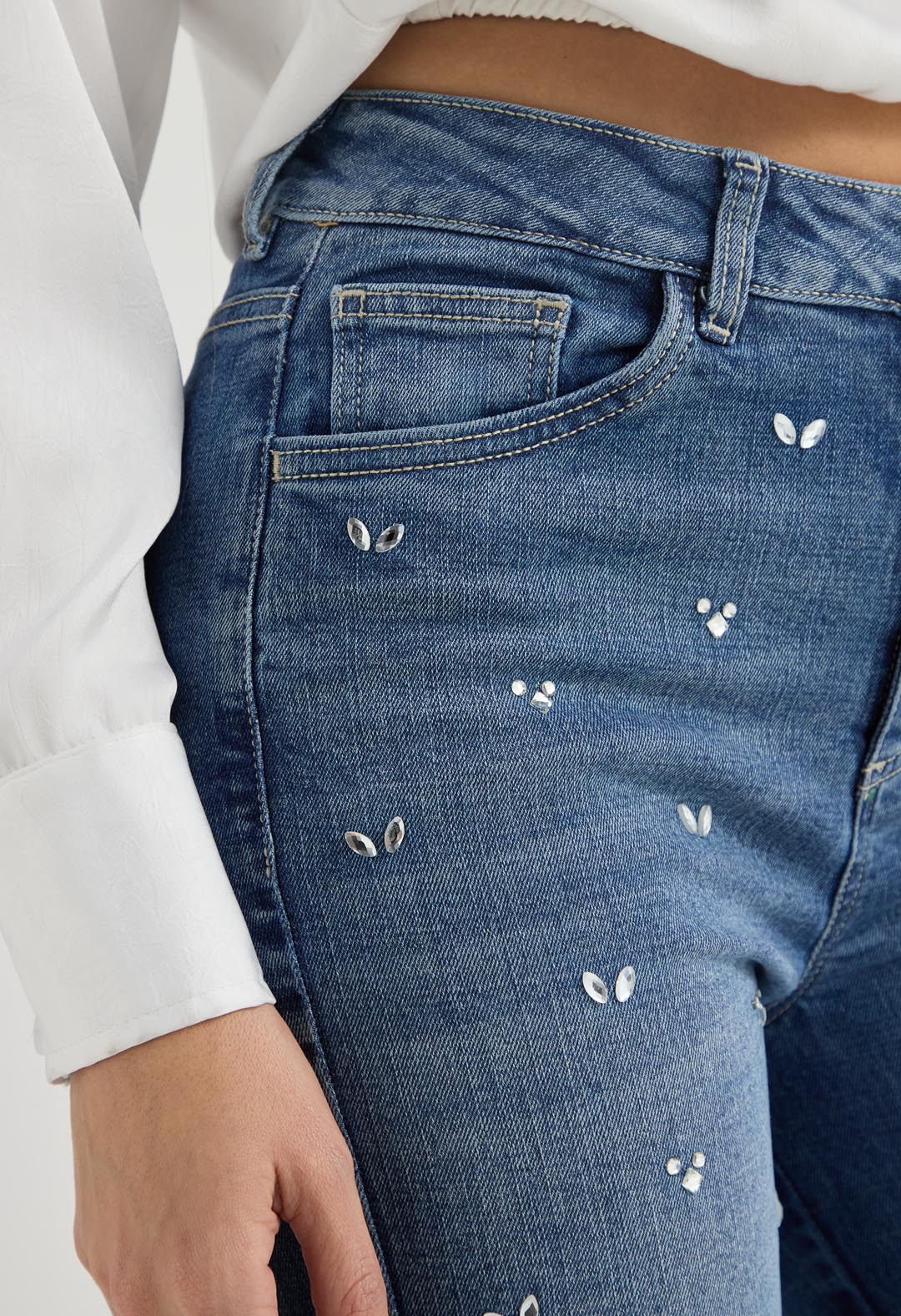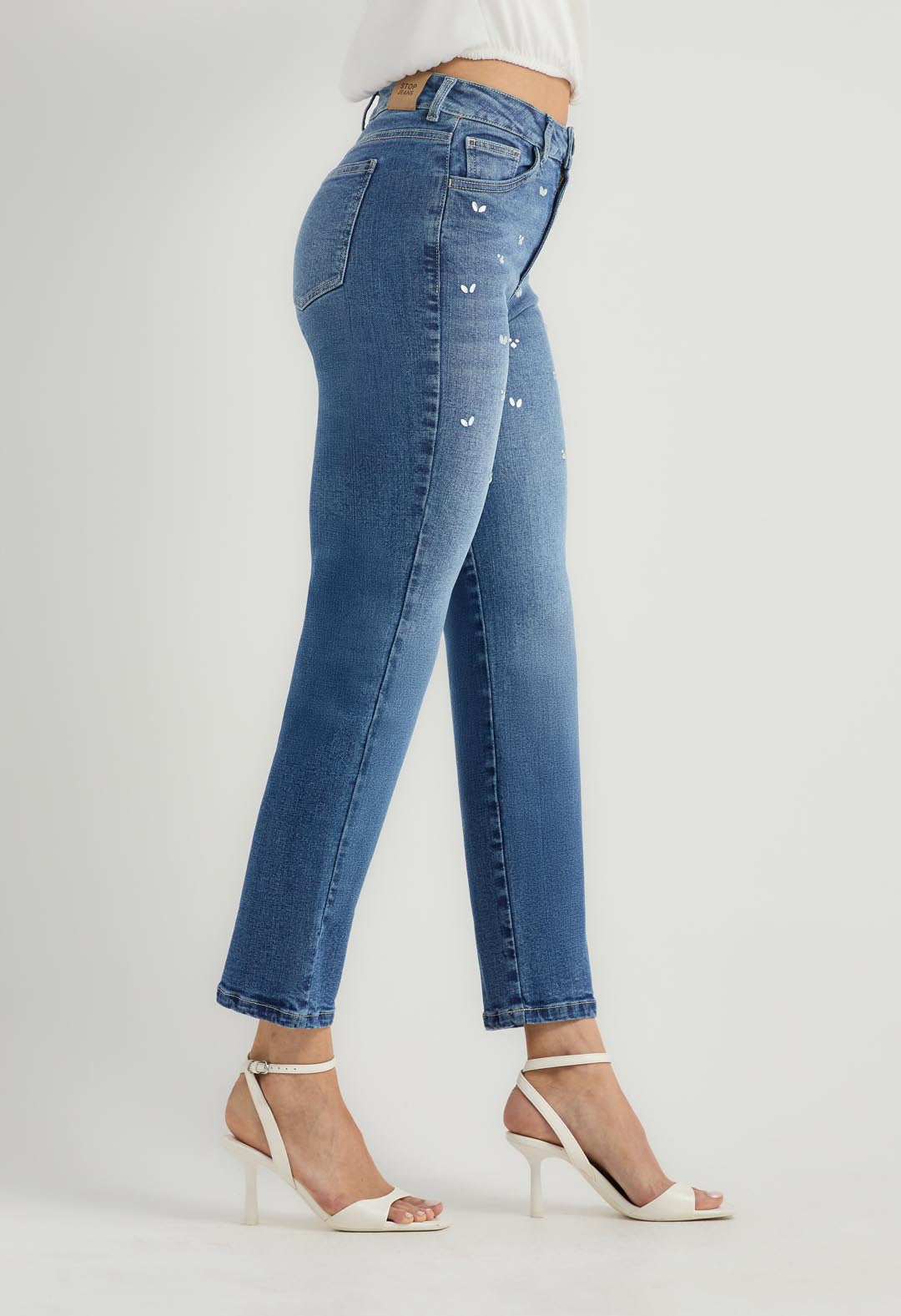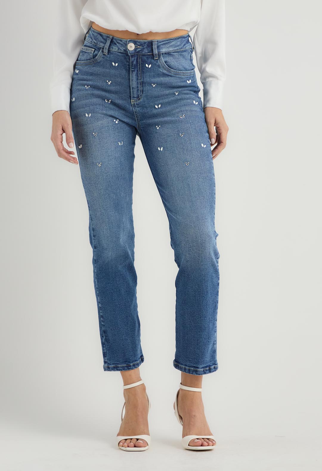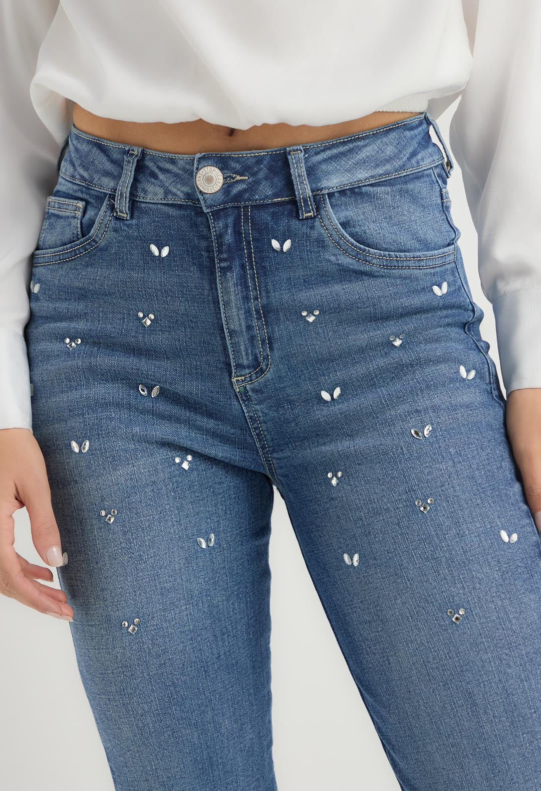 Jean vaquero, tiro alto, lavado medio y con apliques para mujer.