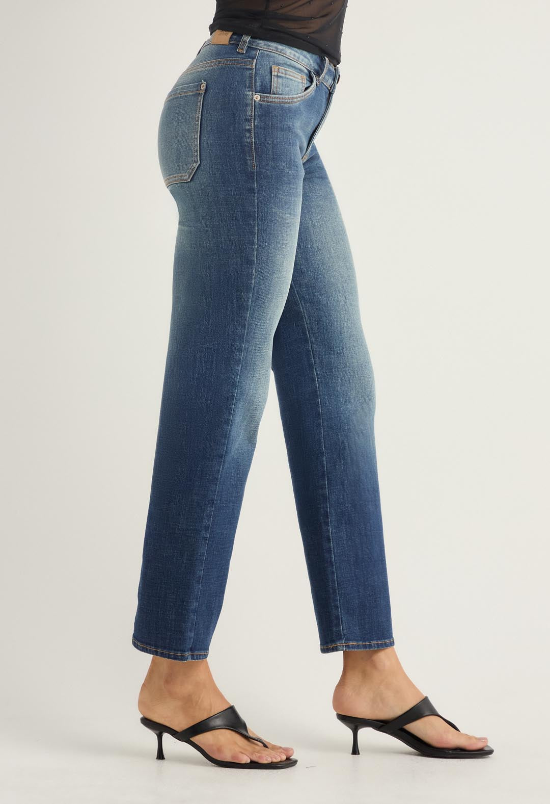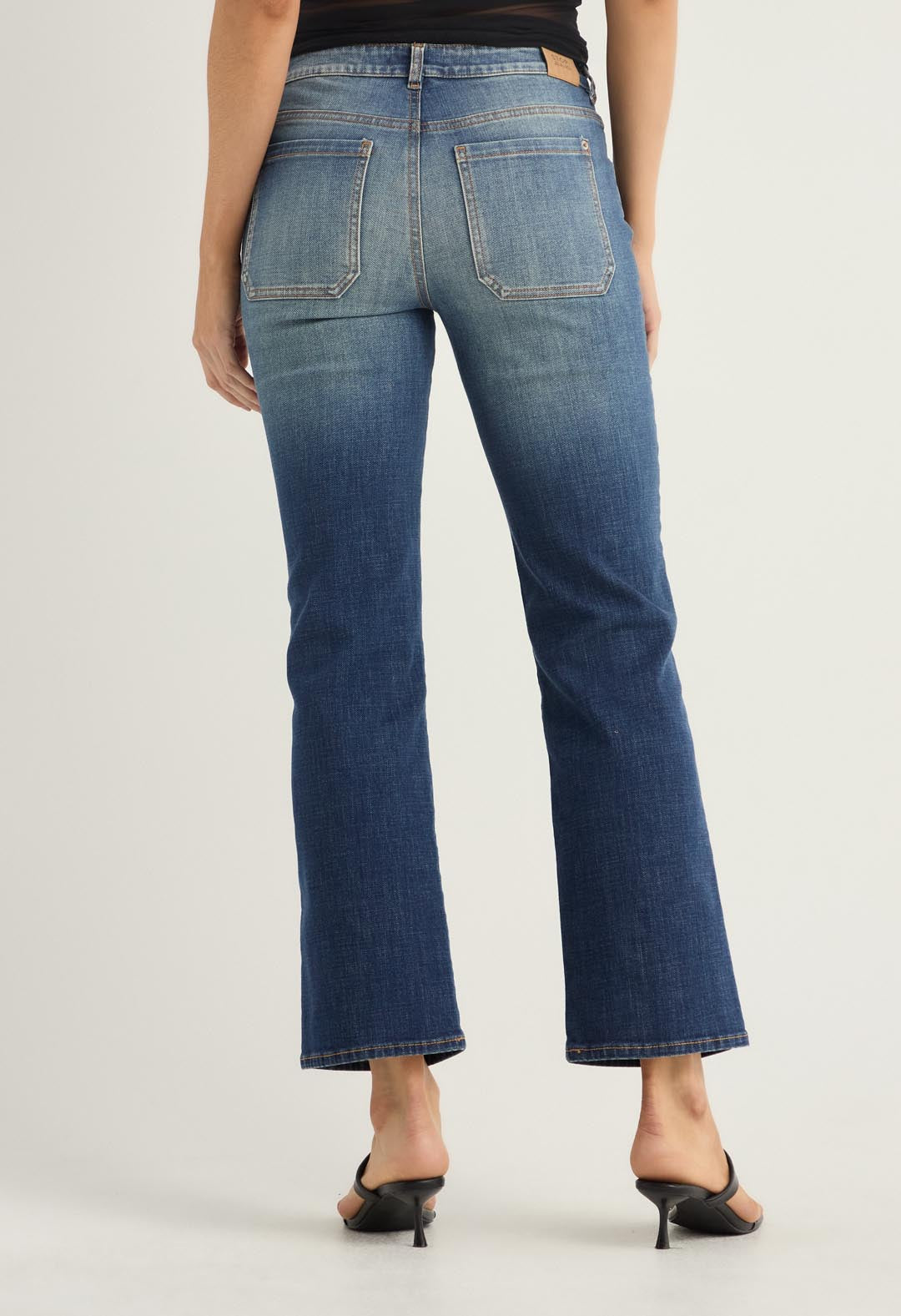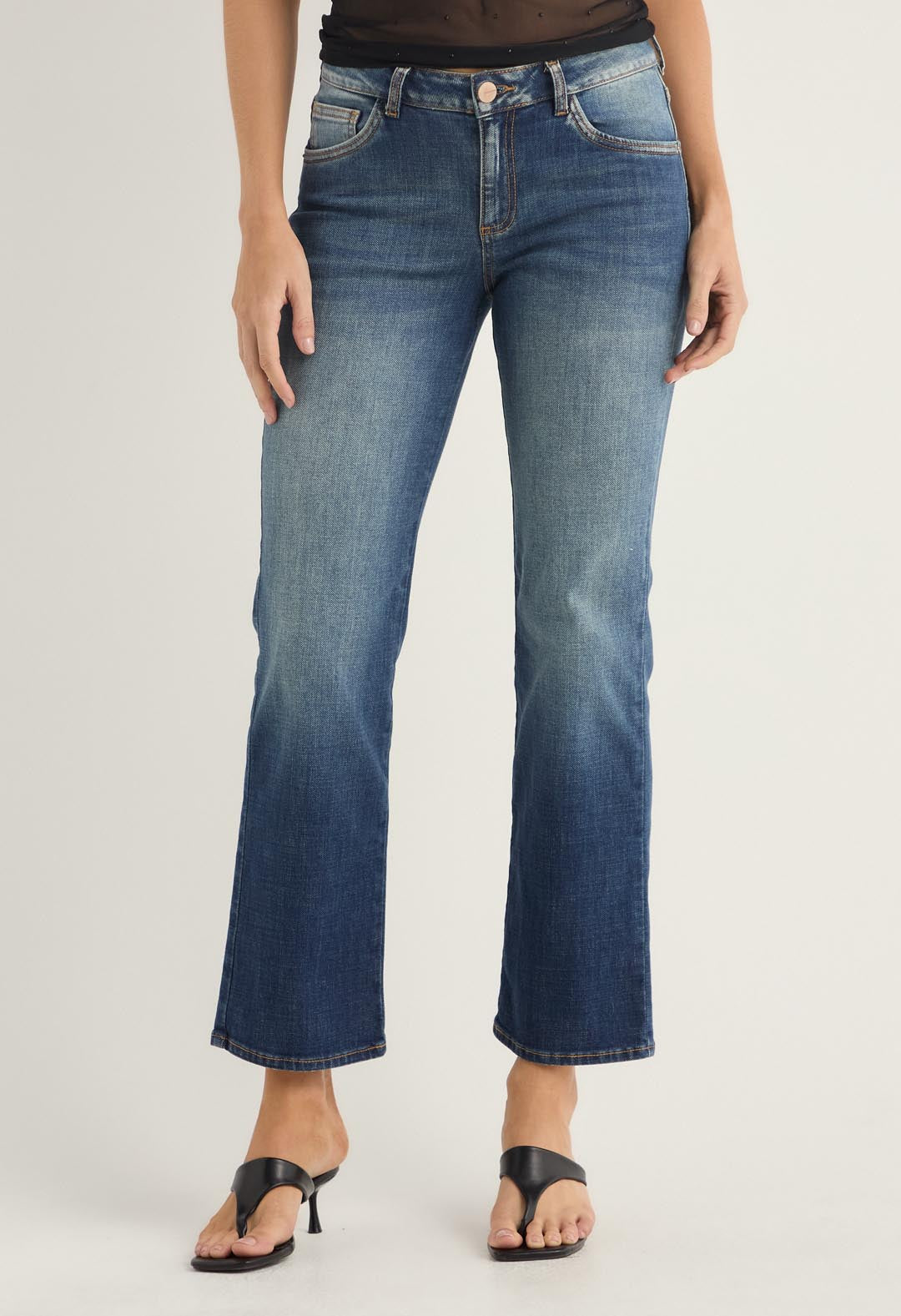 Jean vaquero, tiro bajo, lavado medio, bota recta y fondo entero para mujer.