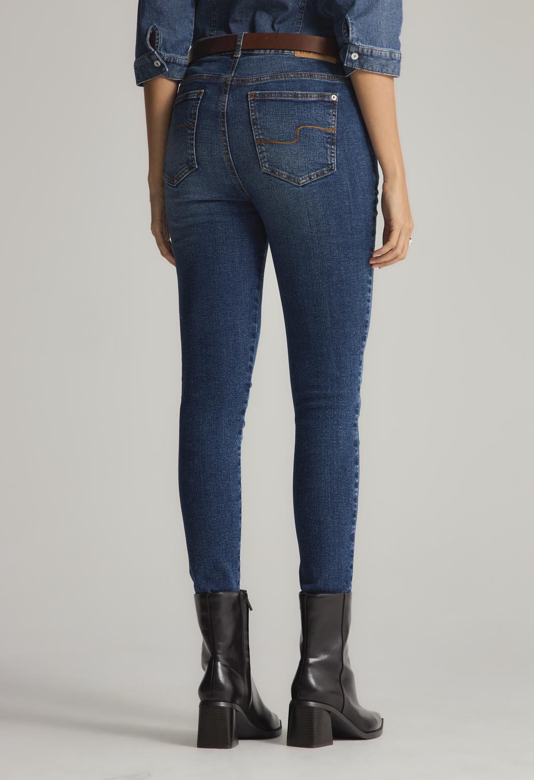 Jean vaquero, tiro alto, lavado medio oscuro, bota tubo y fondo entero para mujer.